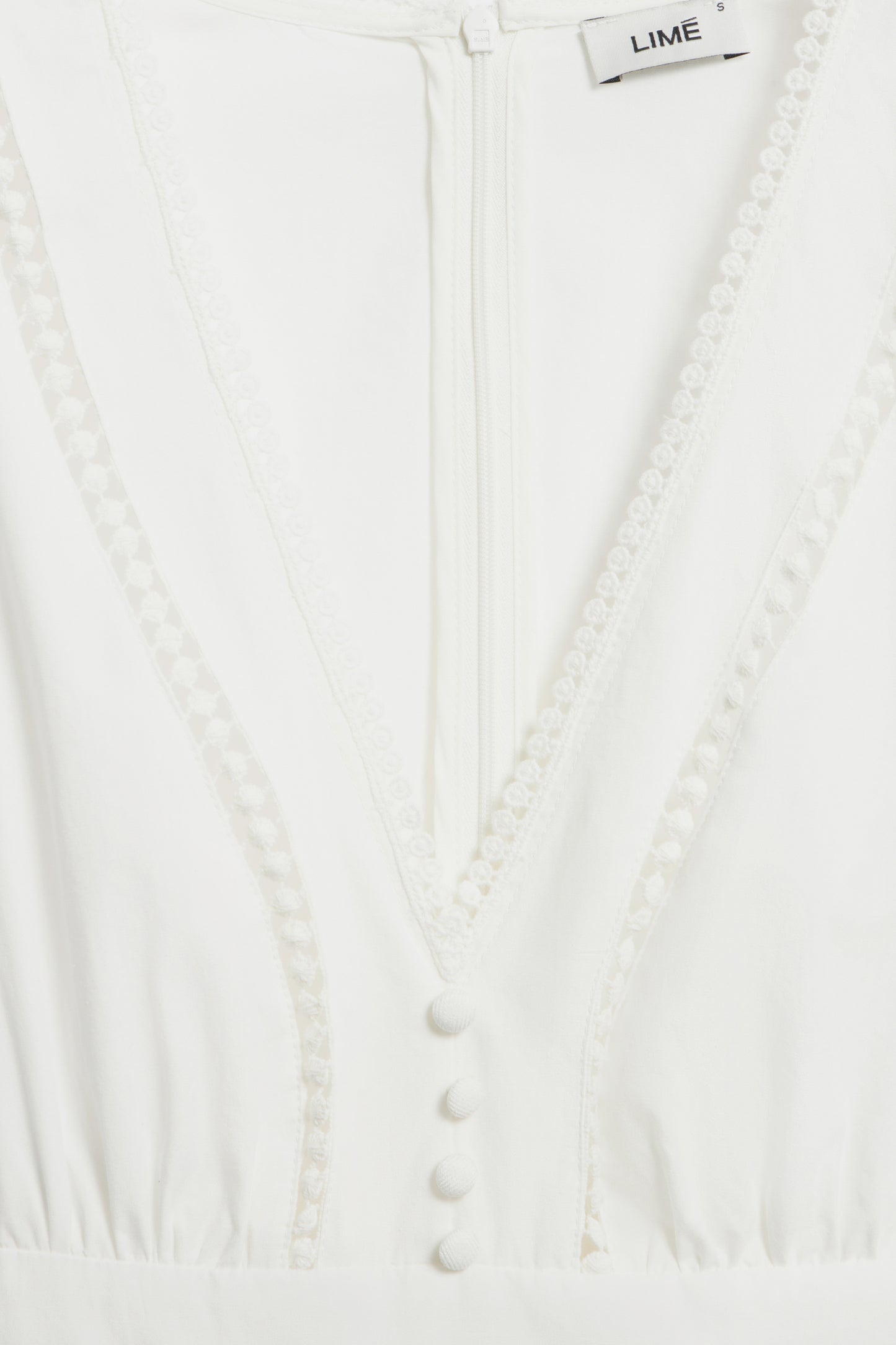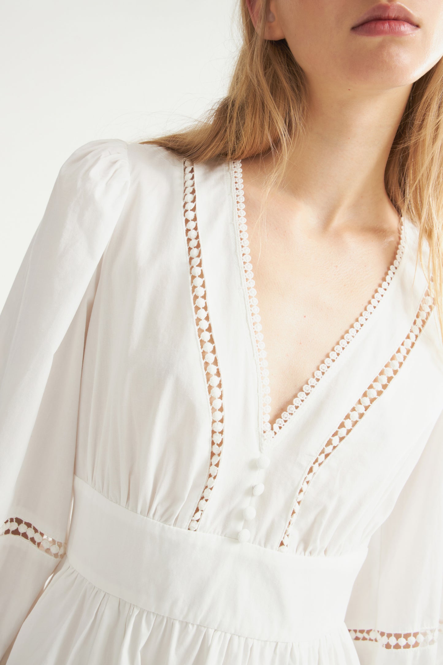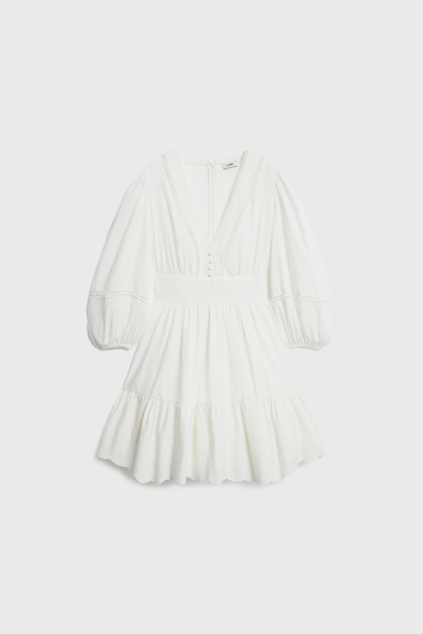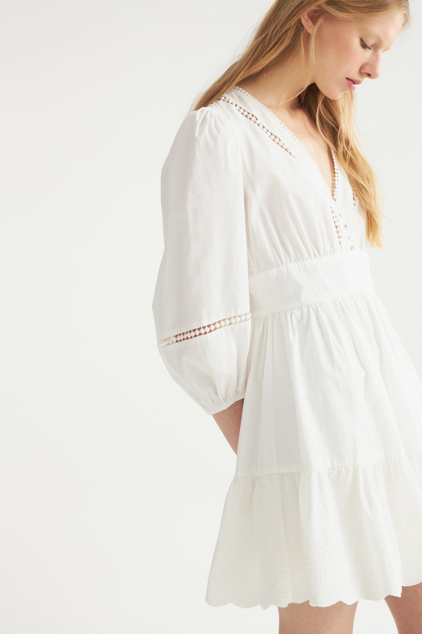 Short, flared dress in soft cotton weave. Featuring lace insets and embroidered scalloped hem. Fitted bodice with covered buttons, a concealed zip at the back, matching lining, and below-the-elbow puff sleeves.