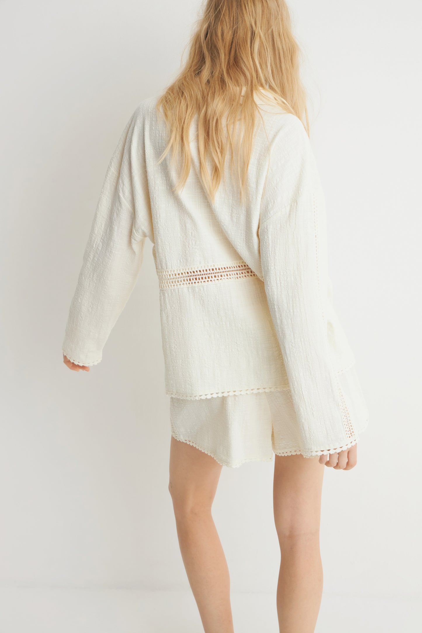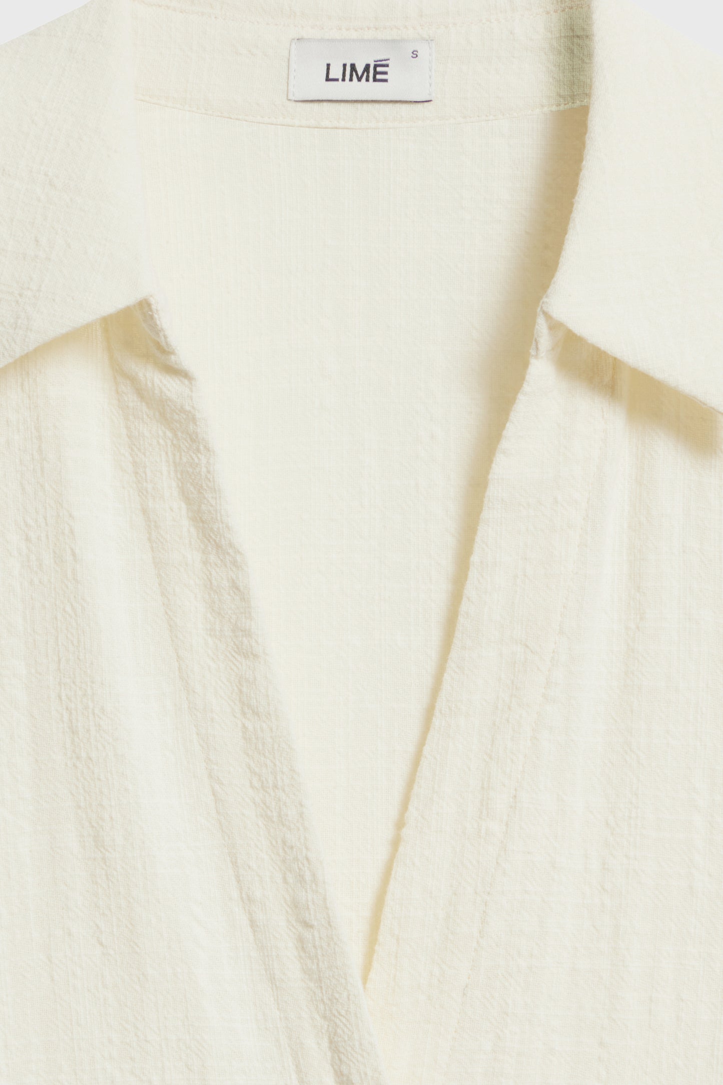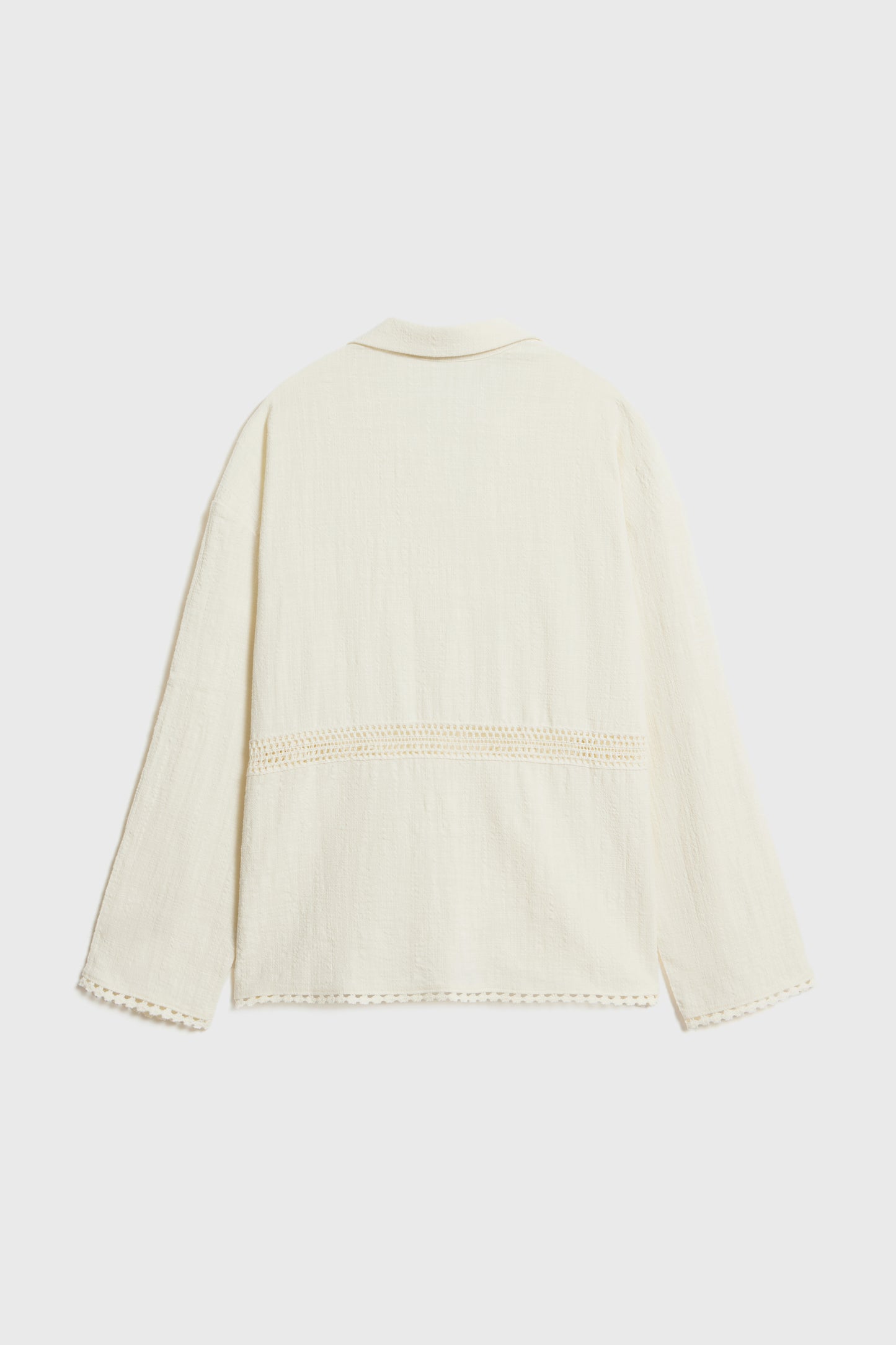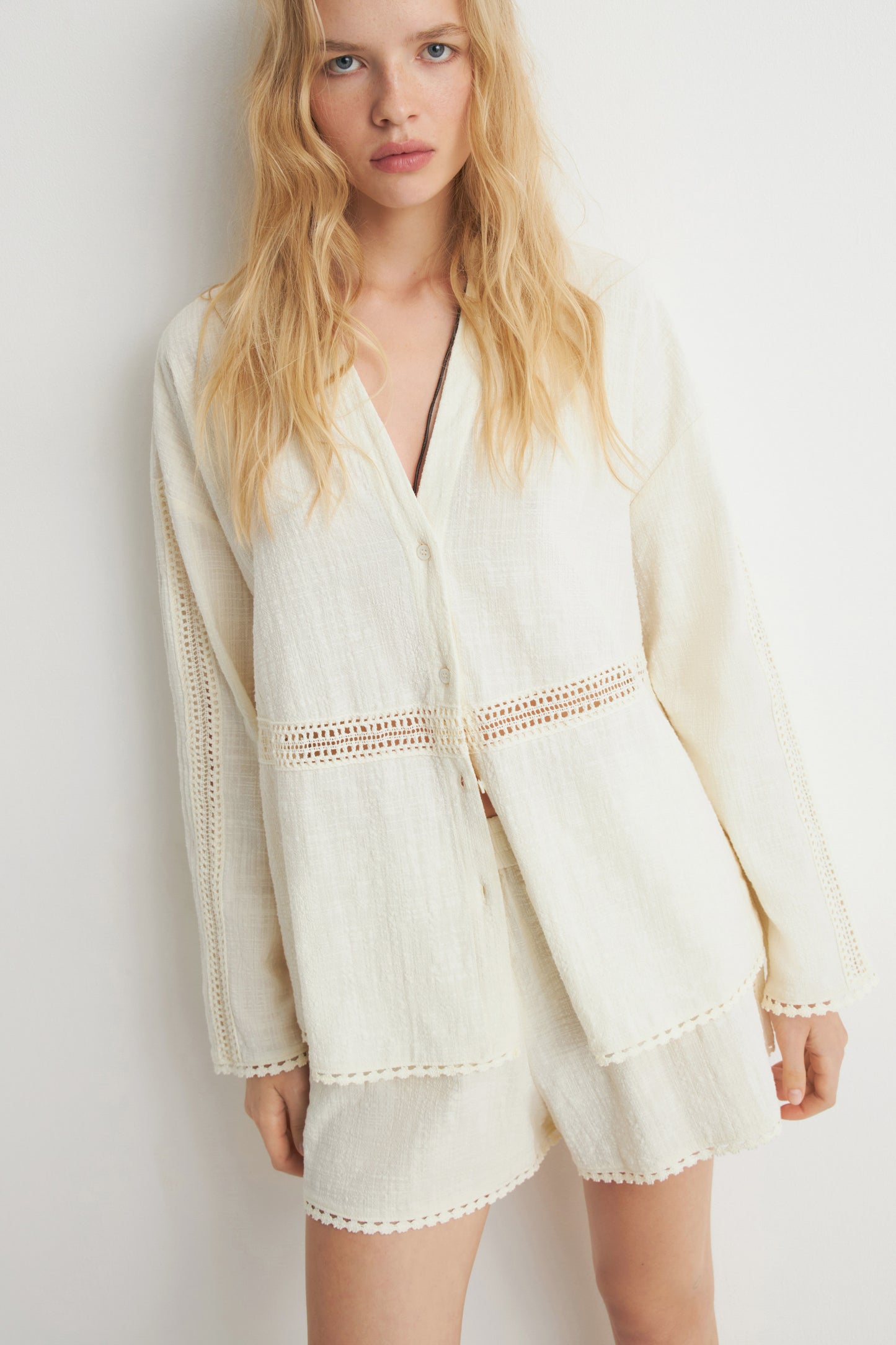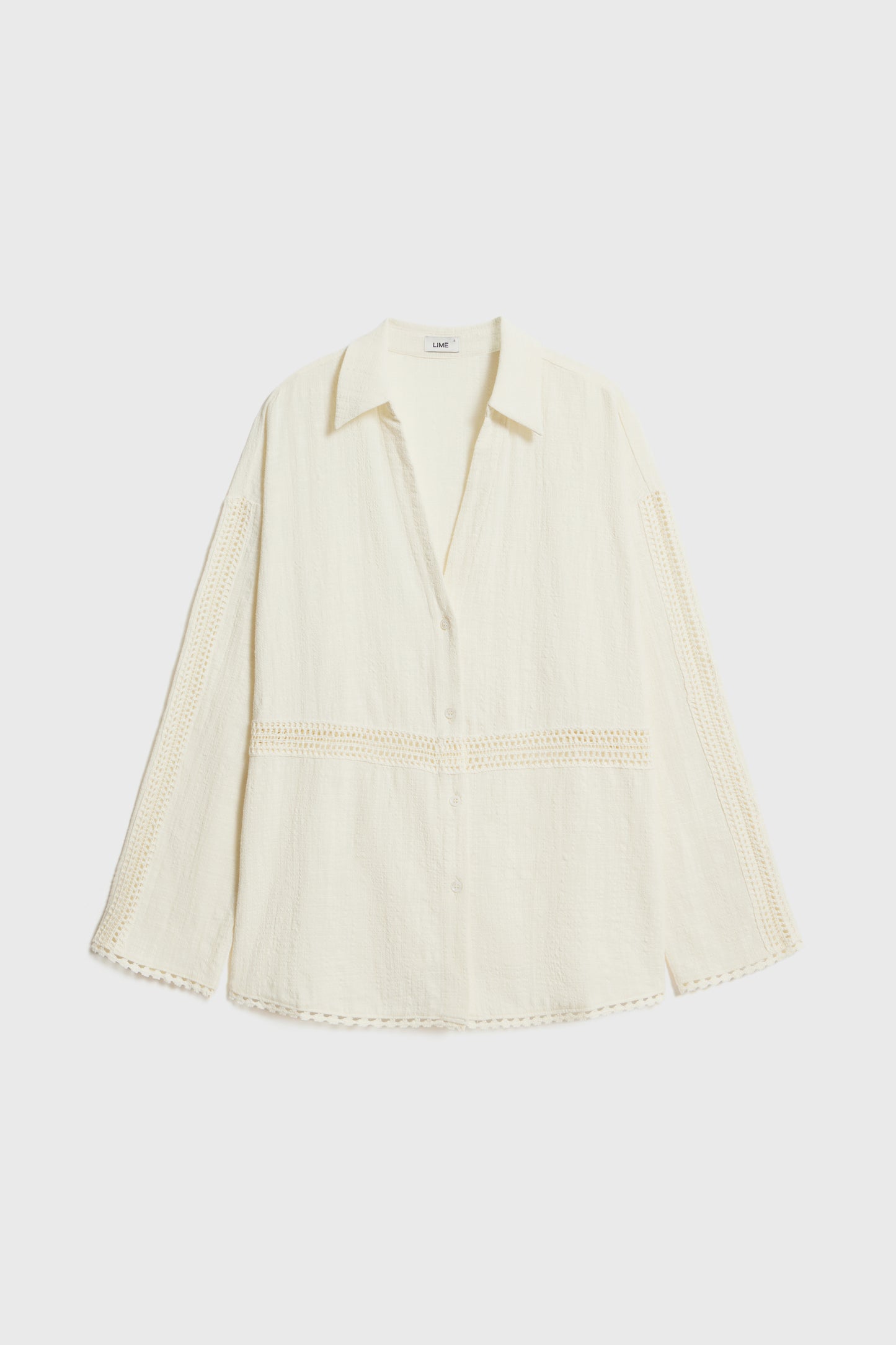 Shirt in woven cotton crêpe. V-shaped neckline, collar, long sleeves and lace trims. Front closure with buttons.