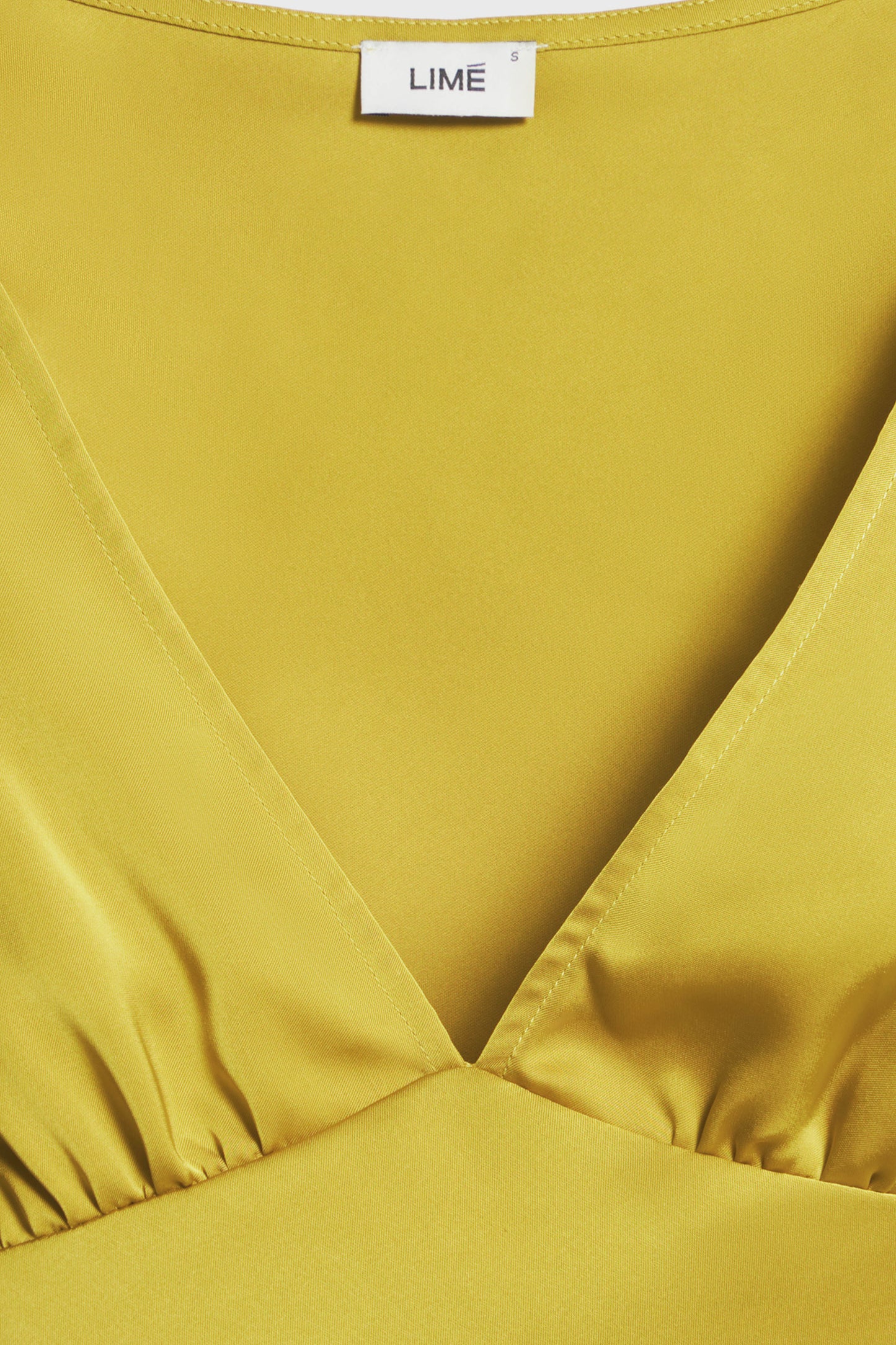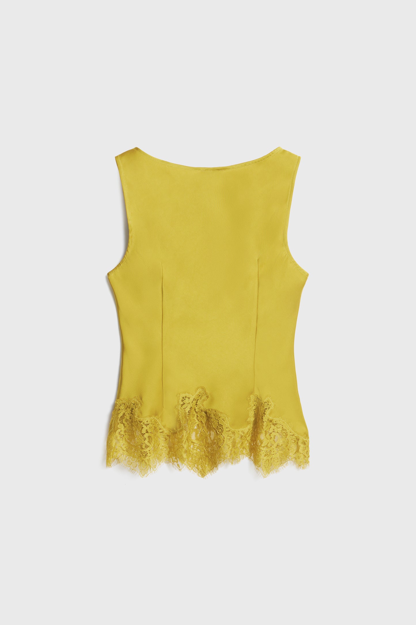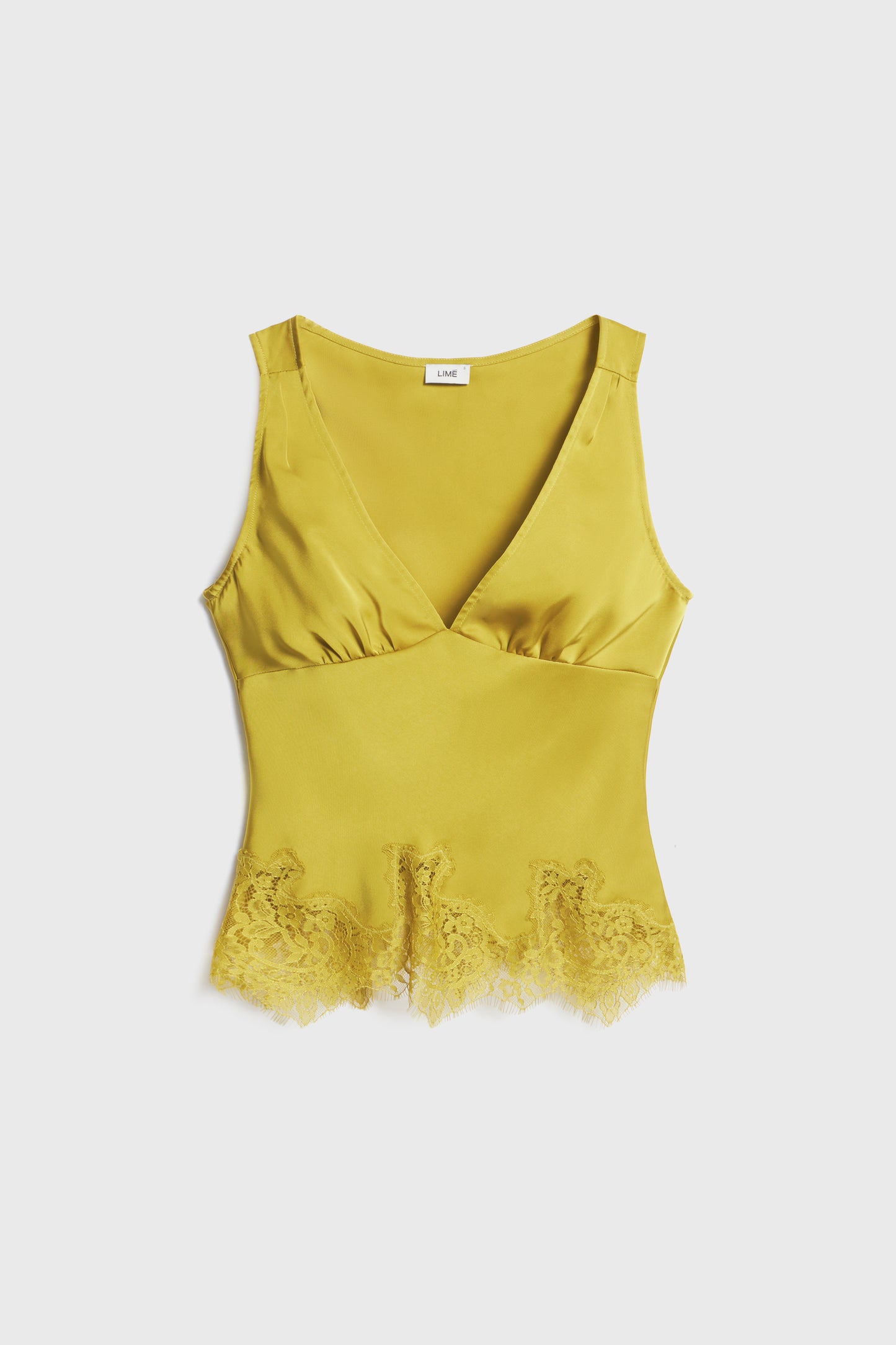 Top in softly draped satin with delicate lace trim. Features a V-neck.