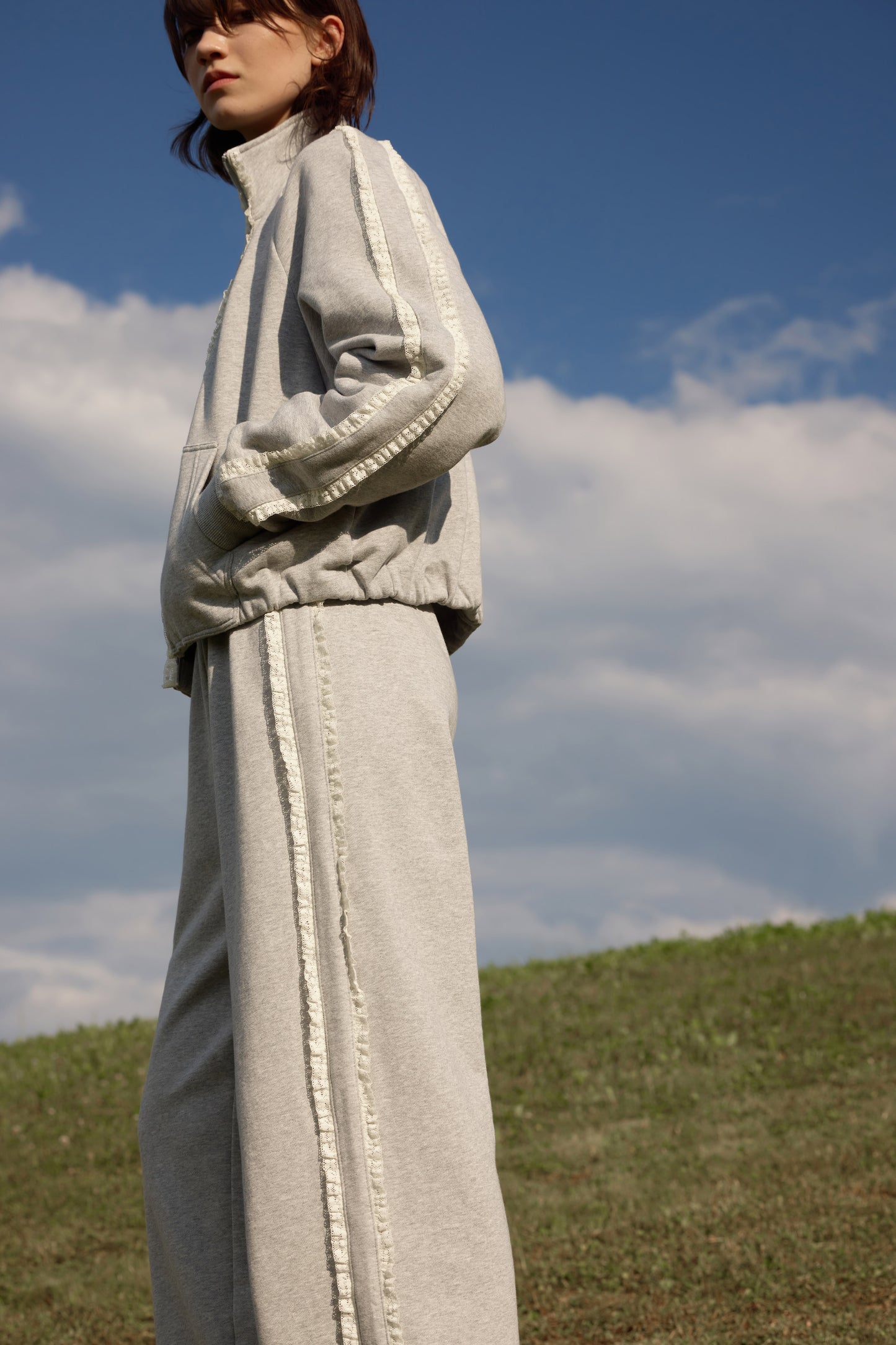 Zip-through sweatshirt in a cotton French Terry. Embellished with lace trim. Stand-up collar, long sleeves, ribbing at cuffs and elasticized drawstring hemsection with cord stoppers.