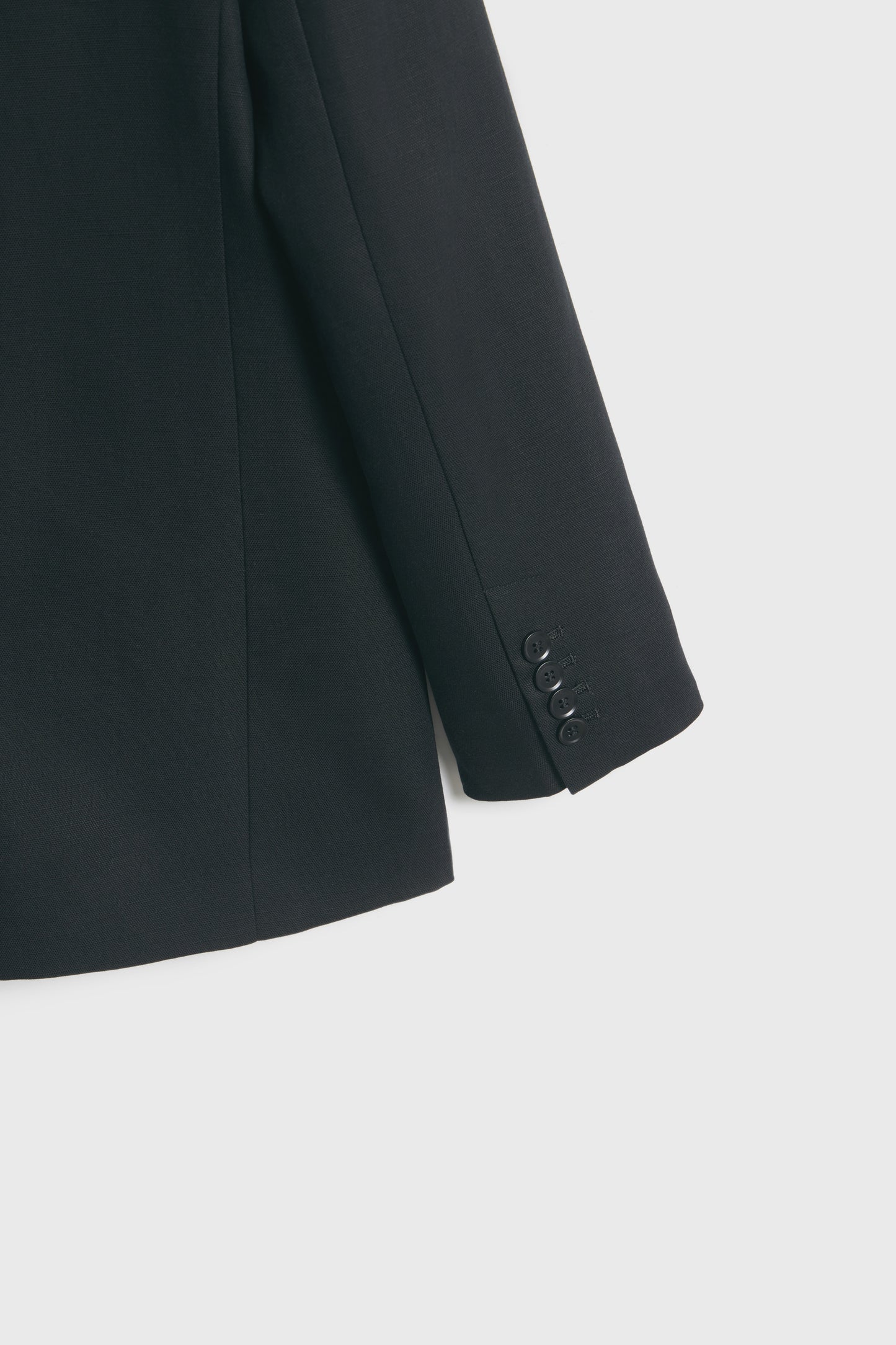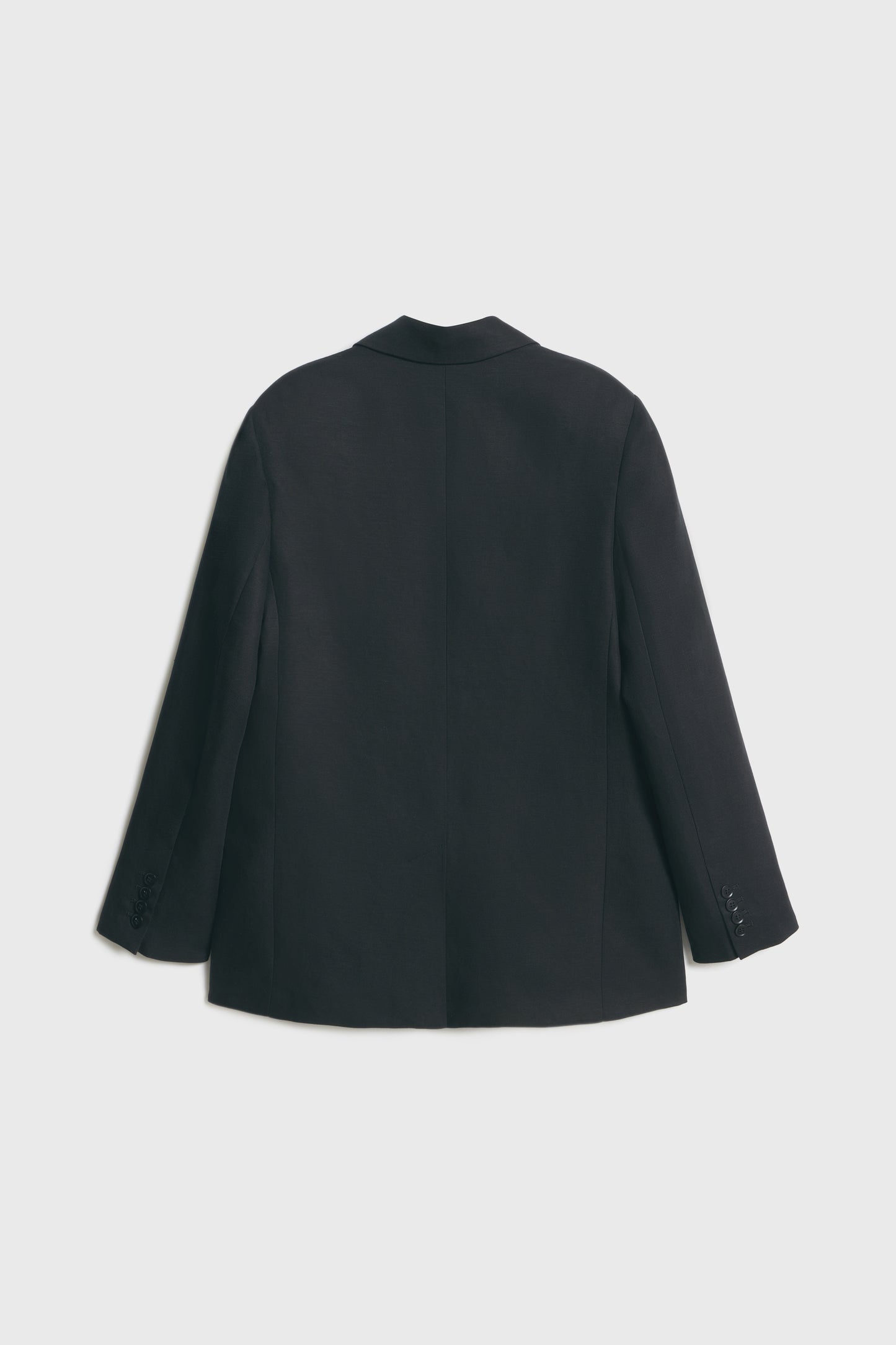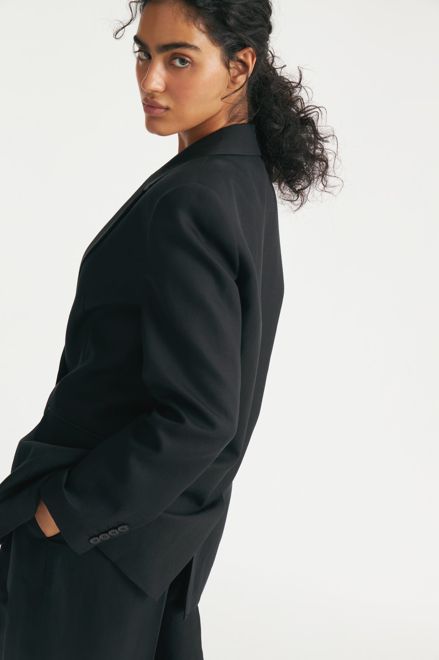 Straight blazer made of lyocell and linen blend. Featuring a lapel collar and long sleeves with shoulder pads. Front pockets with flaps. Matching lining. Single-breasted button fastening on the front.