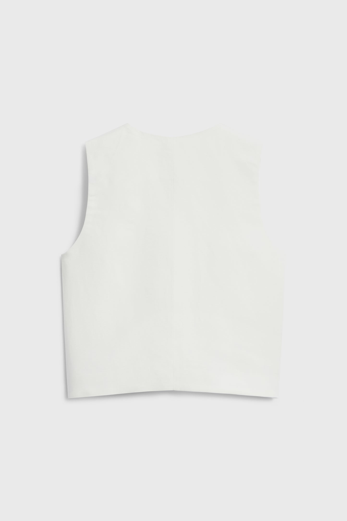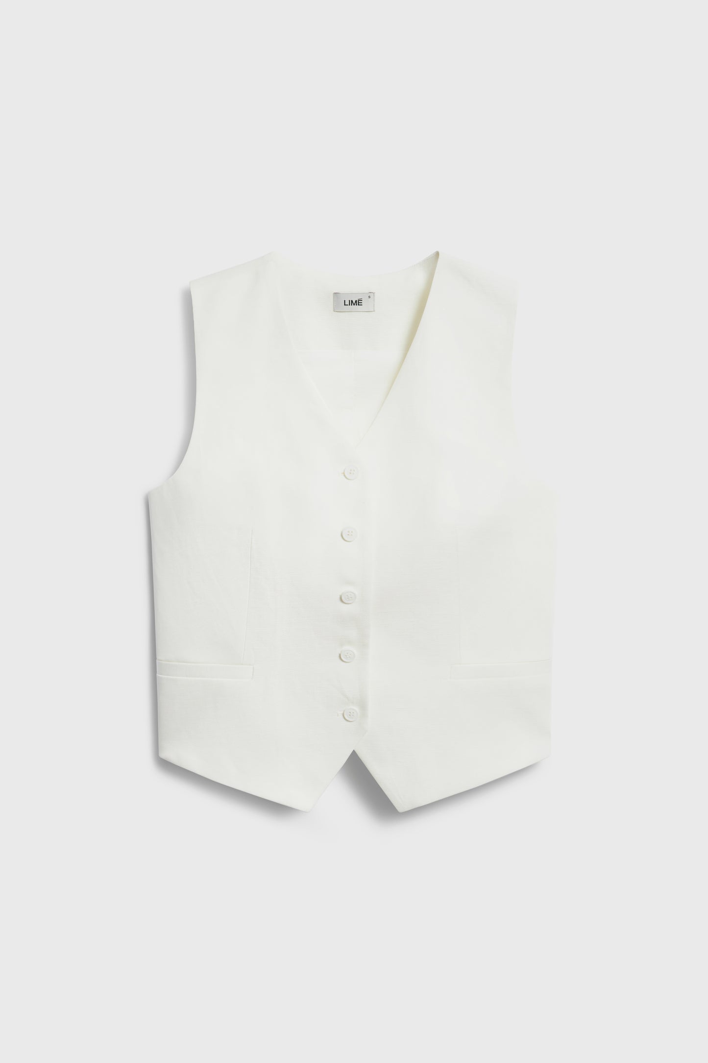 Single-breasted waistcoat with a V-shaped neckline and buttons down the front made from a lyocell and linen blend. Fake welt pockets at the front. Pointed hems. Cotton lining. Straight fit.