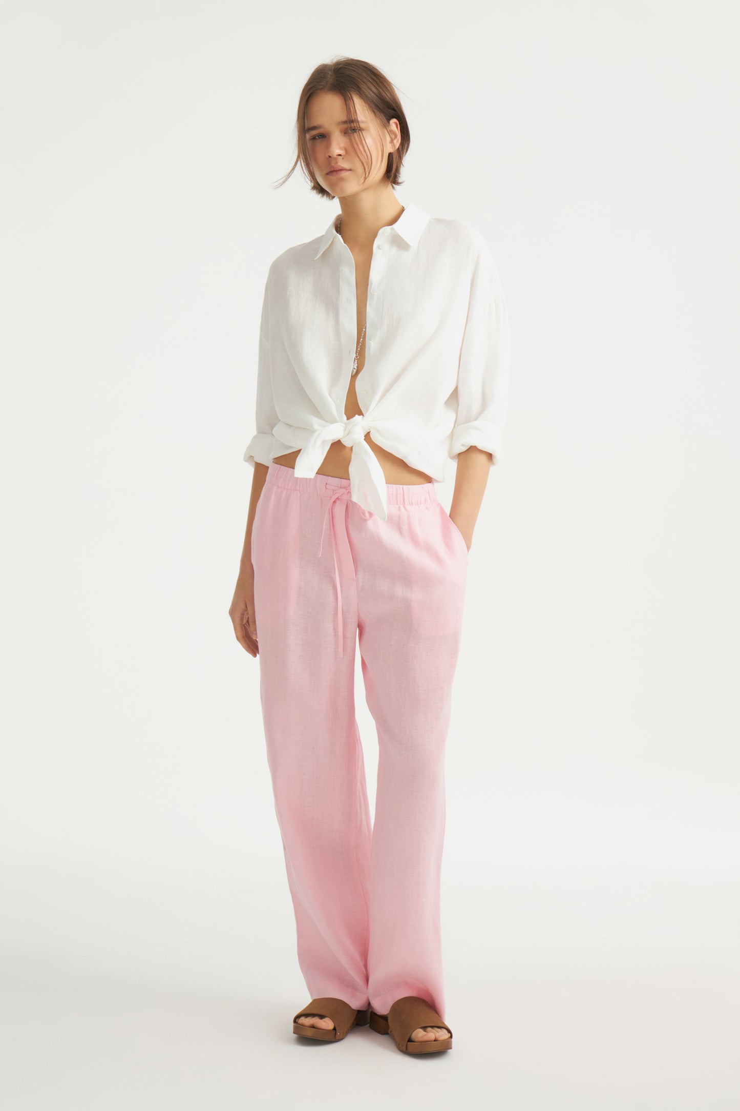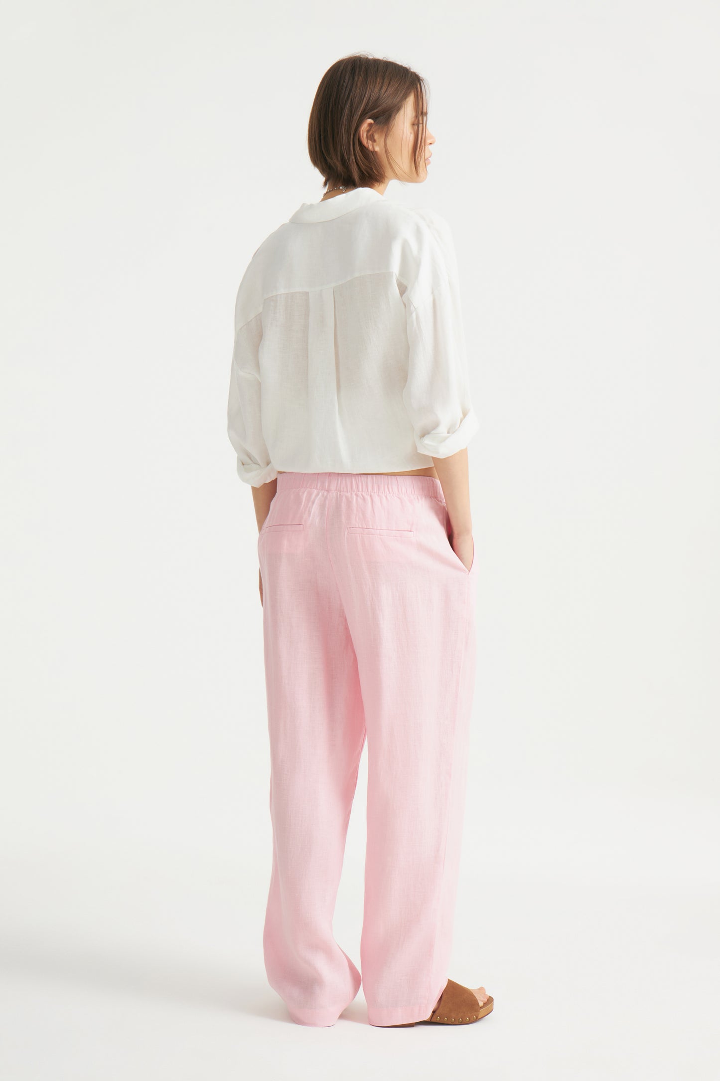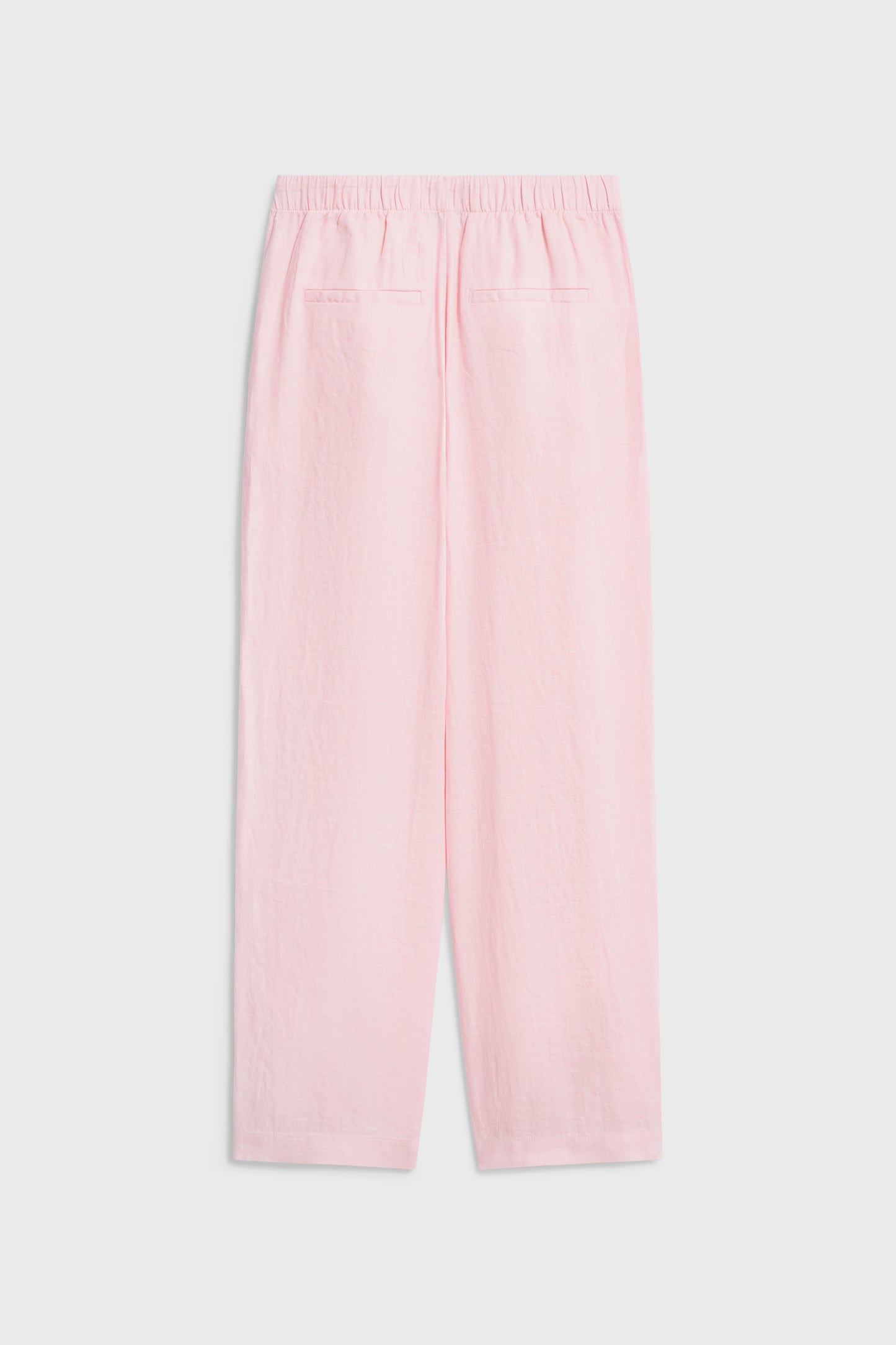 Basic trousers made from 100% linen detailed with slightly narrowed legs. Featuring an adjustable elastic drawstring waistband, side pockets and decorative back welt pockets.