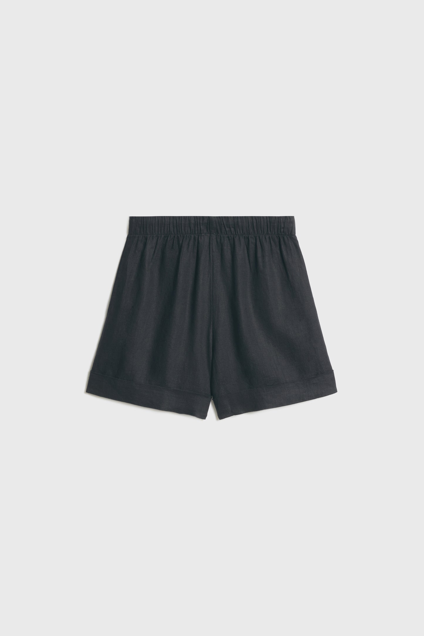 Linen mini shorts featuring an elastic waist with adjustable drawstrings. Side pockets. Turn-up hems.