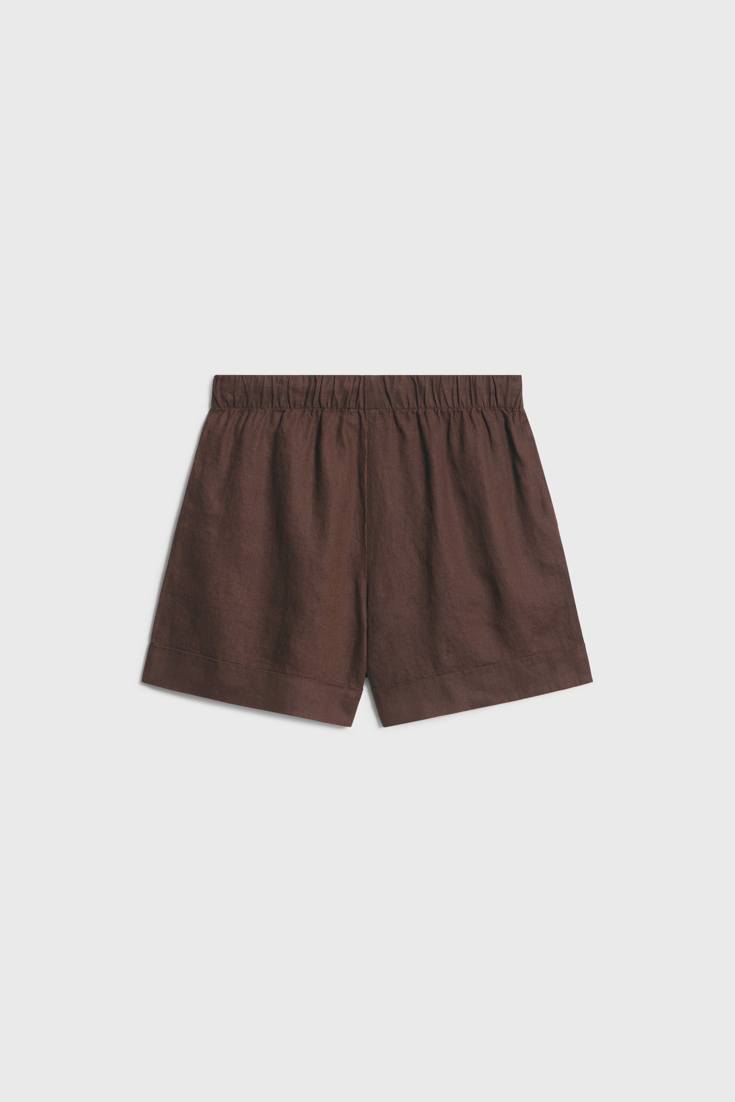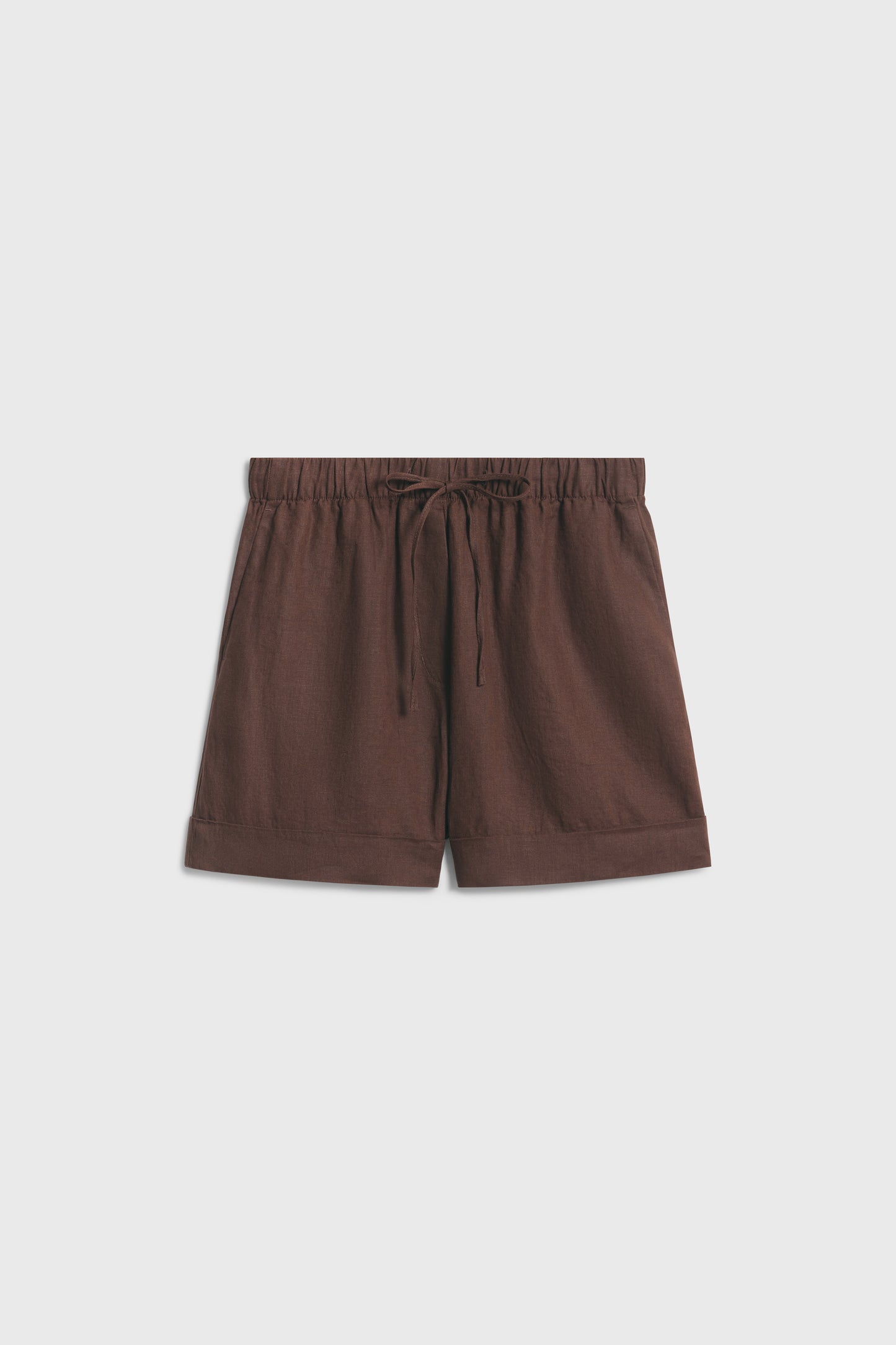Linen mini shorts featuring an elastic waist with adjustable drawstrings. Side pockets. Turn-up hems.
