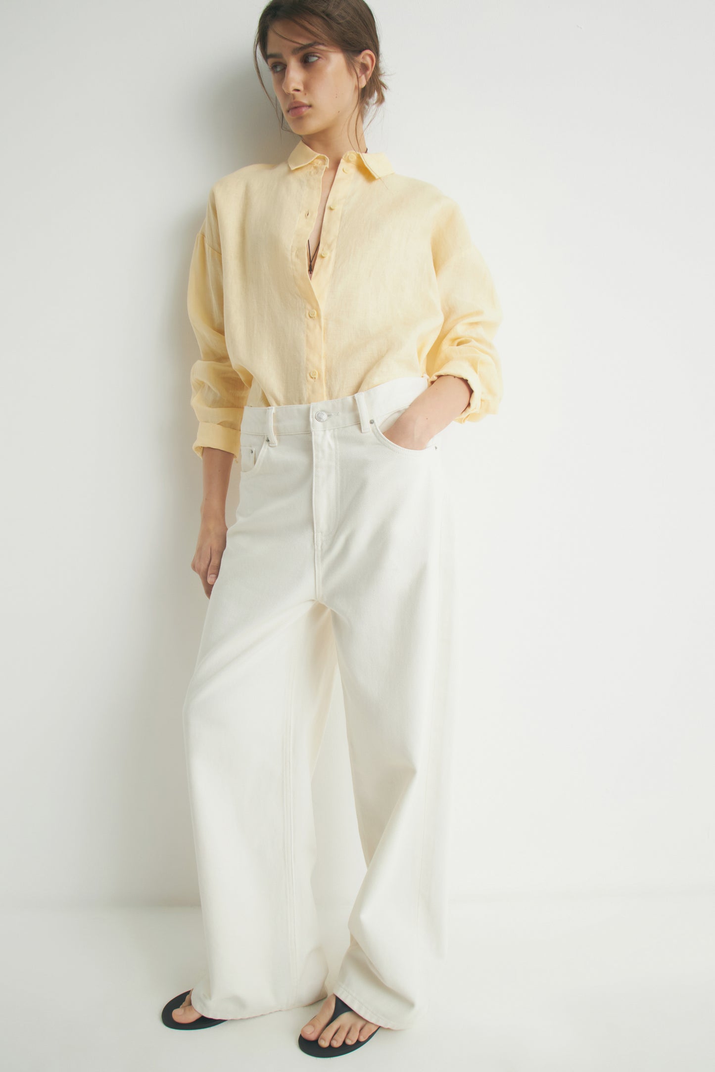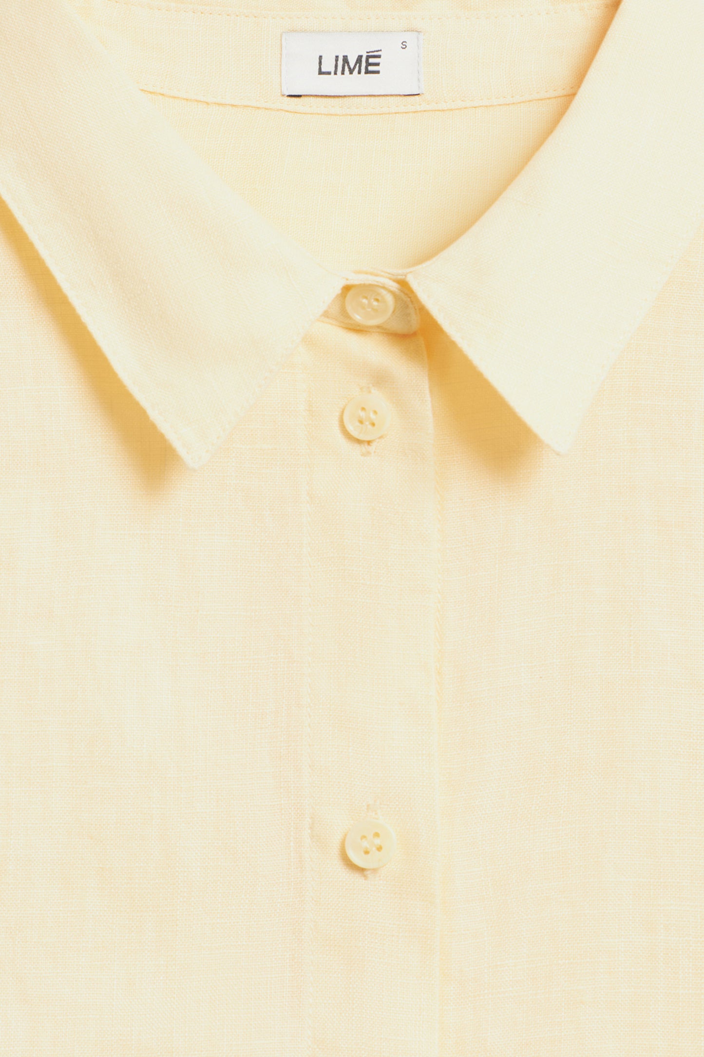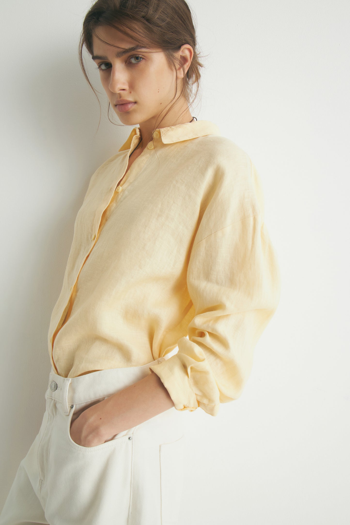 Straight shirt made of 100% linen. Featuring a lapel collar, long sleeves with buttoned cuffs. Asymmetric hem. Pleated detail at the back. Button-up front.
