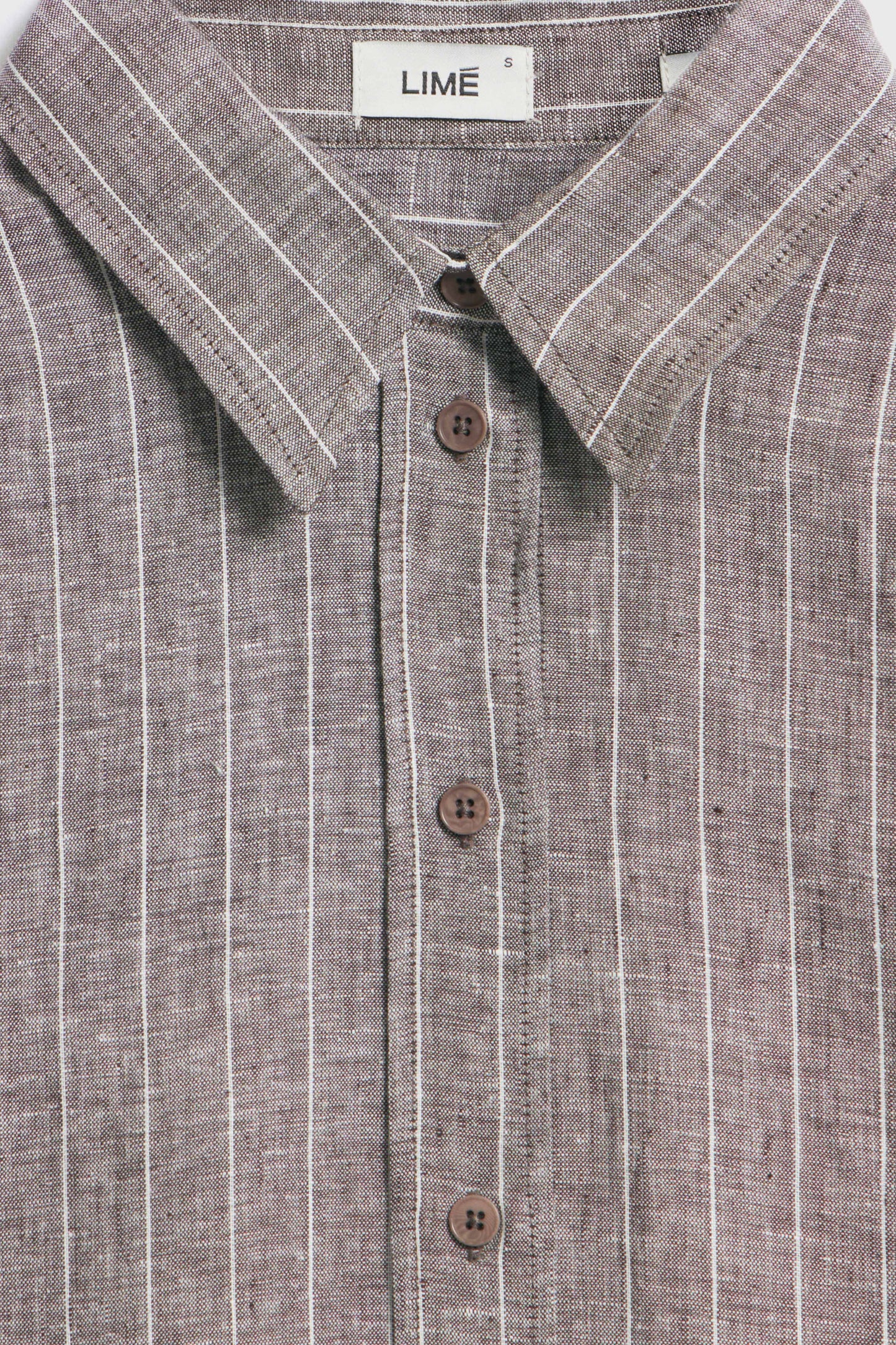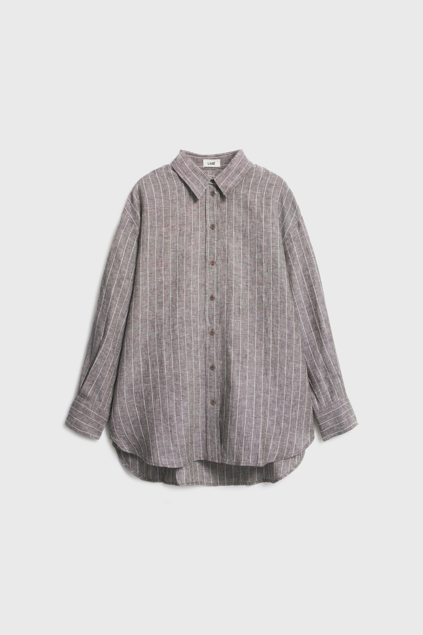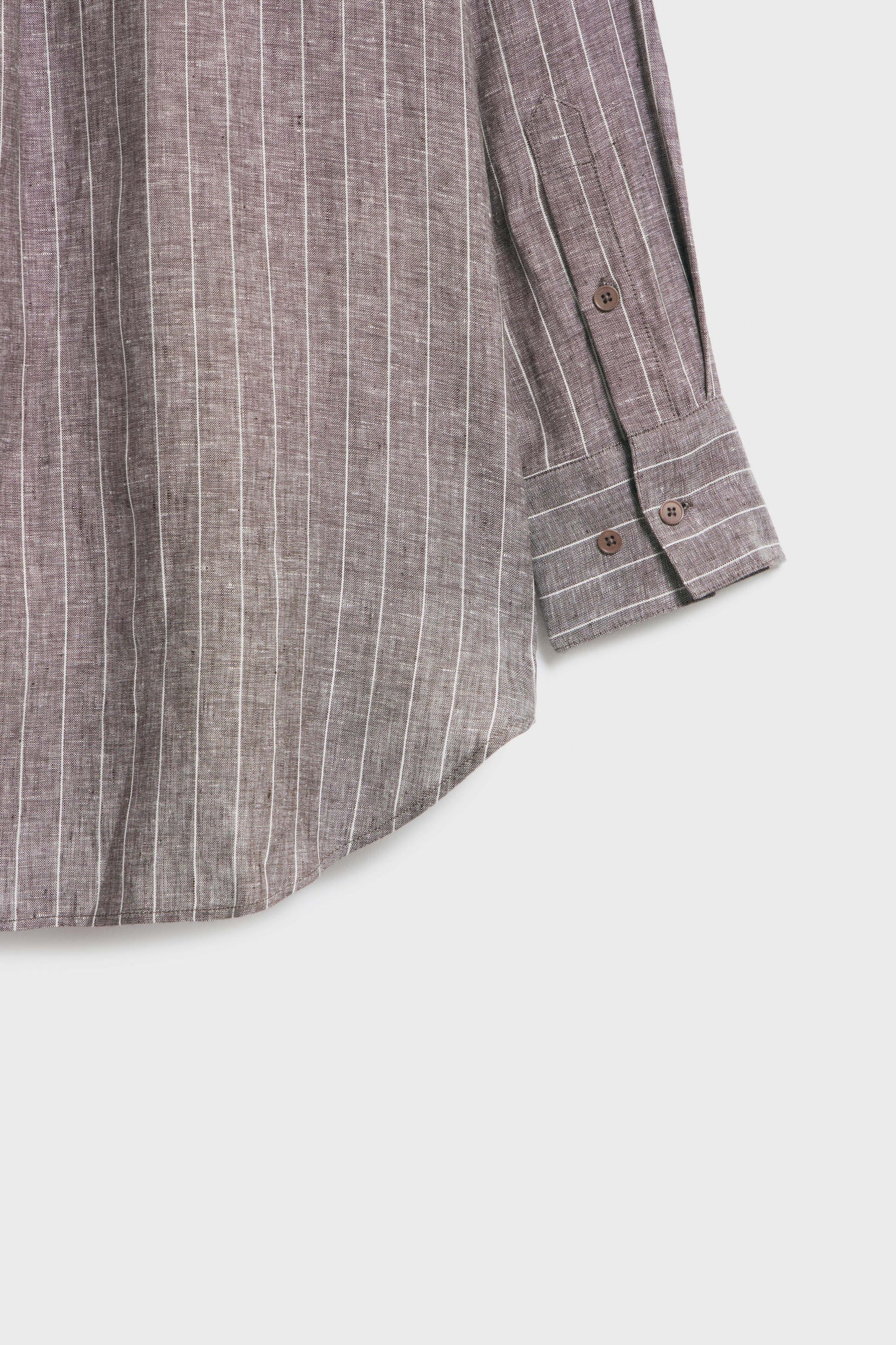 Regular fit shirt is crafted from lightweight linen. Shirt collar, long sleeves, elongated back and bottom down front.