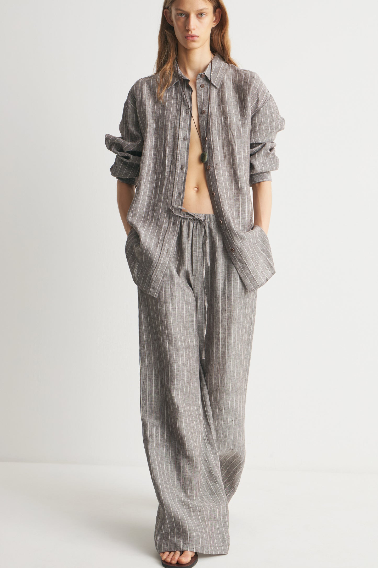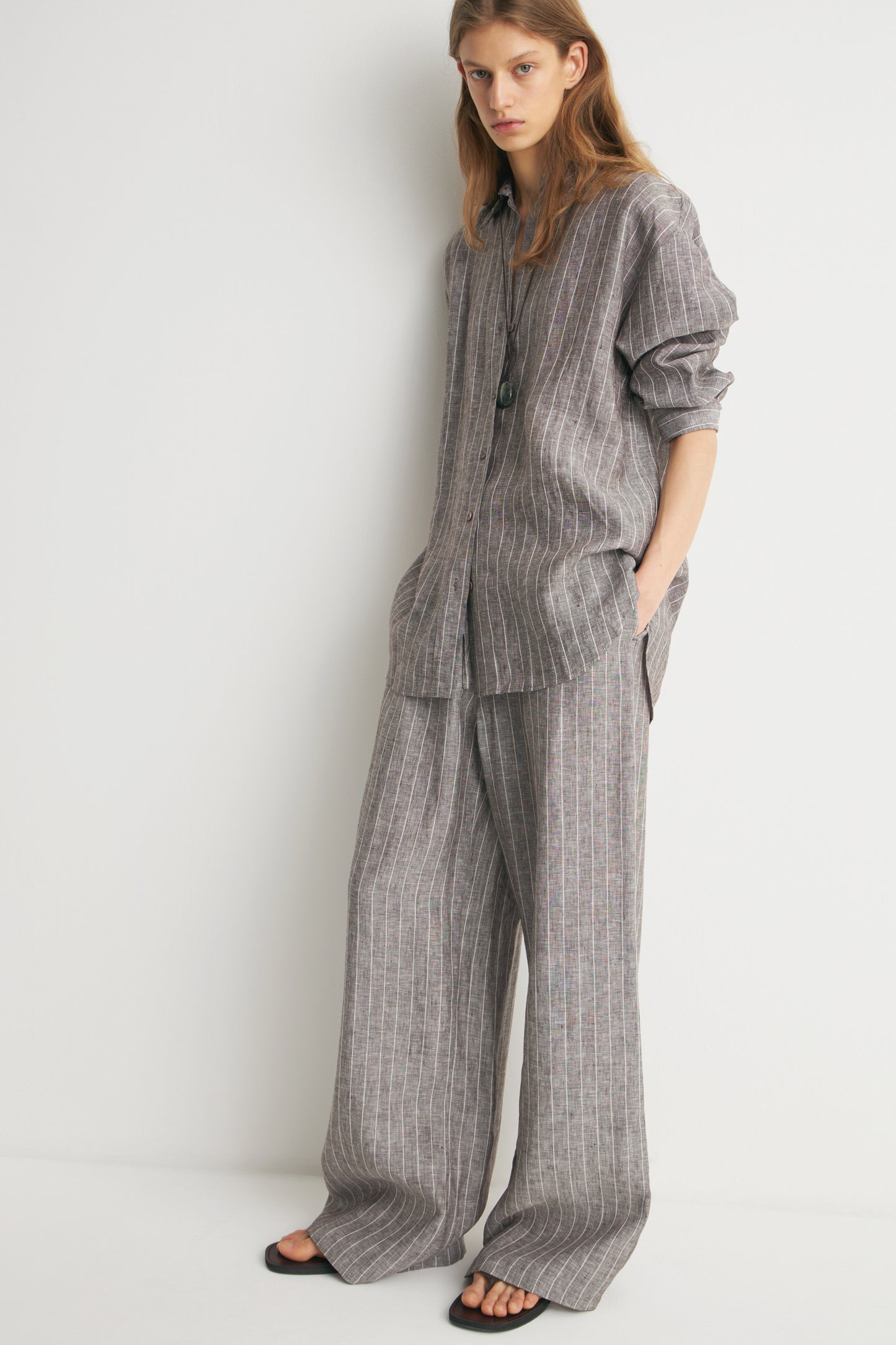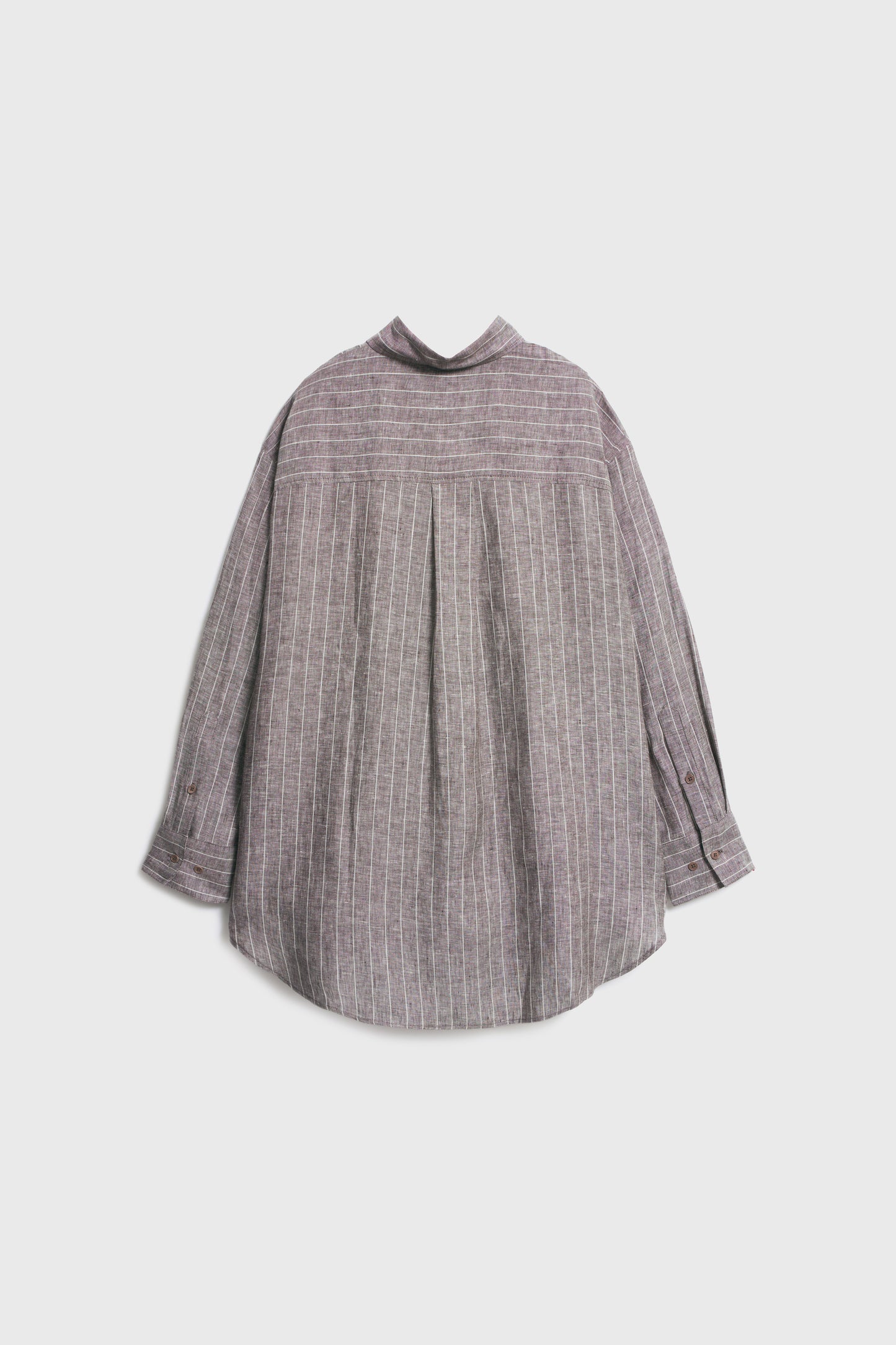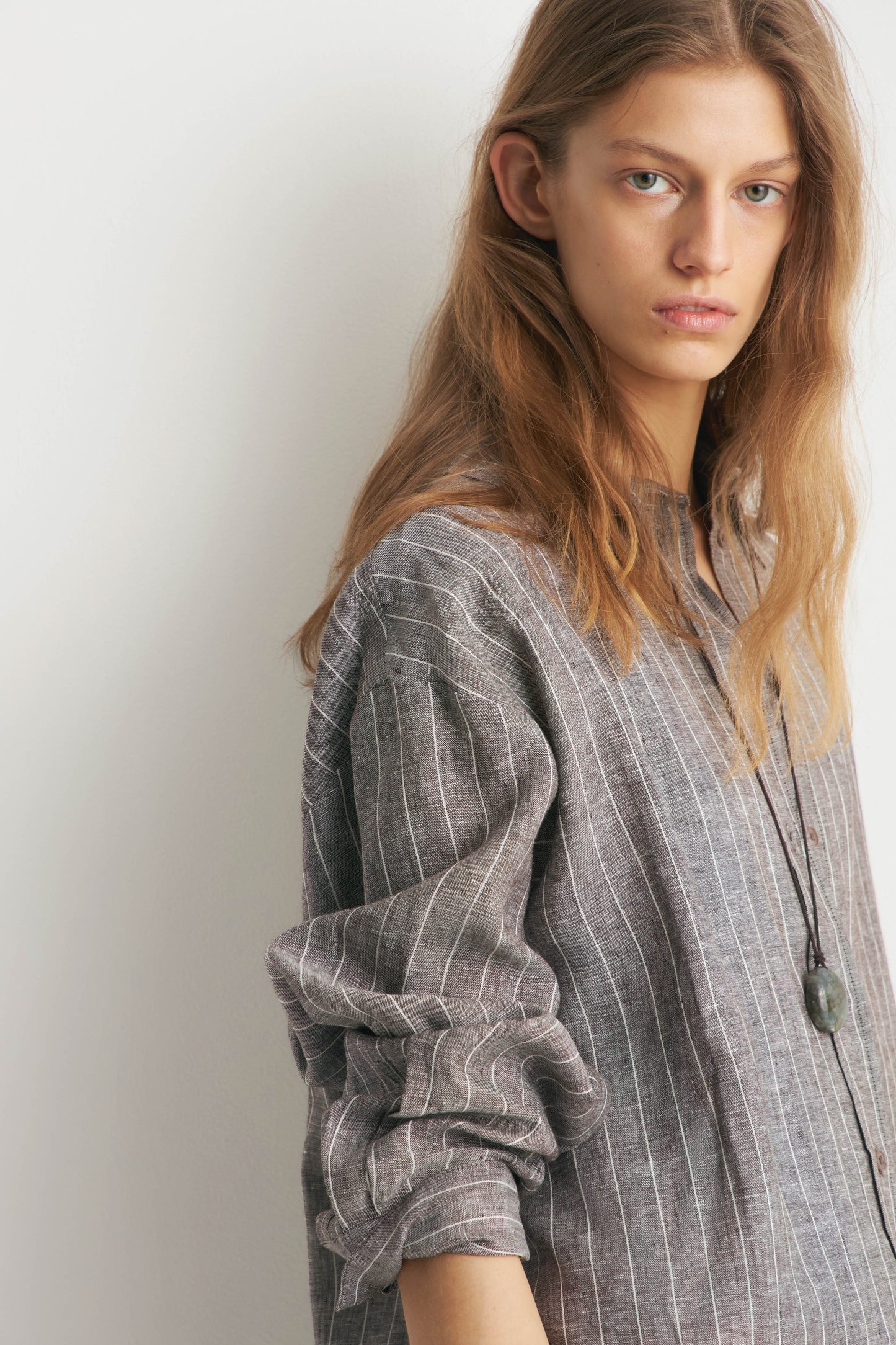 Regular fit shirt is crafted from lightweight linen. Shirt collar, long sleeves, elongated back and bottom down front.