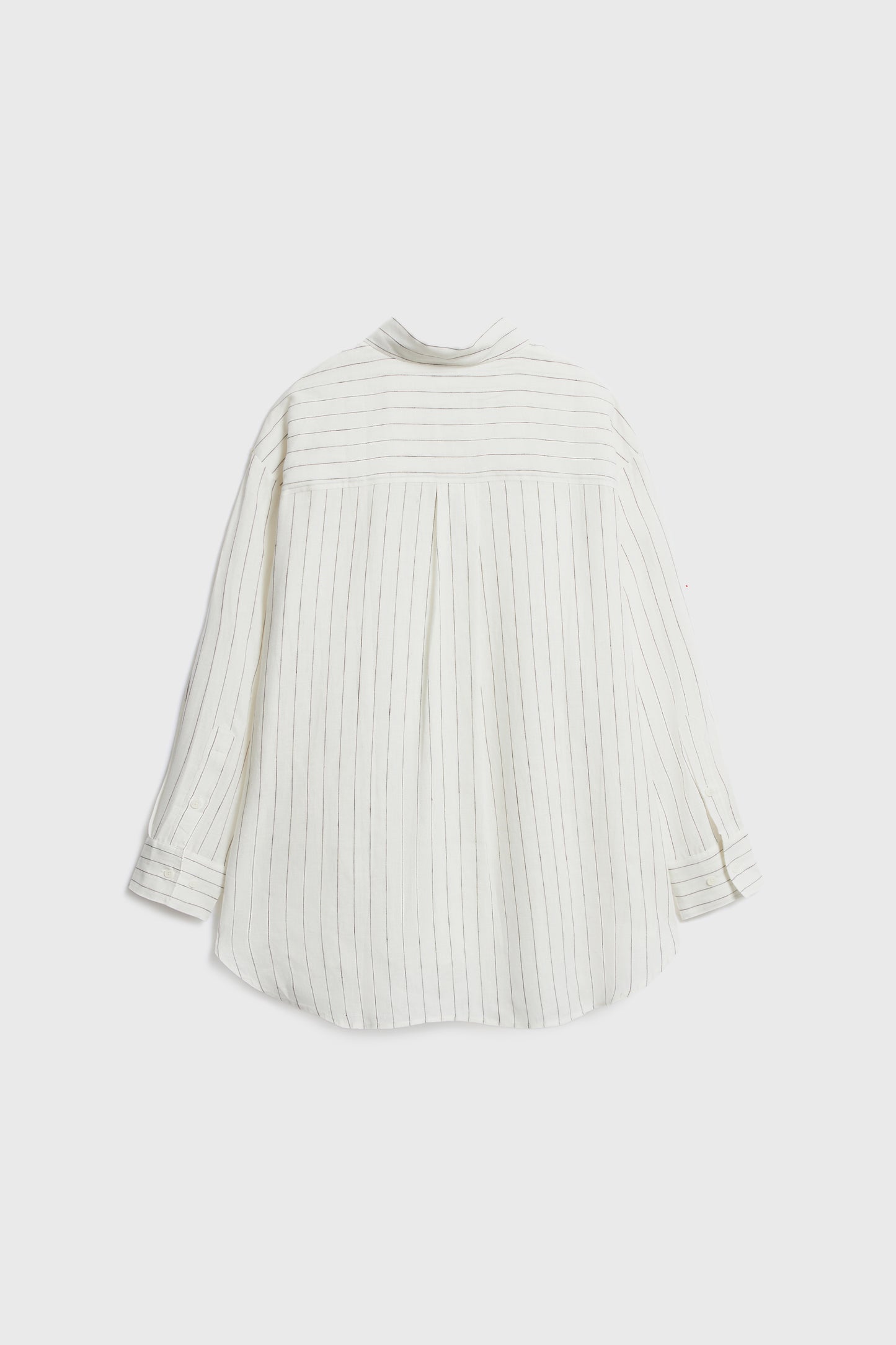 Regular fit shirt is crafted from lightweight linen. Shirt collar, long sleeves, elongated back and bottom down front.