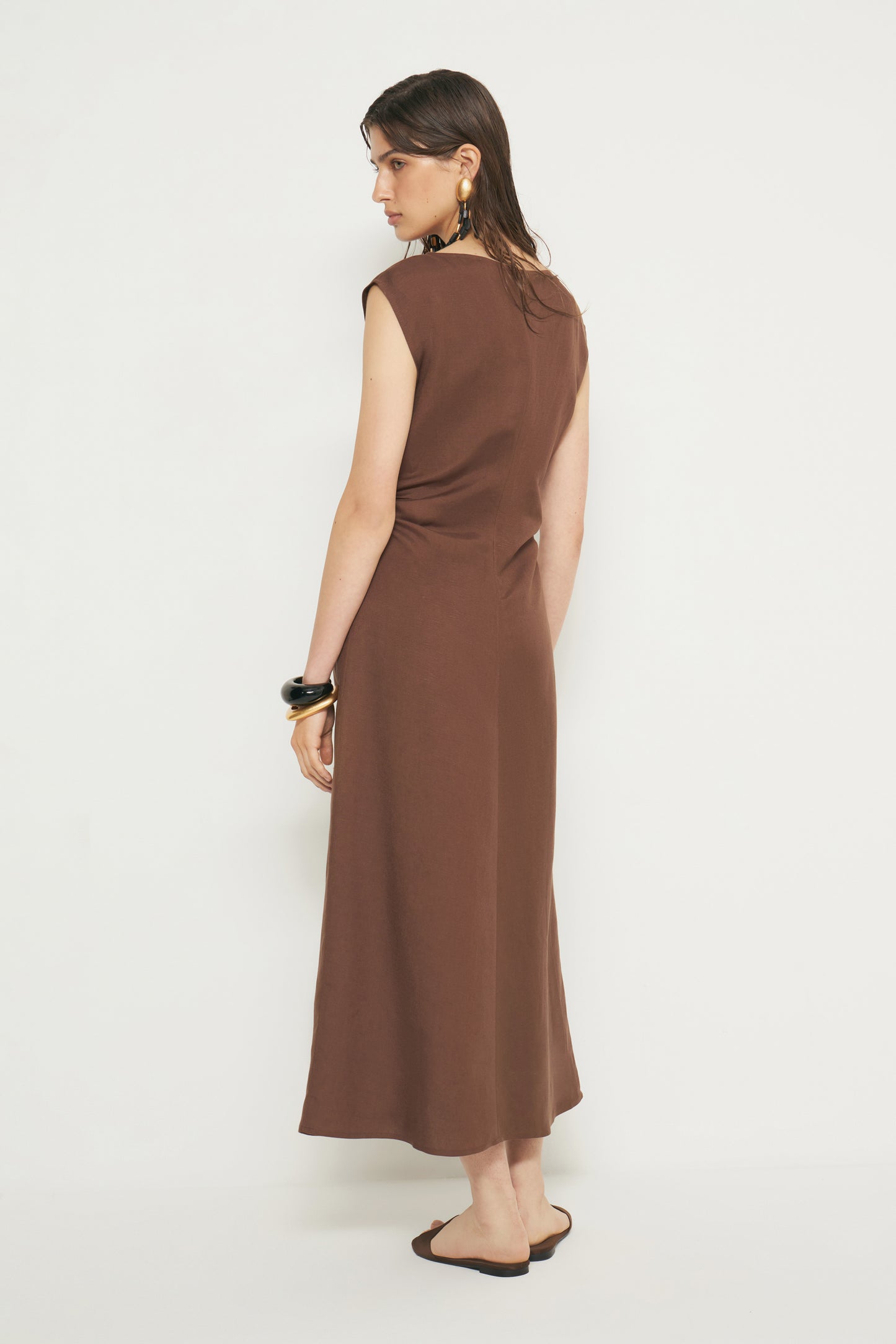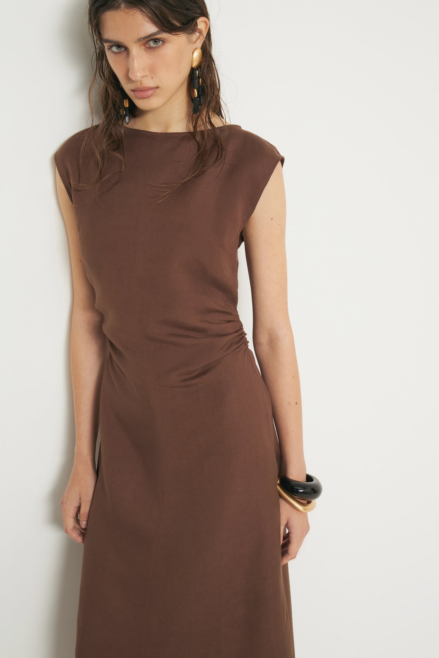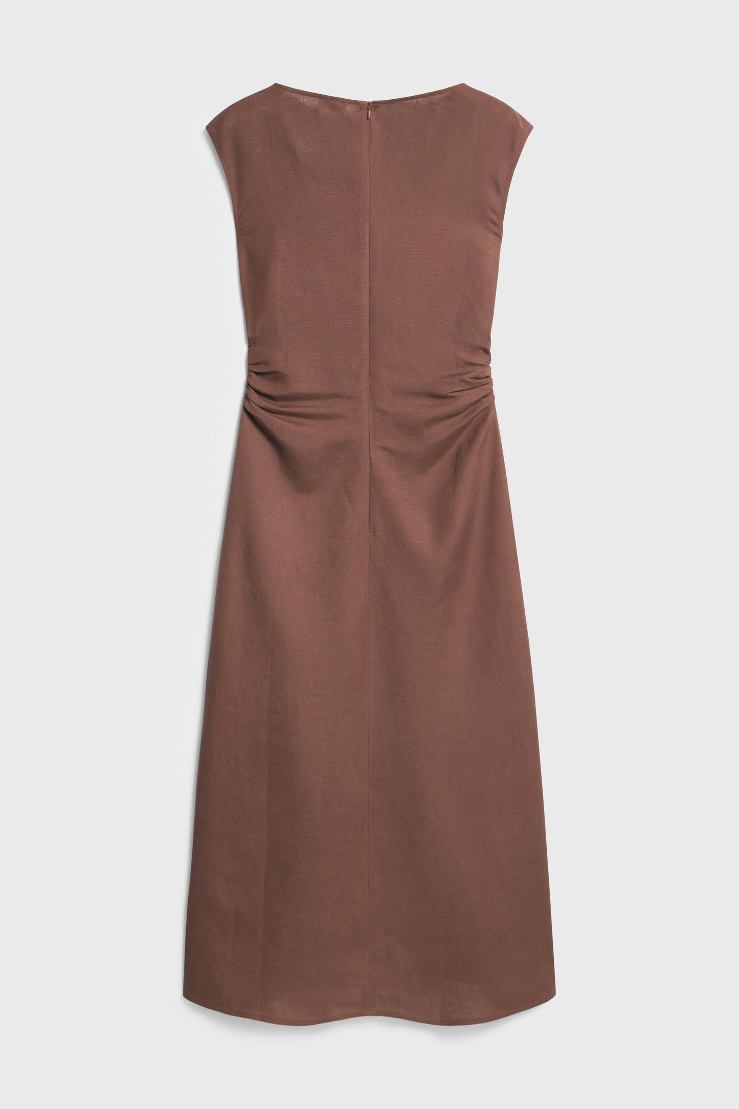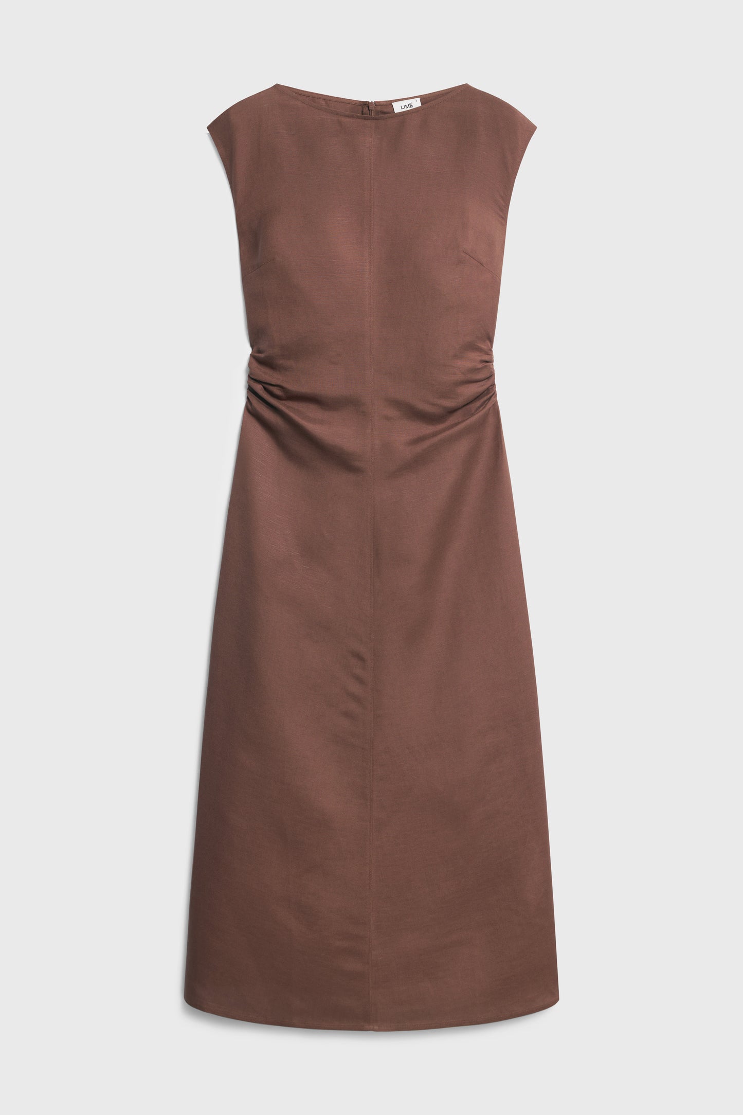 Long dress in an airy, woven linen and viscose blend. Boat neck, gathers at the sides for a draped effect, and back zip.