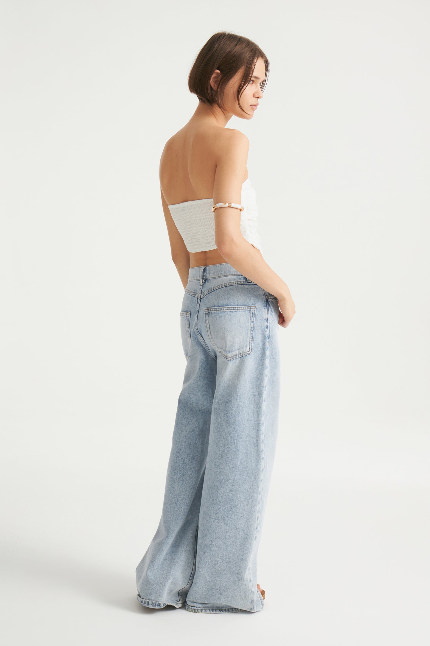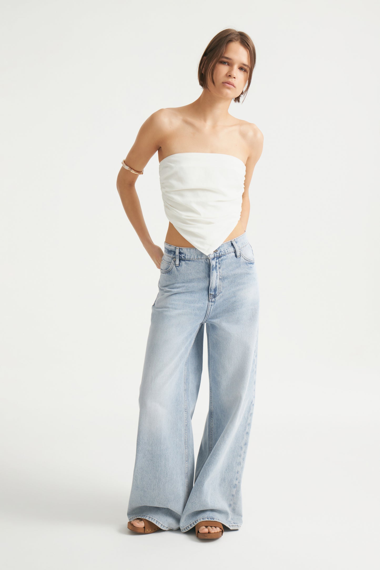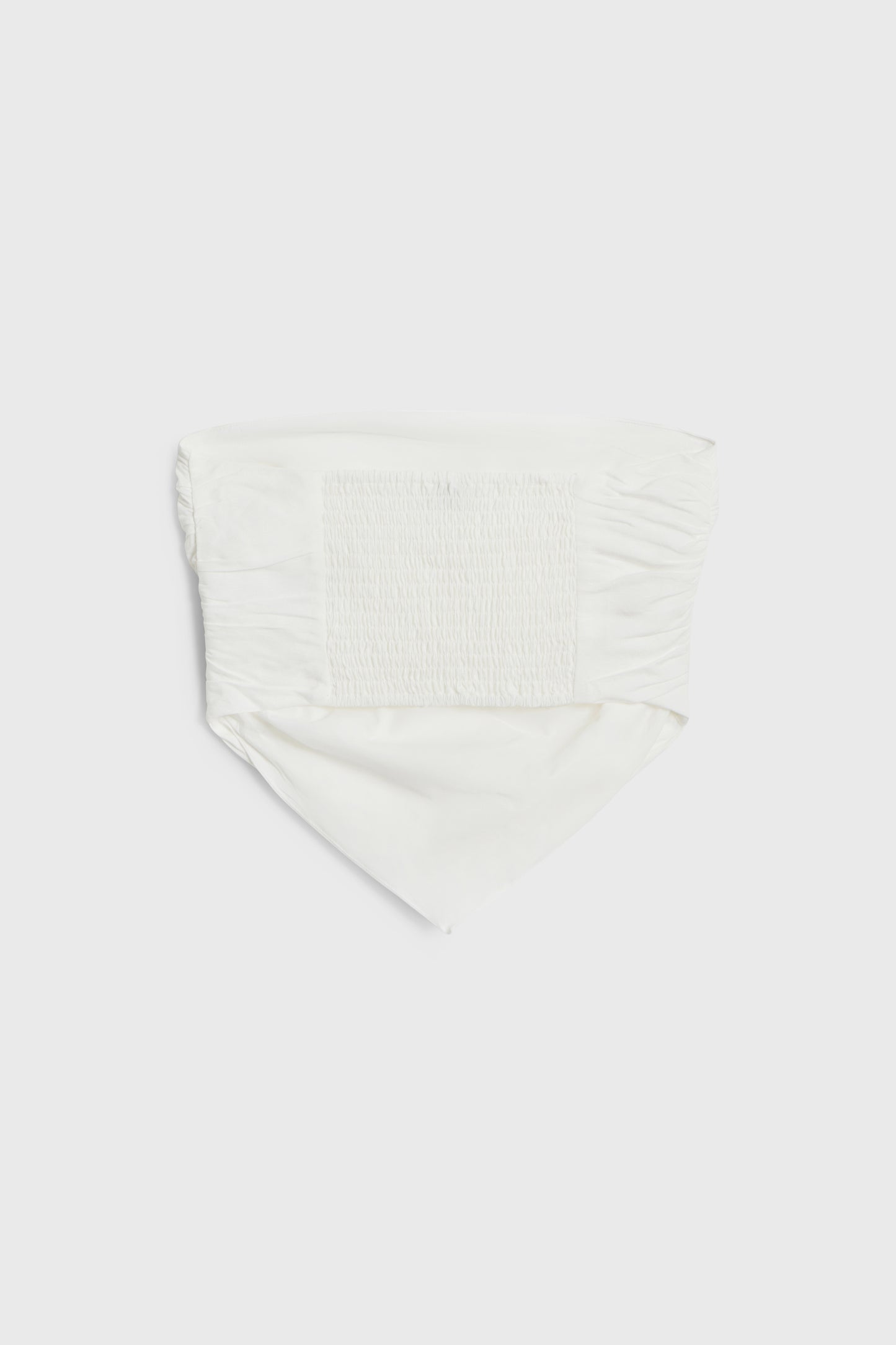 Cropped off-the-shoulder top crafted from organic linen and viscose blend. Styled as a wide scarf on the front, it has an elasticated back insert and pointed hem. Slim fit. Lined.