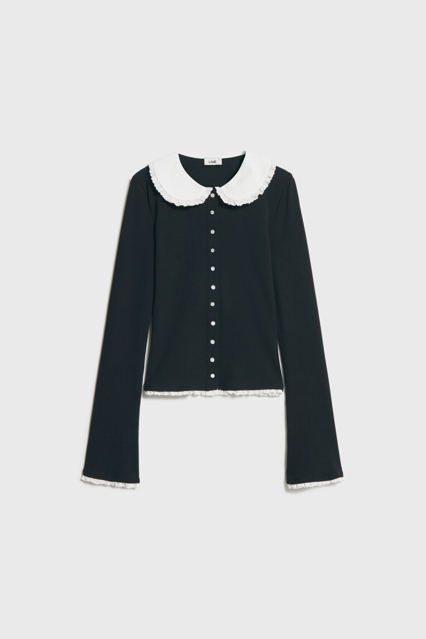 Long-sleeved top in soft cotton and viscose blend. Wide rounded collar, pearly front buttons, and contrast trim.