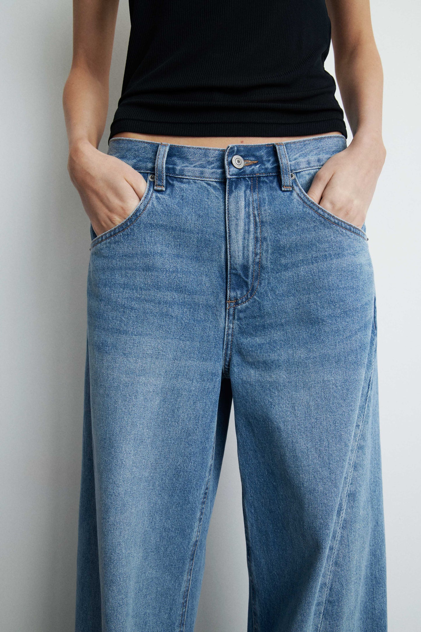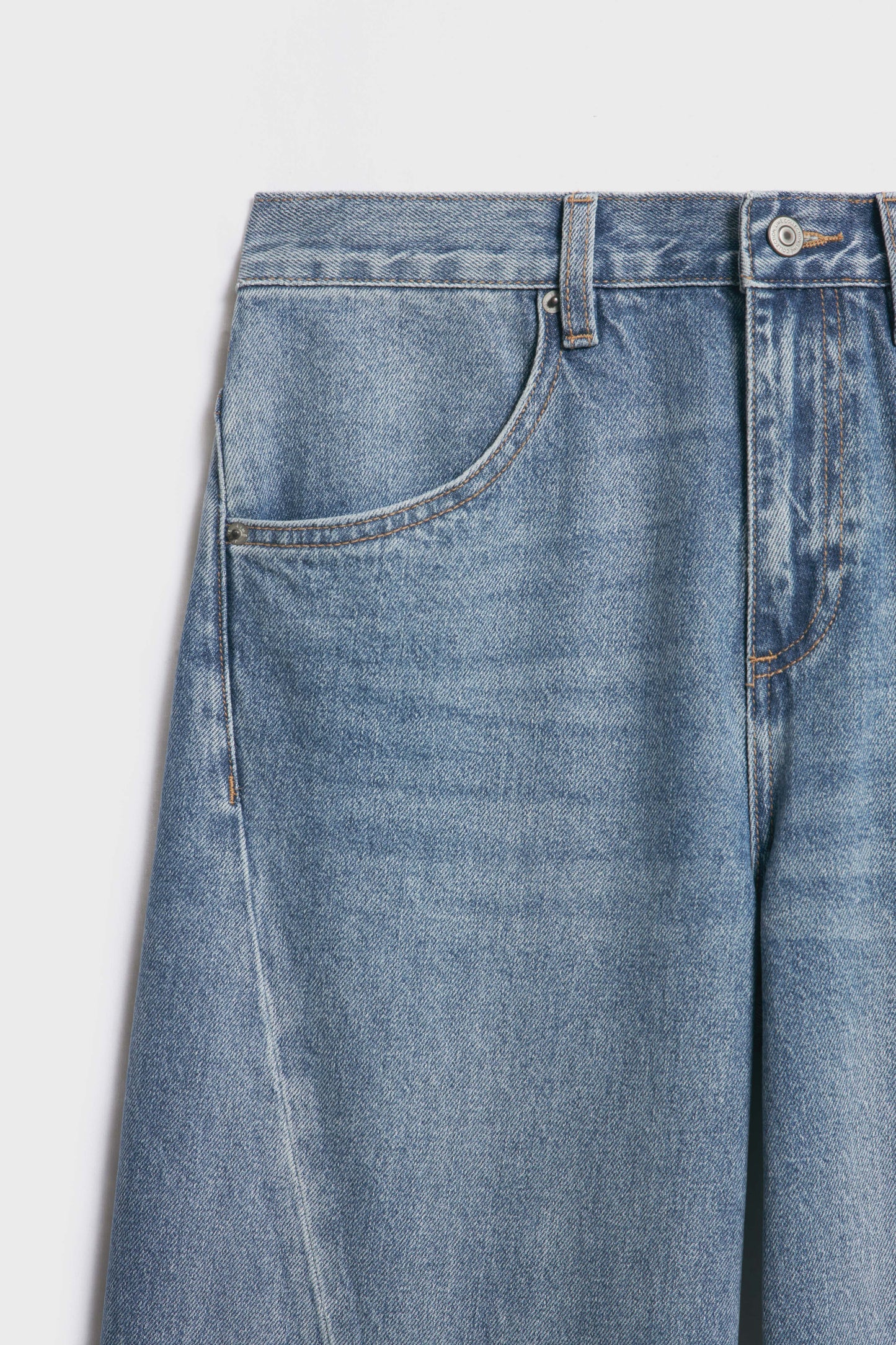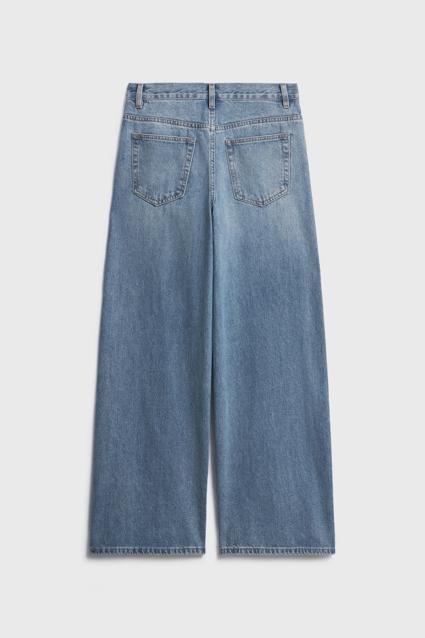 Wide jeans in washed cotton denim with a low waist. Relaxed-fit and slightly tapered legs. Styled with diagonal side seams. Front and back pockets. Front zip fly and top button fastening.
