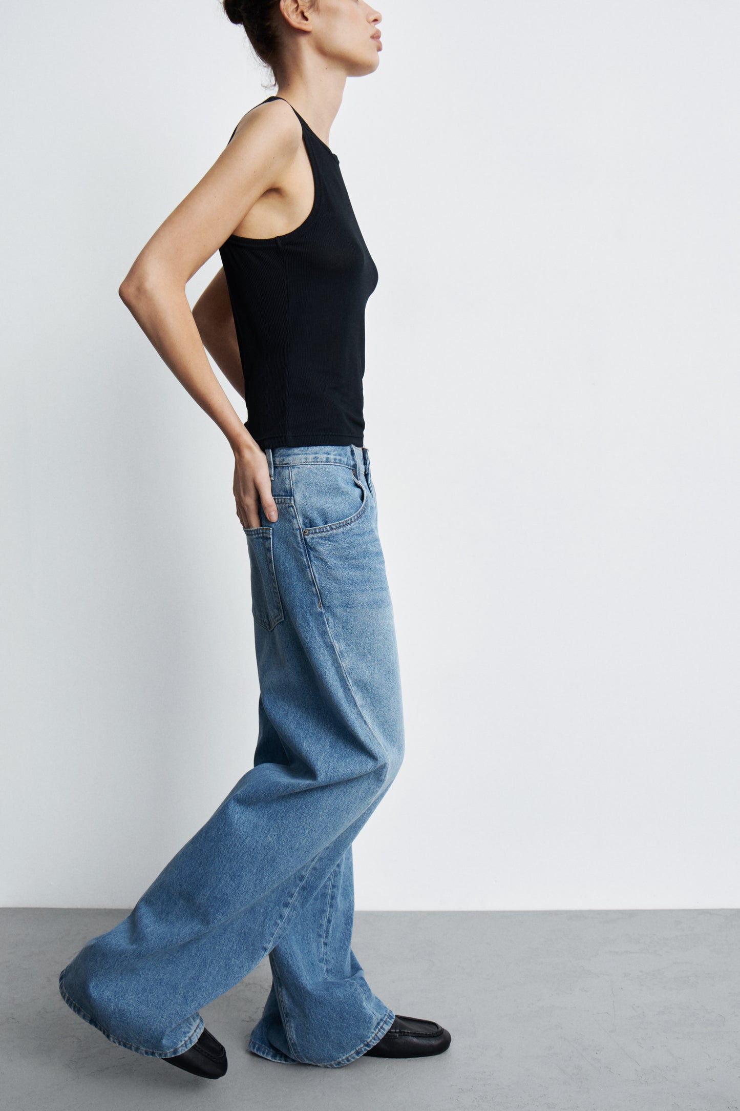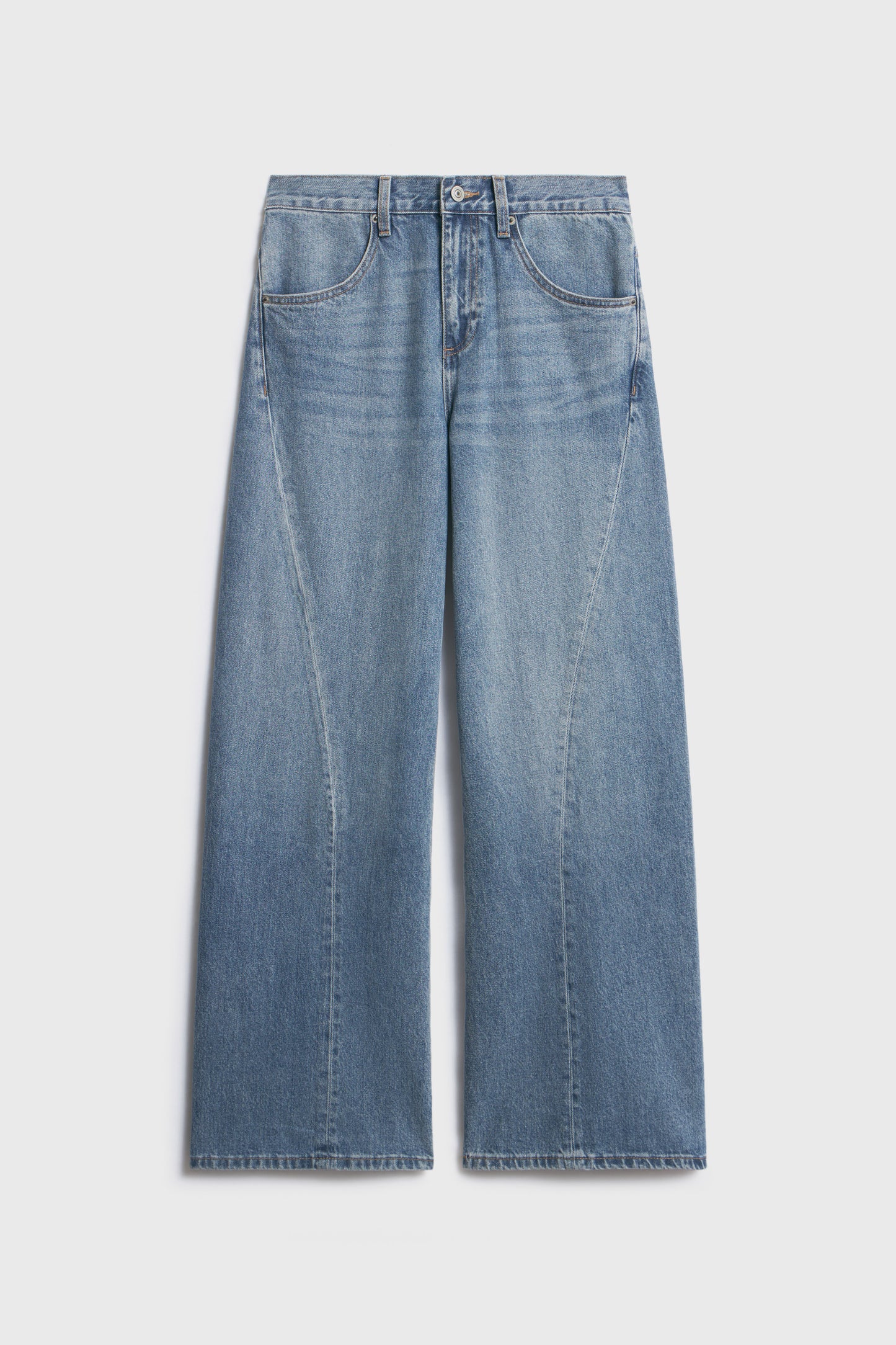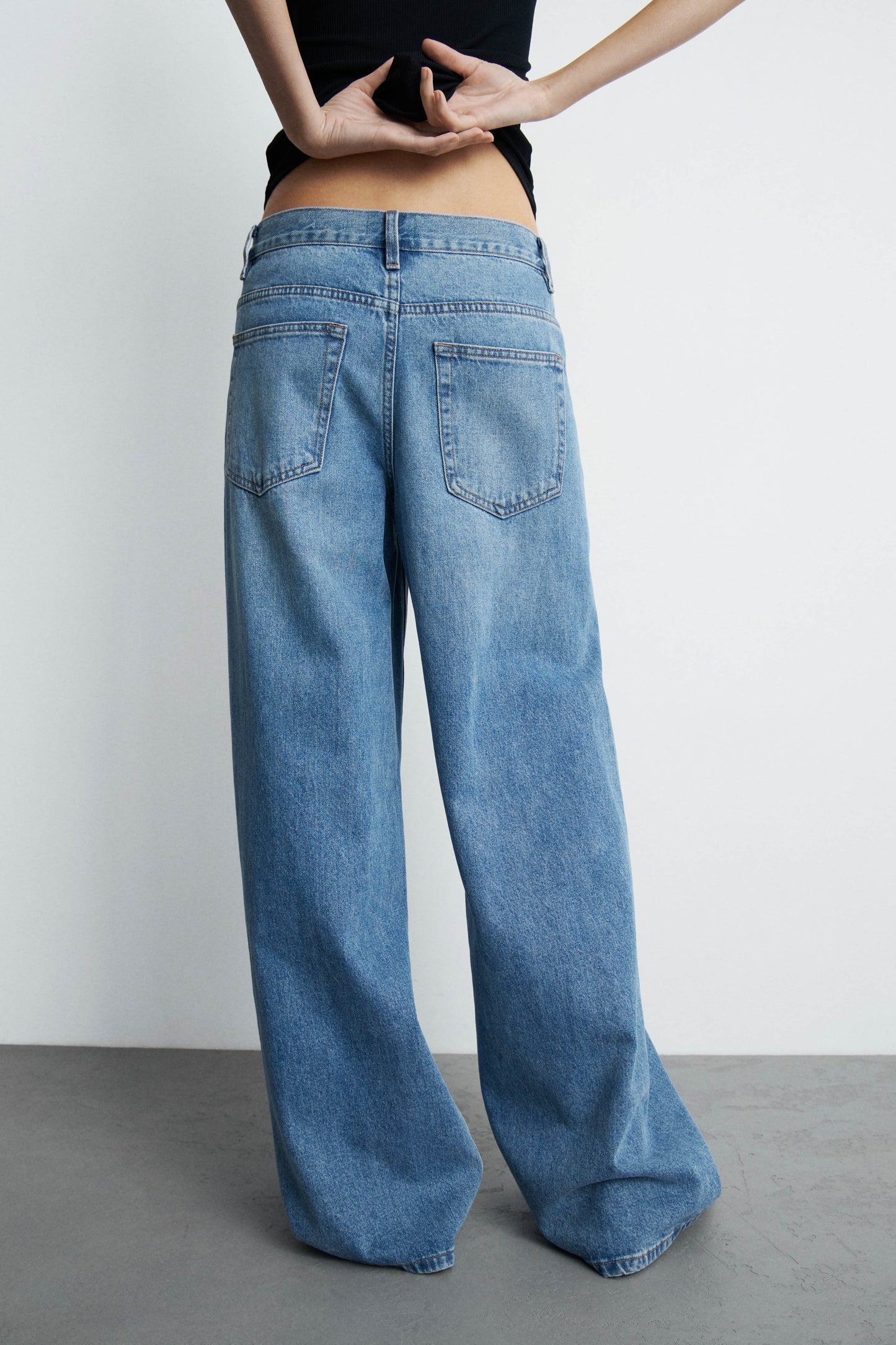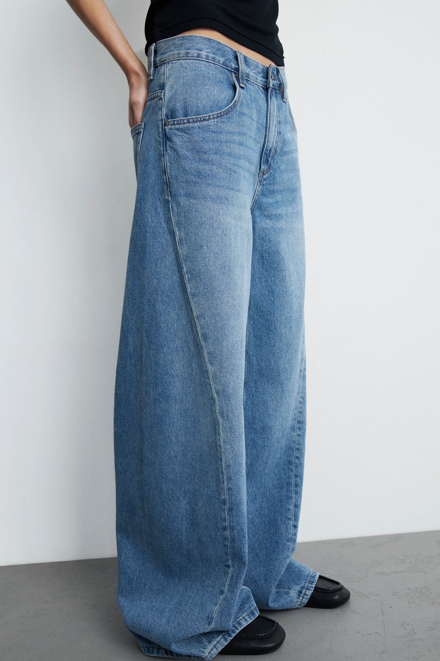 Wide jeans in washed cotton denim with a low waist. Relaxed-fit and slightly tapered legs. Styled with diagonal side seams. Front and back pockets. Front zip fly and top button fastening.