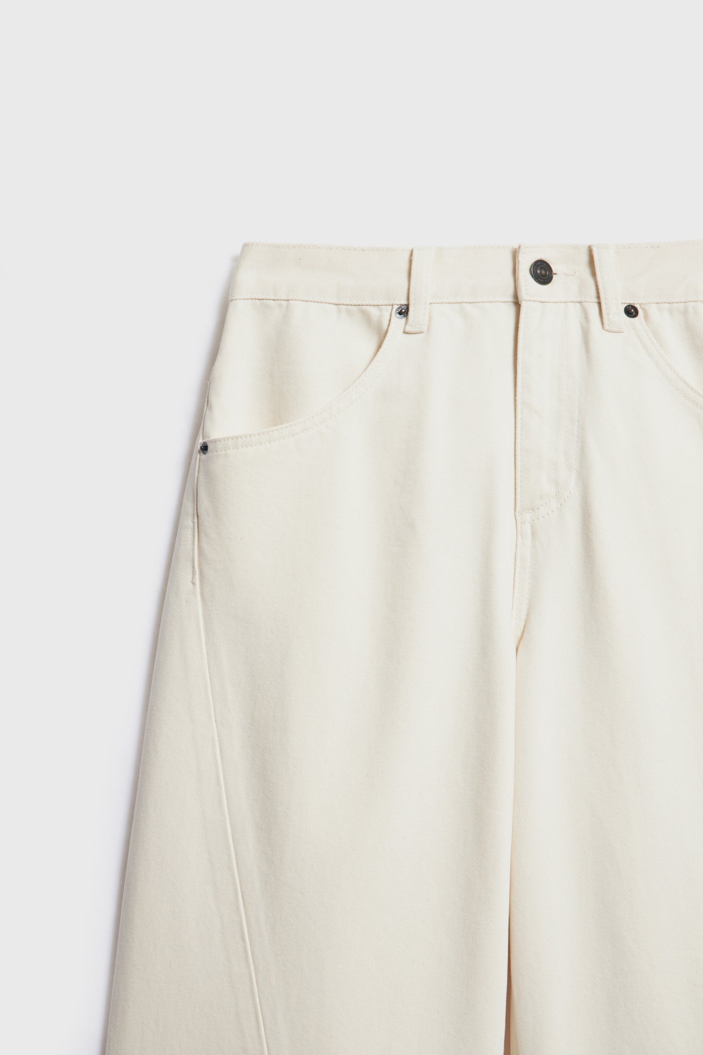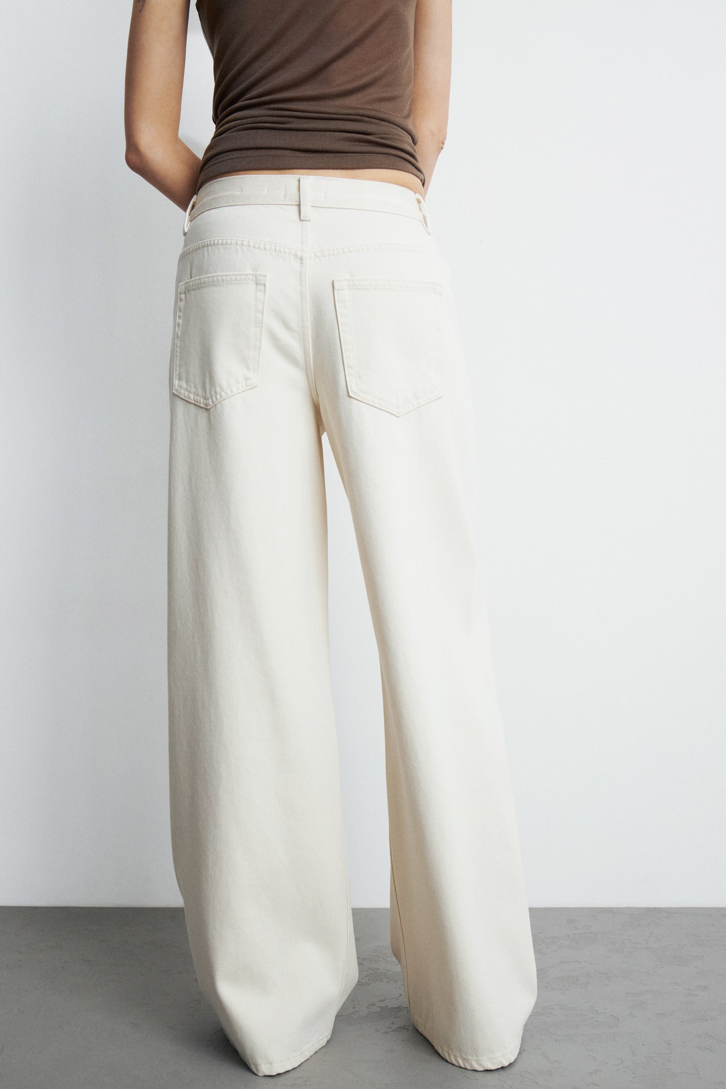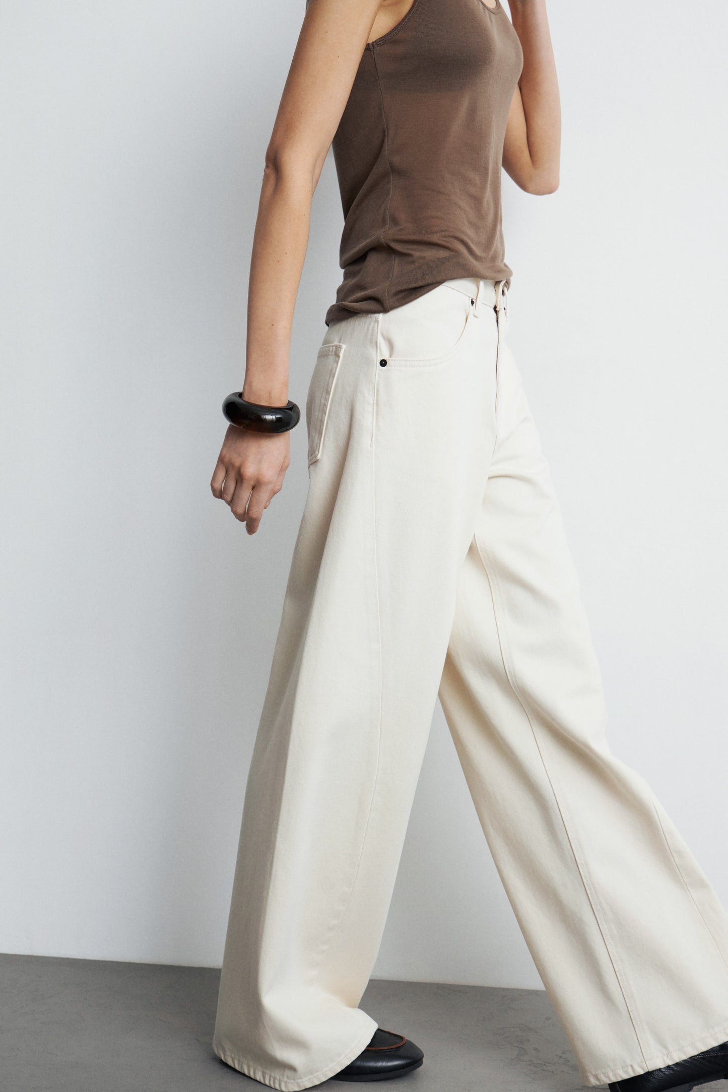 Wide jeans in washed cotton denim with a low waist. Relaxed fit and tapered legs. Styled with diagonal side seams. Front and back pockets. Front zip fly and top button fastening.