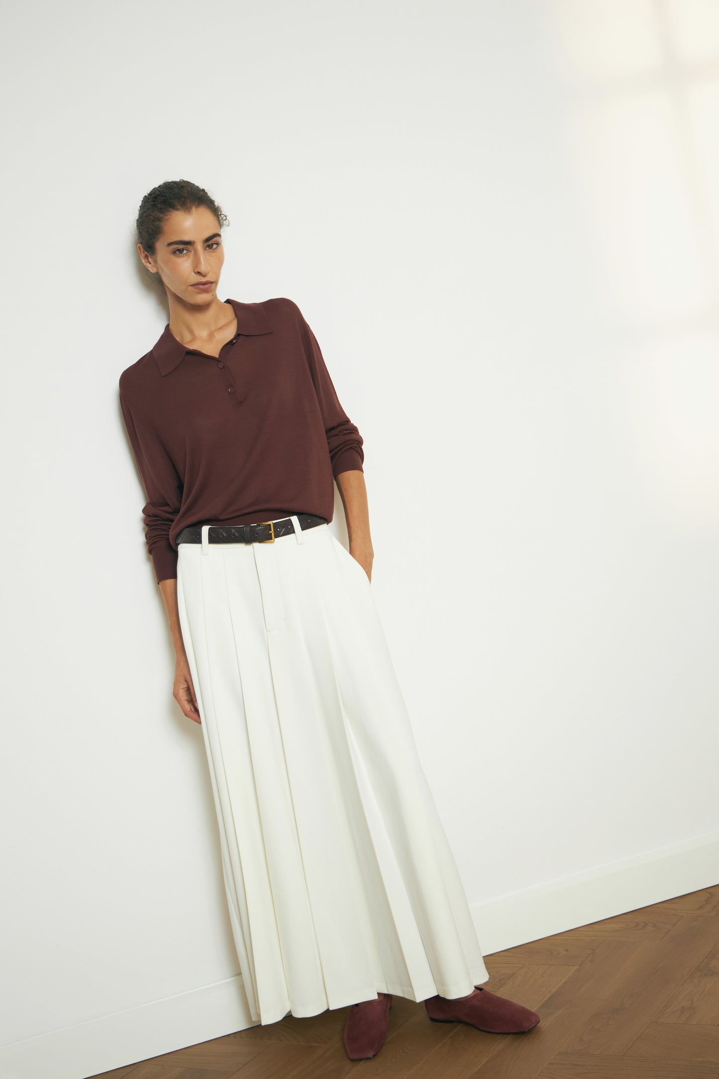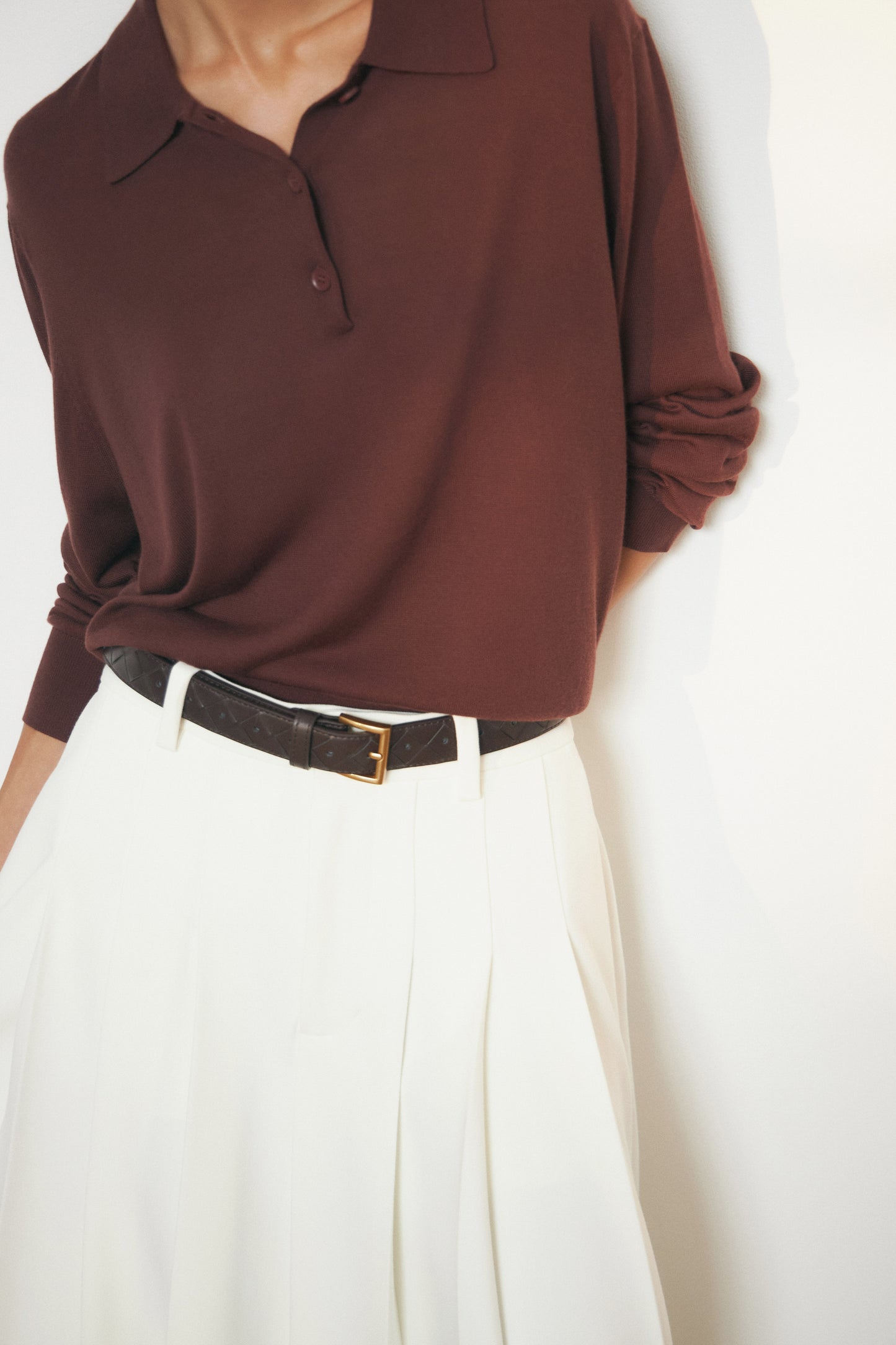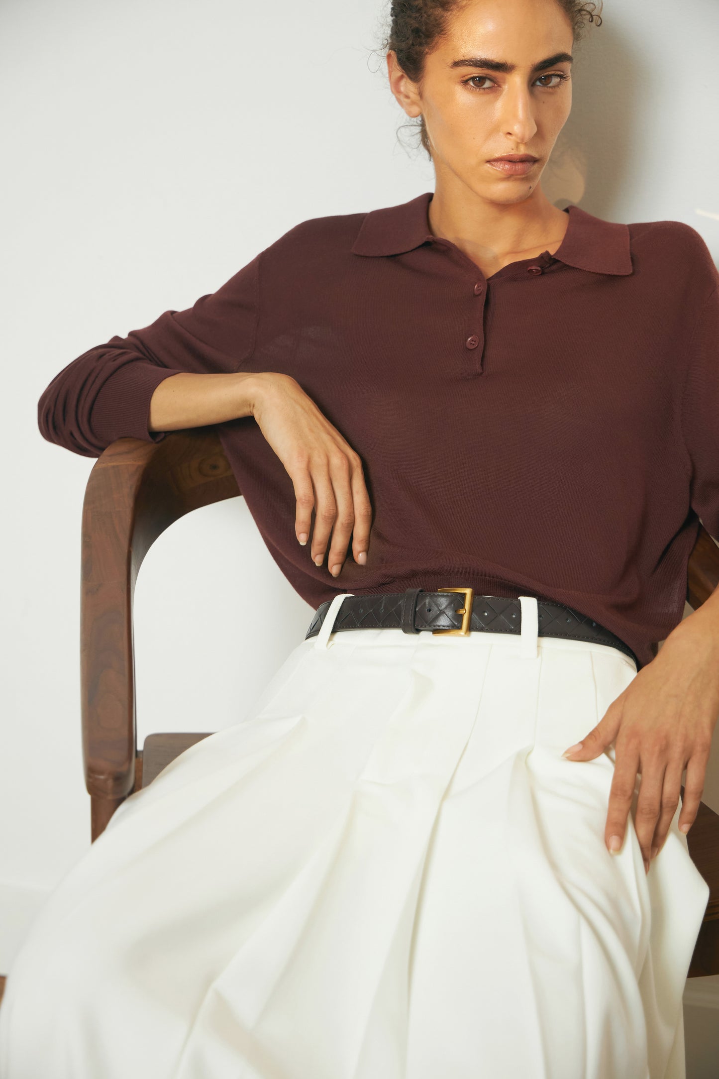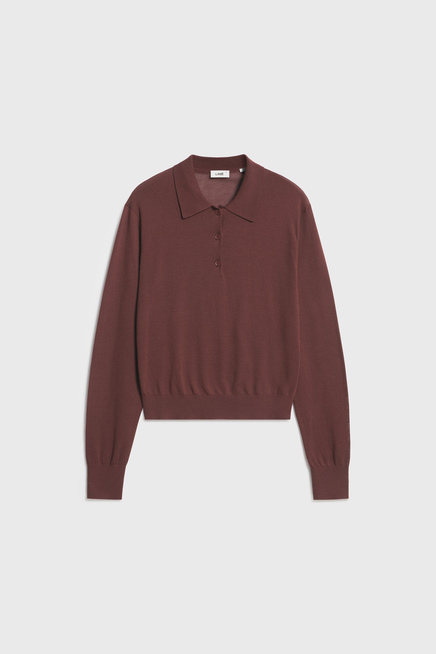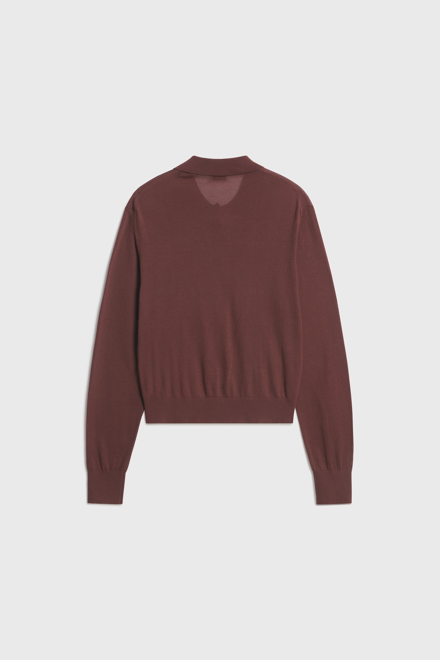 Long-sleeved polo sweater in a soft lyocell and wool knit. Styled with a collar, button placket and a straight-cut hem. Cropped and fitted silhouette.