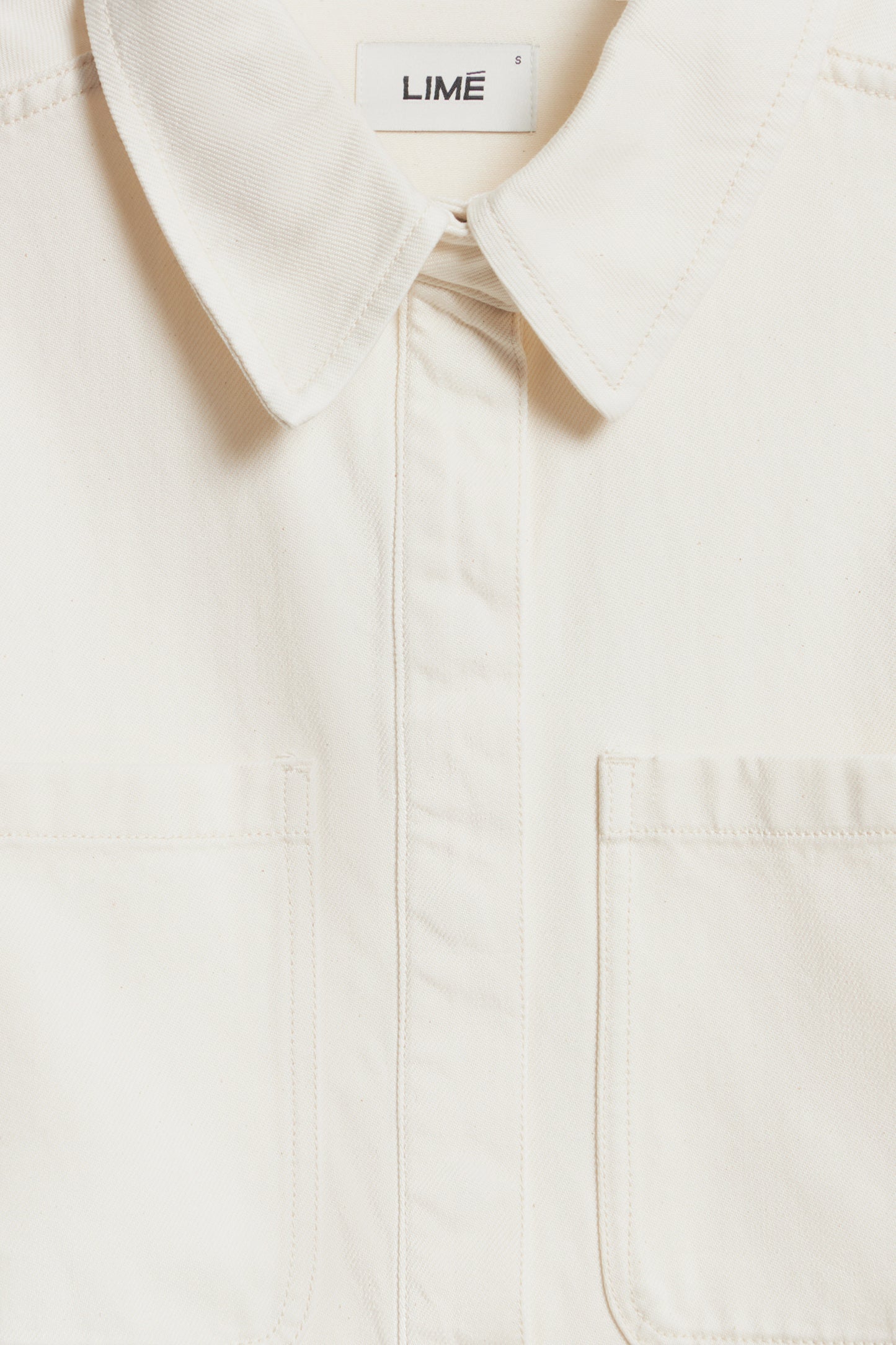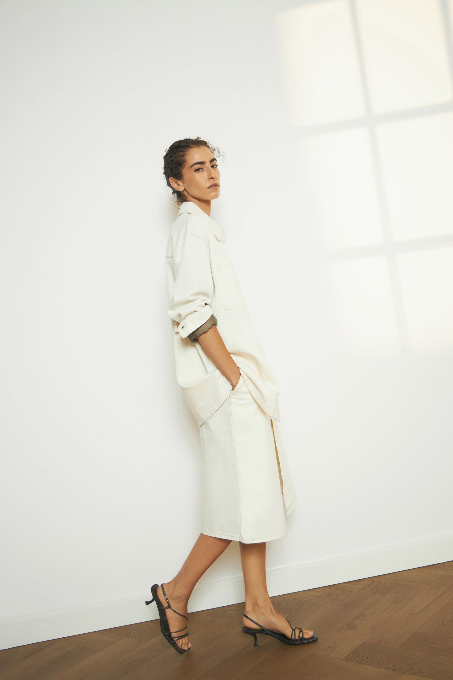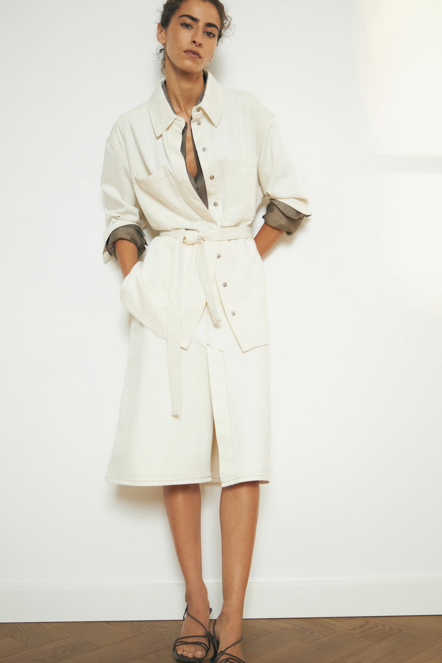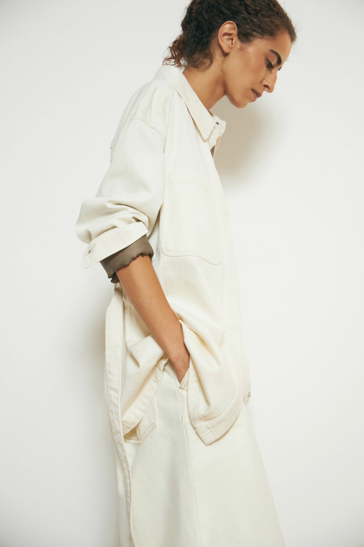 Collared shirt in soft lyocell and cotton denim. Straight fit. Large front patch pockets, detachable belt and hidden snap fastener. Long sleeves with metal button fastener at the cuffs.