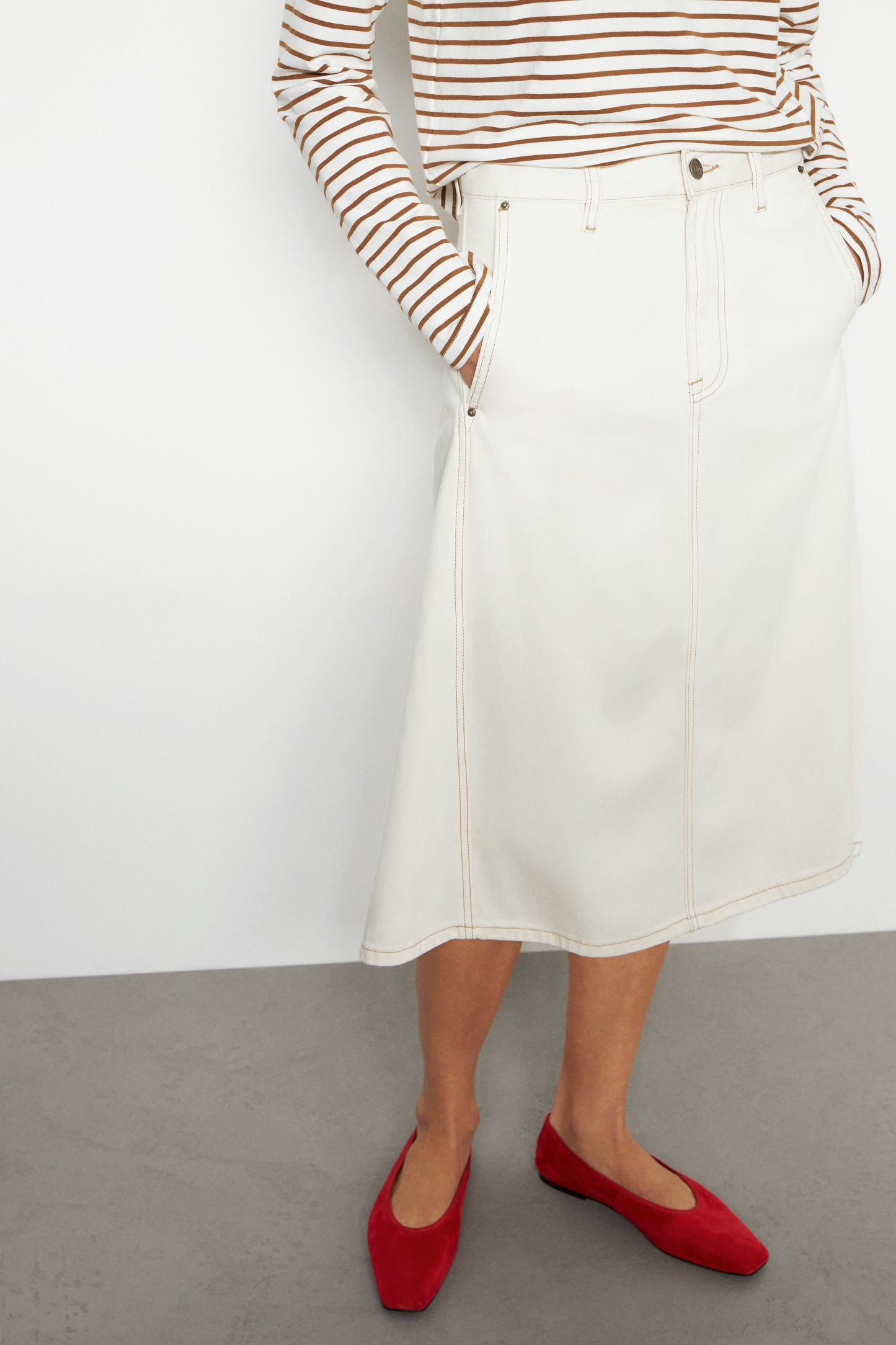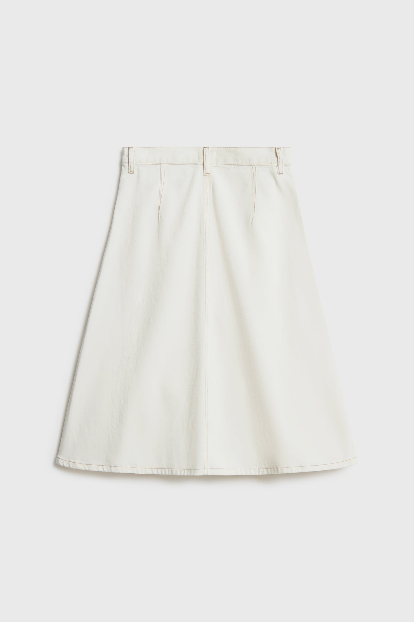 Knee-length skirt in faded denim crafted from a lyocell and cotton blend. Flared hem. Featuring side pockets, back patch pockets. Zip and metal button fastening.