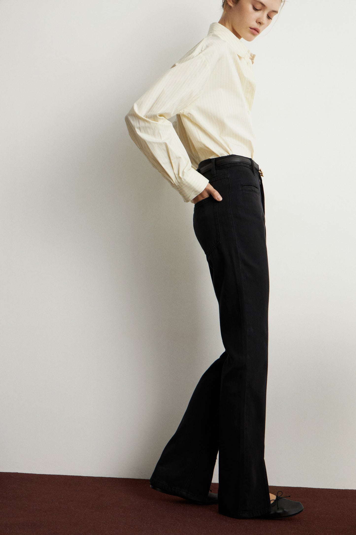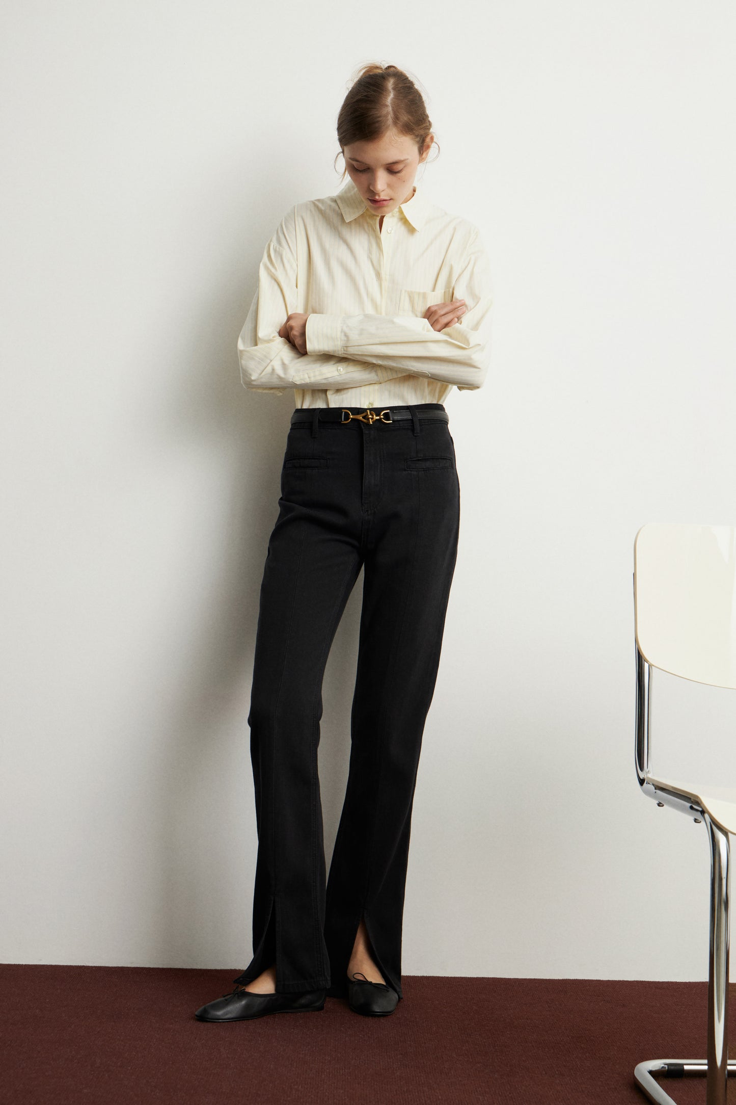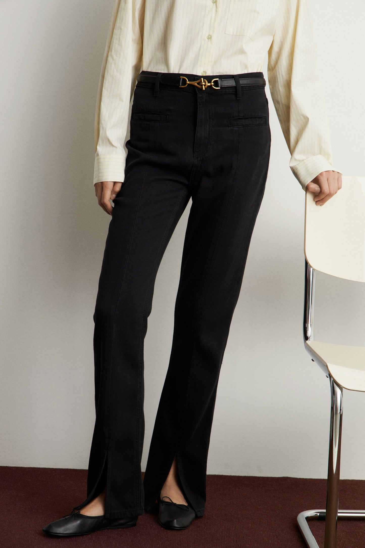 Mid-waist jeans in a lyocell and cotton blend plain denim. Straight leg featuring a visible seam and slit at hem. Fake welt pockets at front and patch pockets art back. Front zip fly and metal button fastening.