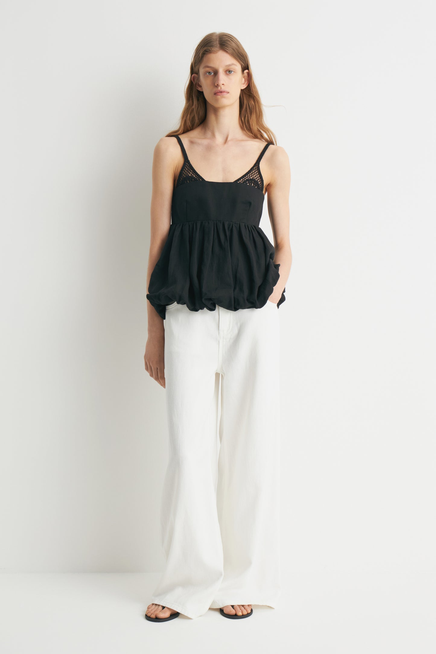 A prelude to the warmer months, this top is crafted from a lightweight lyocell and linen blend that lends itself to balmy weather. this piece with a sweetheart neckline, spaghetti shoulder straps and a smocked section at the back. Crochet-look insert on the bodice and a flared peplum with a bubble hem for a puffy silhouette. Soft cotton blend lining.