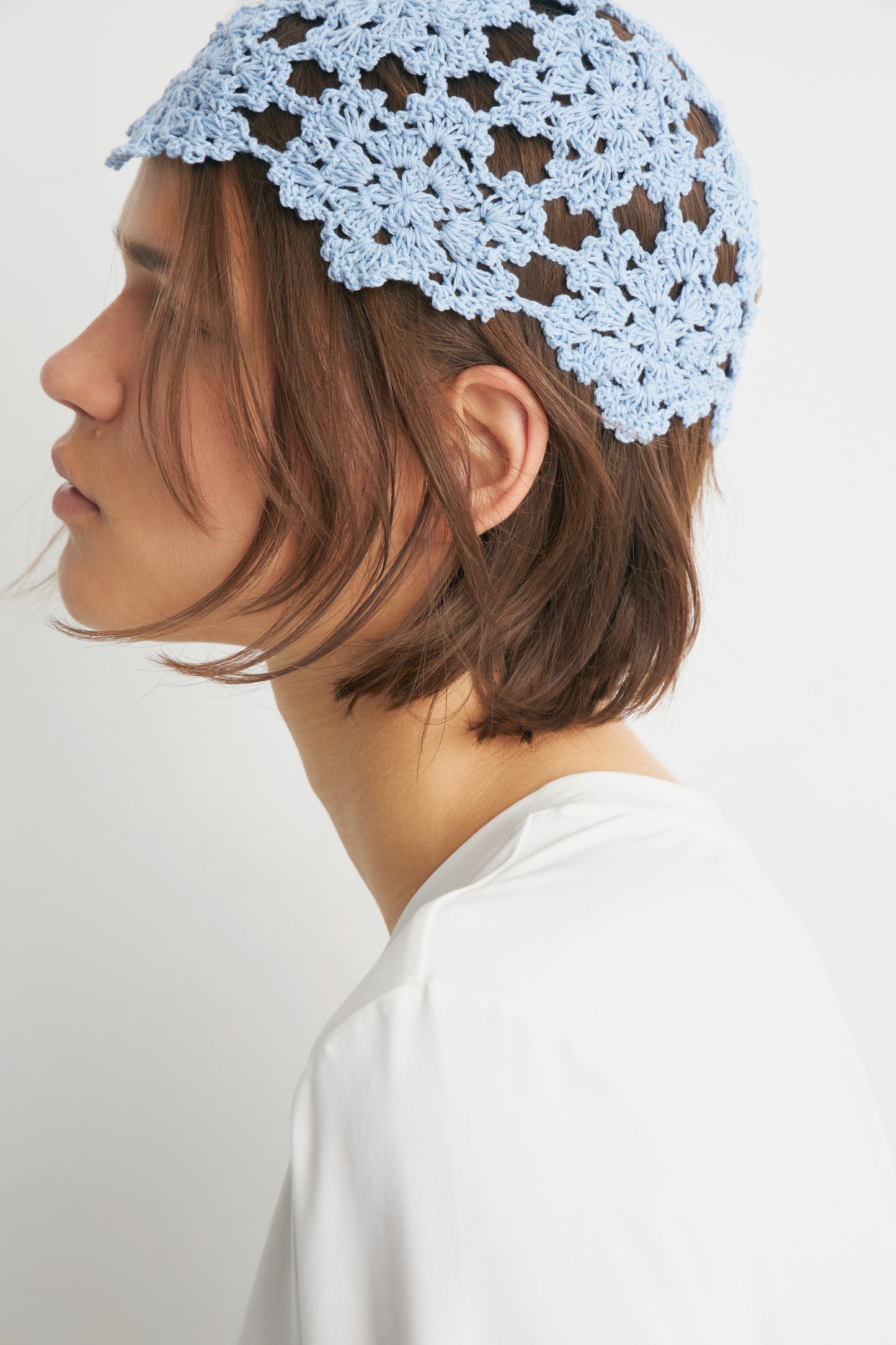Crocheted beanie in soft cotton yarn. Finished with scalloped-edge trim.