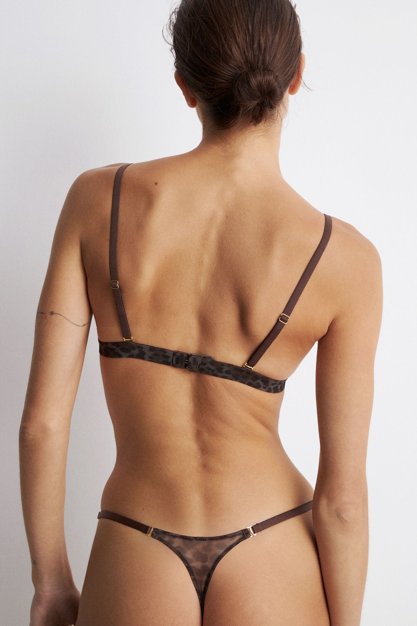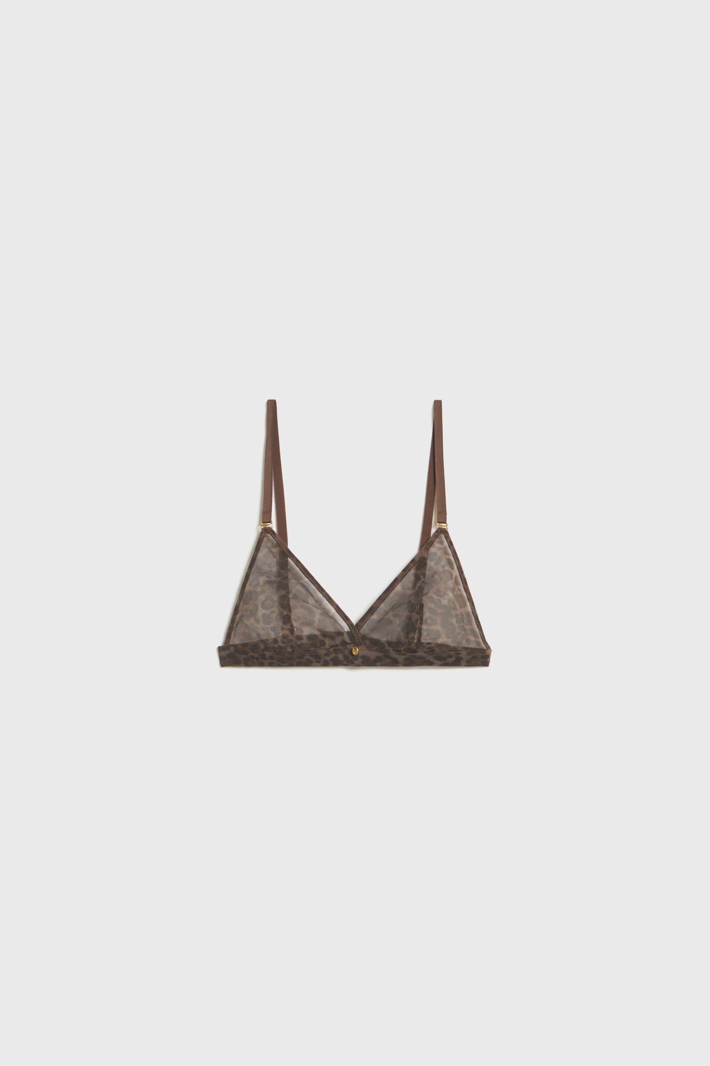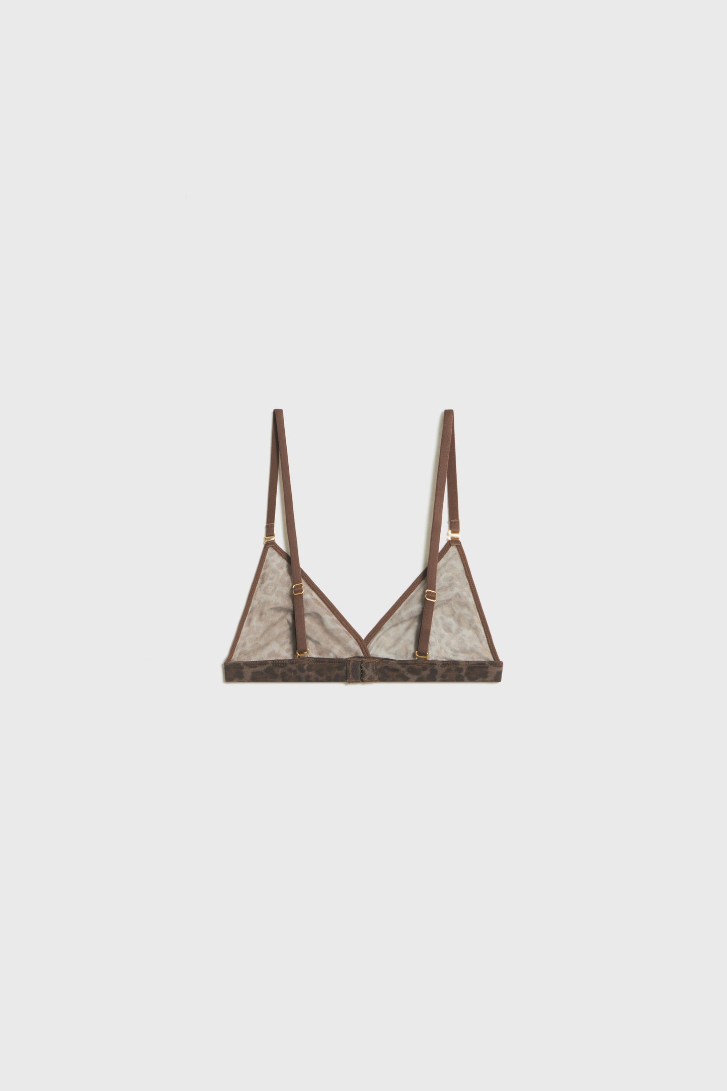 Non-padded bra in mesh fabric with triangle cups that give the bust a natural shape and light support. Metal appliqué at the front. Adjustable shoulder straps and a hook-and-eye fastening at the back.