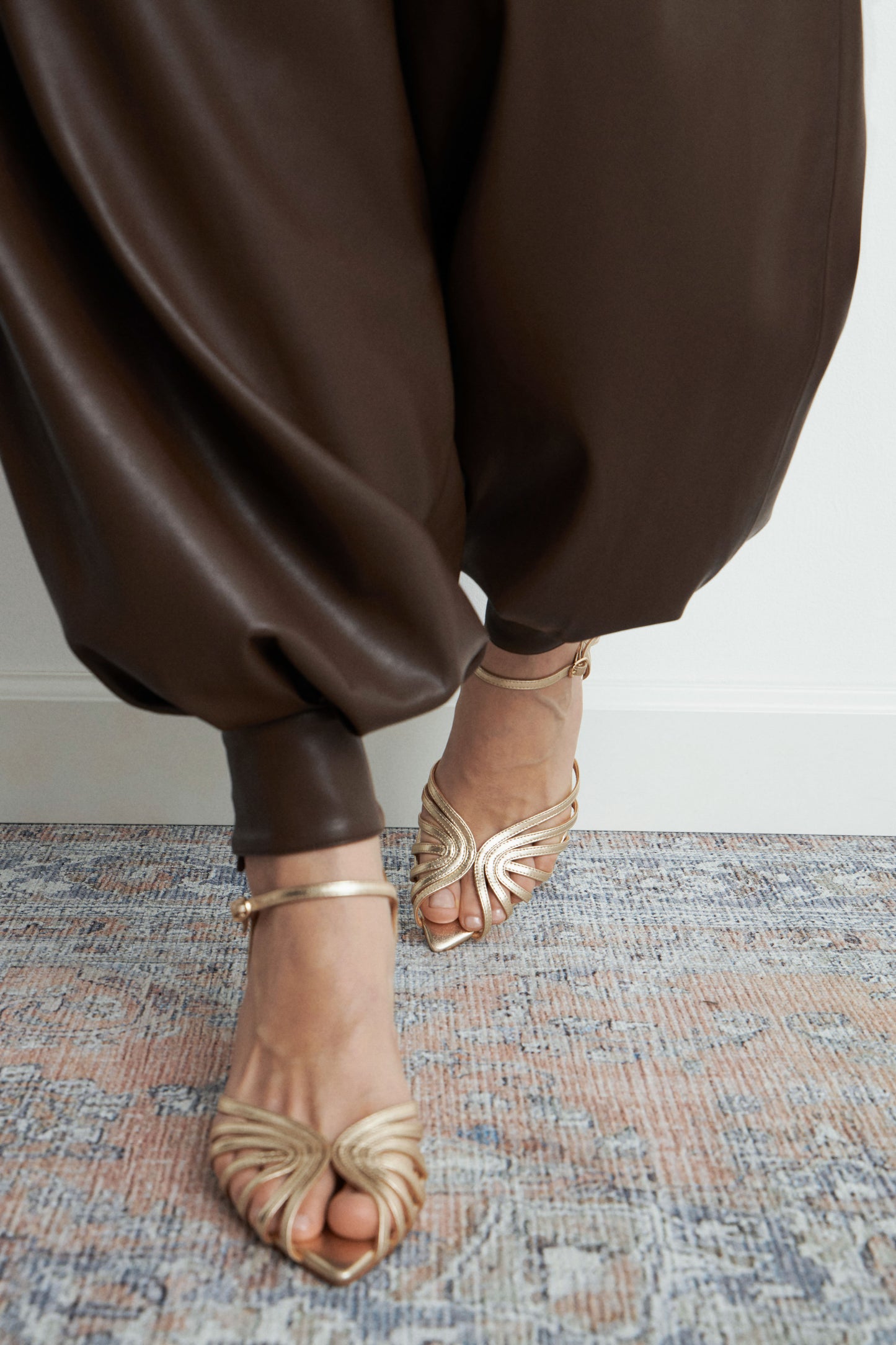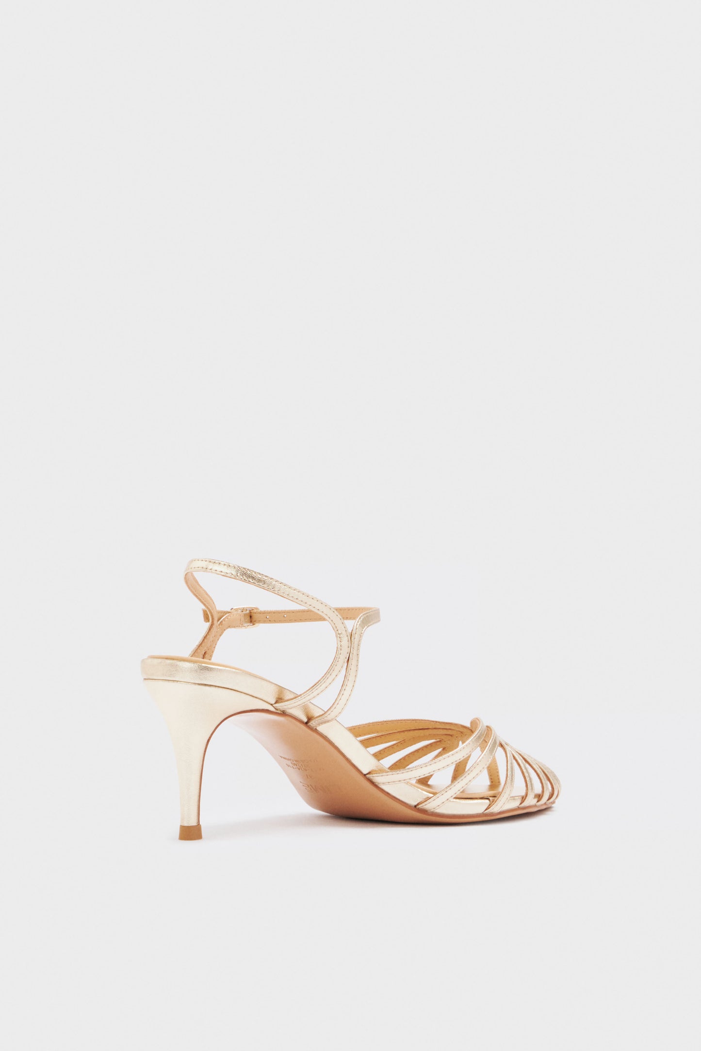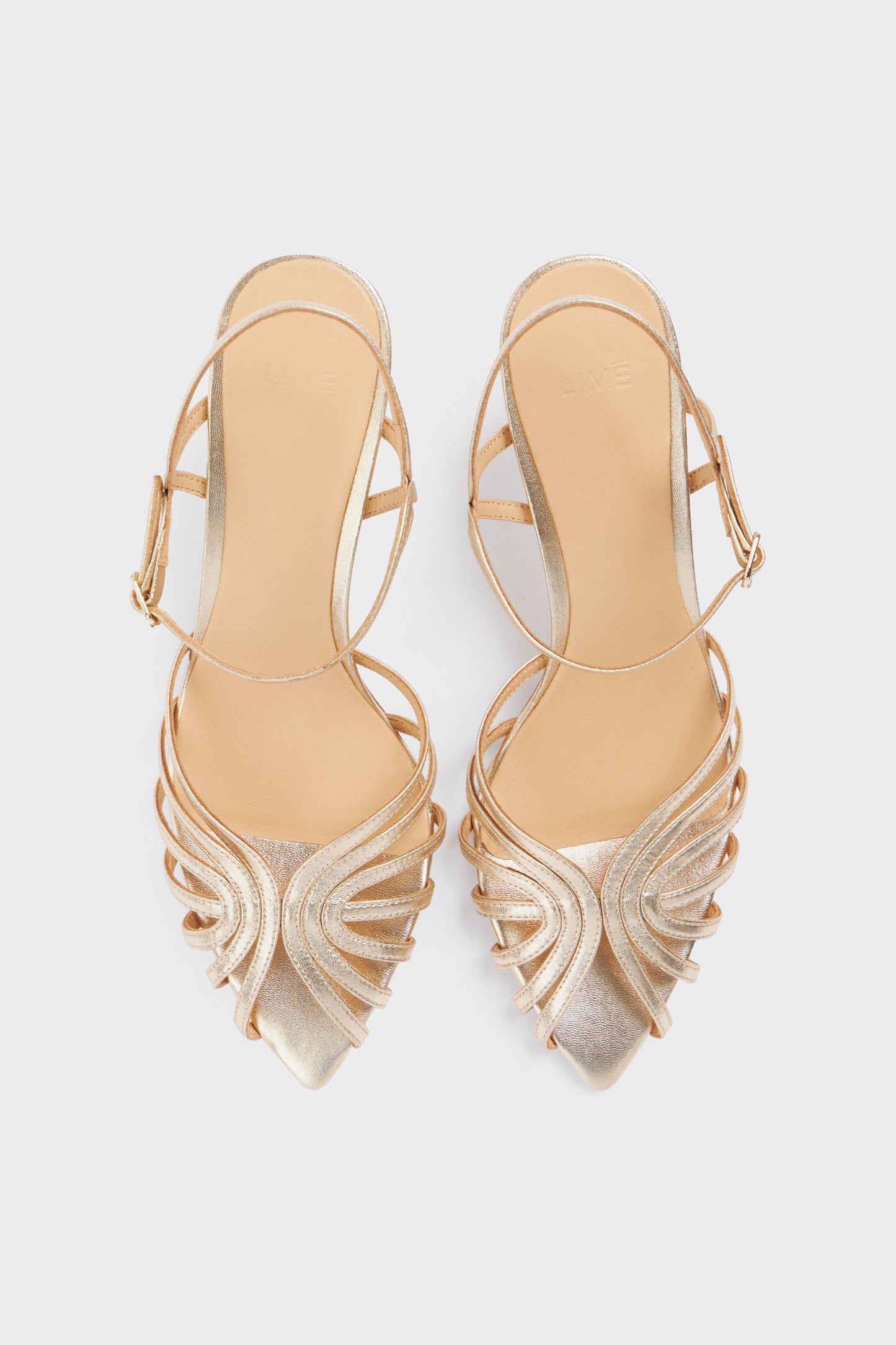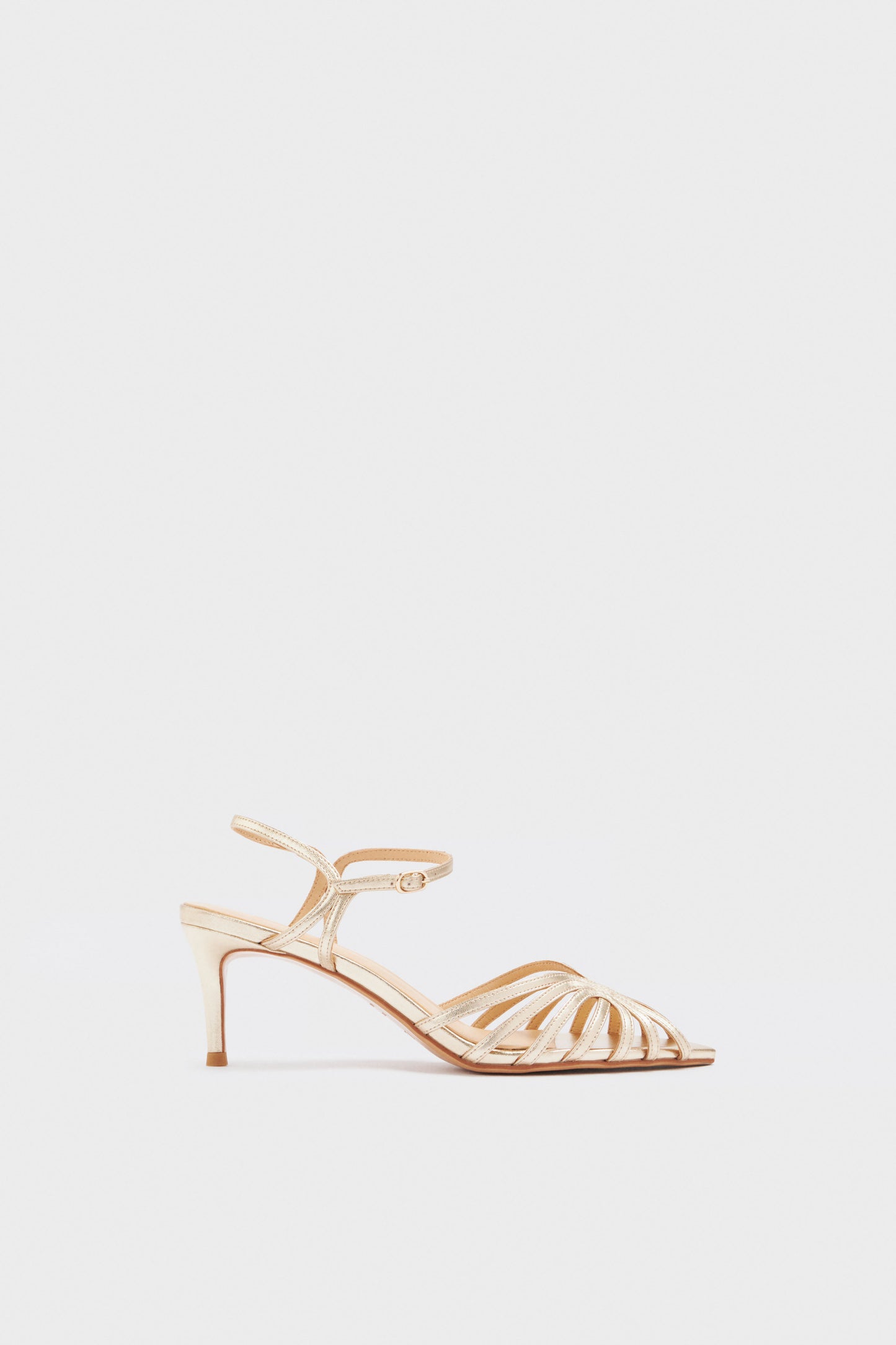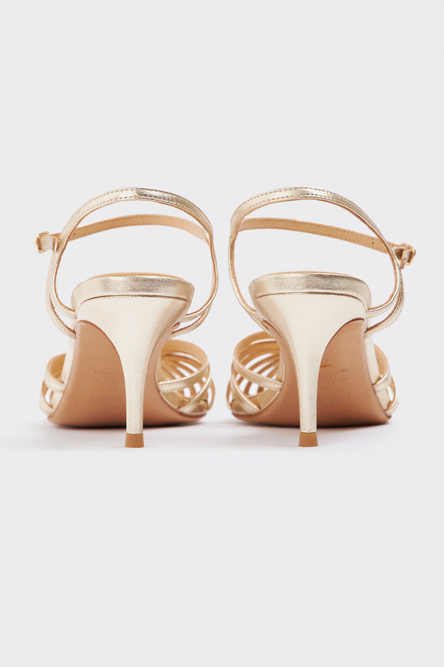 Heeled sandals in coated fabric with pointed toes, narrow heels, a foot straps and a narrow, adjustable ankle strap with a metal buckle. Leather linings and insoles. Your purchases are delivered with a fabric bag.