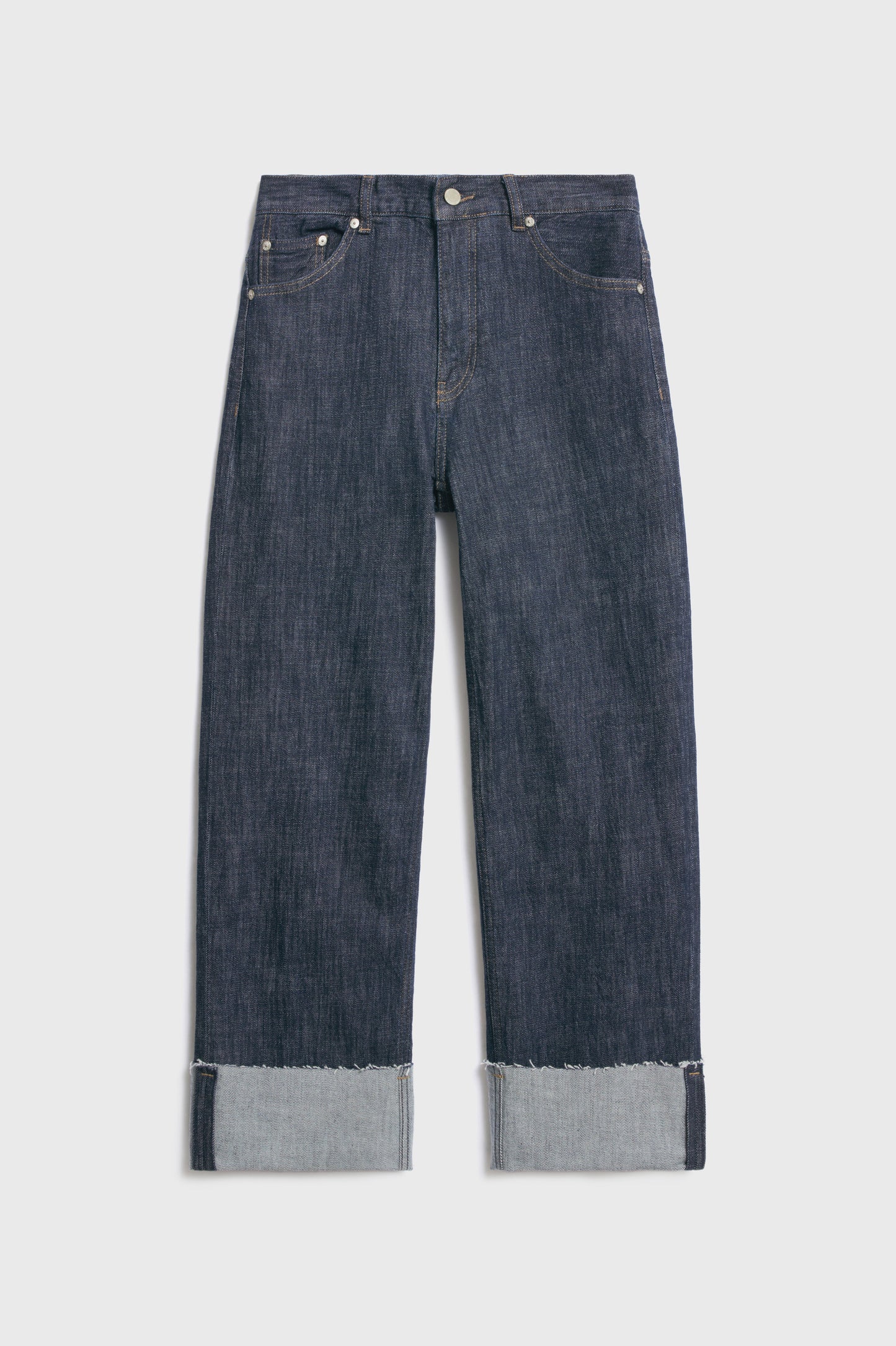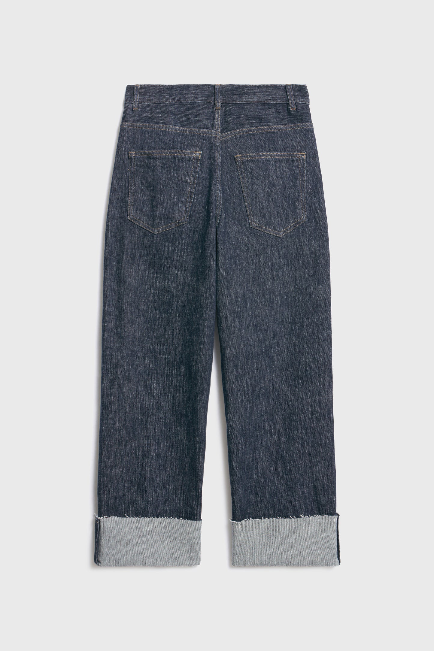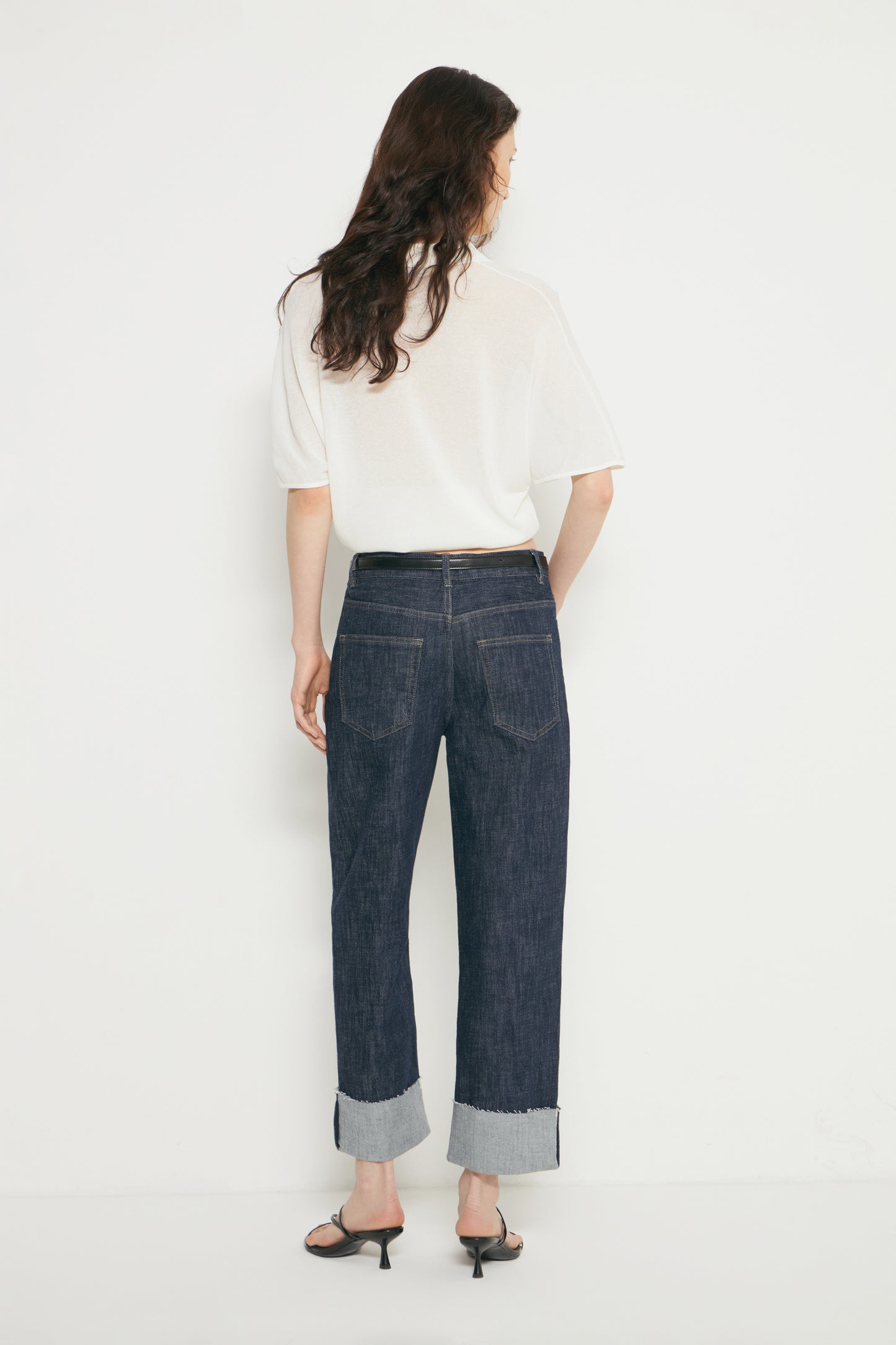 Mid-waist jeans with a five-pocket design made from stretchy denim. The straight legs have wide turn-up cuffs with raw edges that crop at the ankle. Front zip fly and metal button fastening.