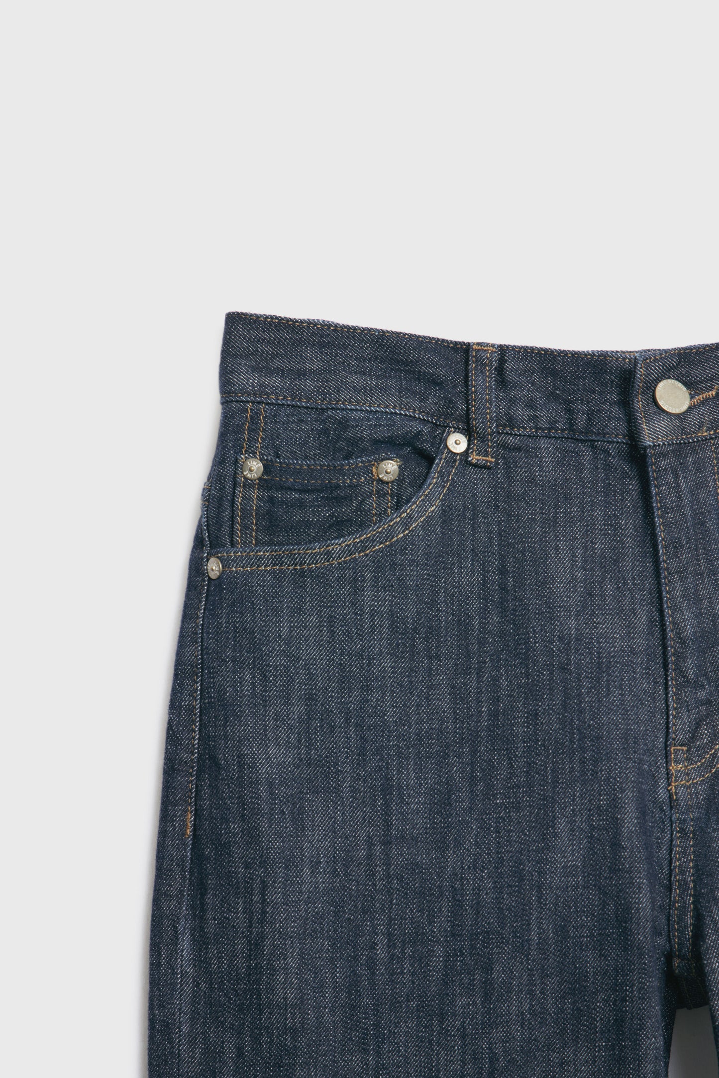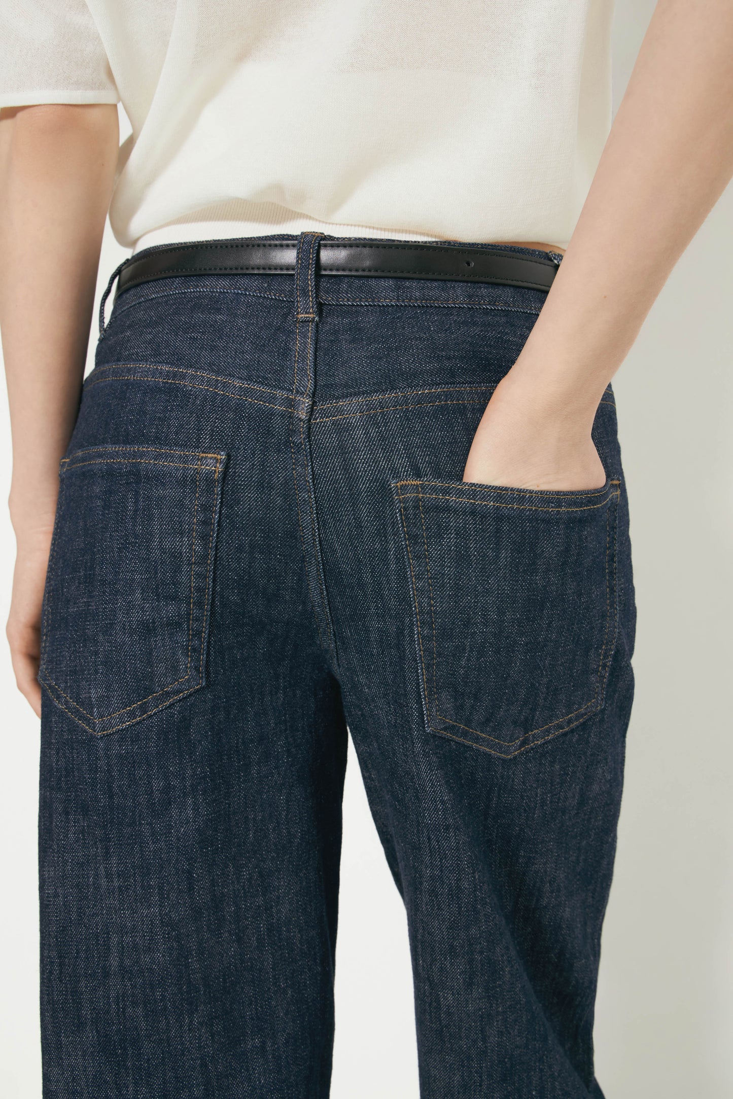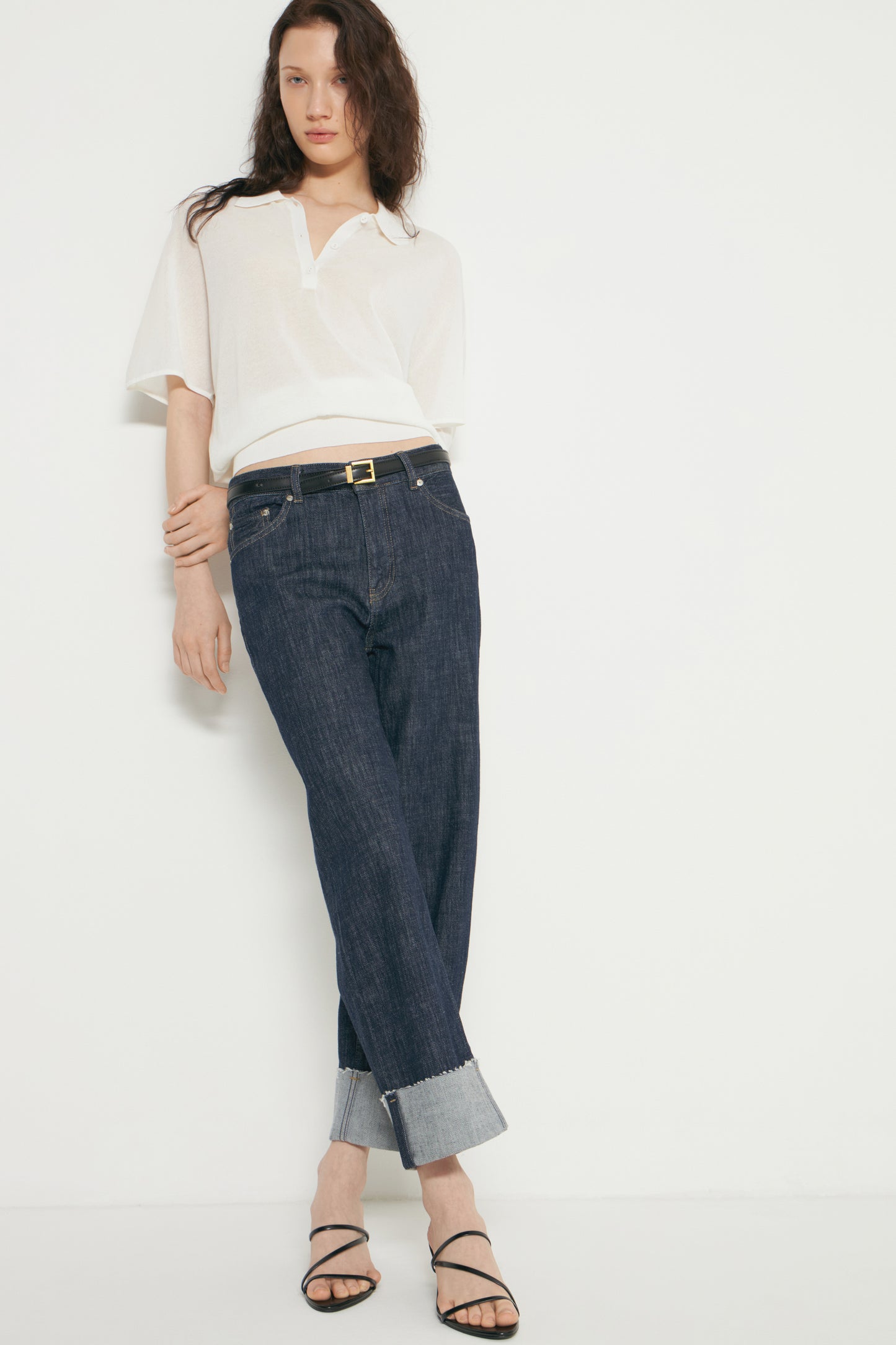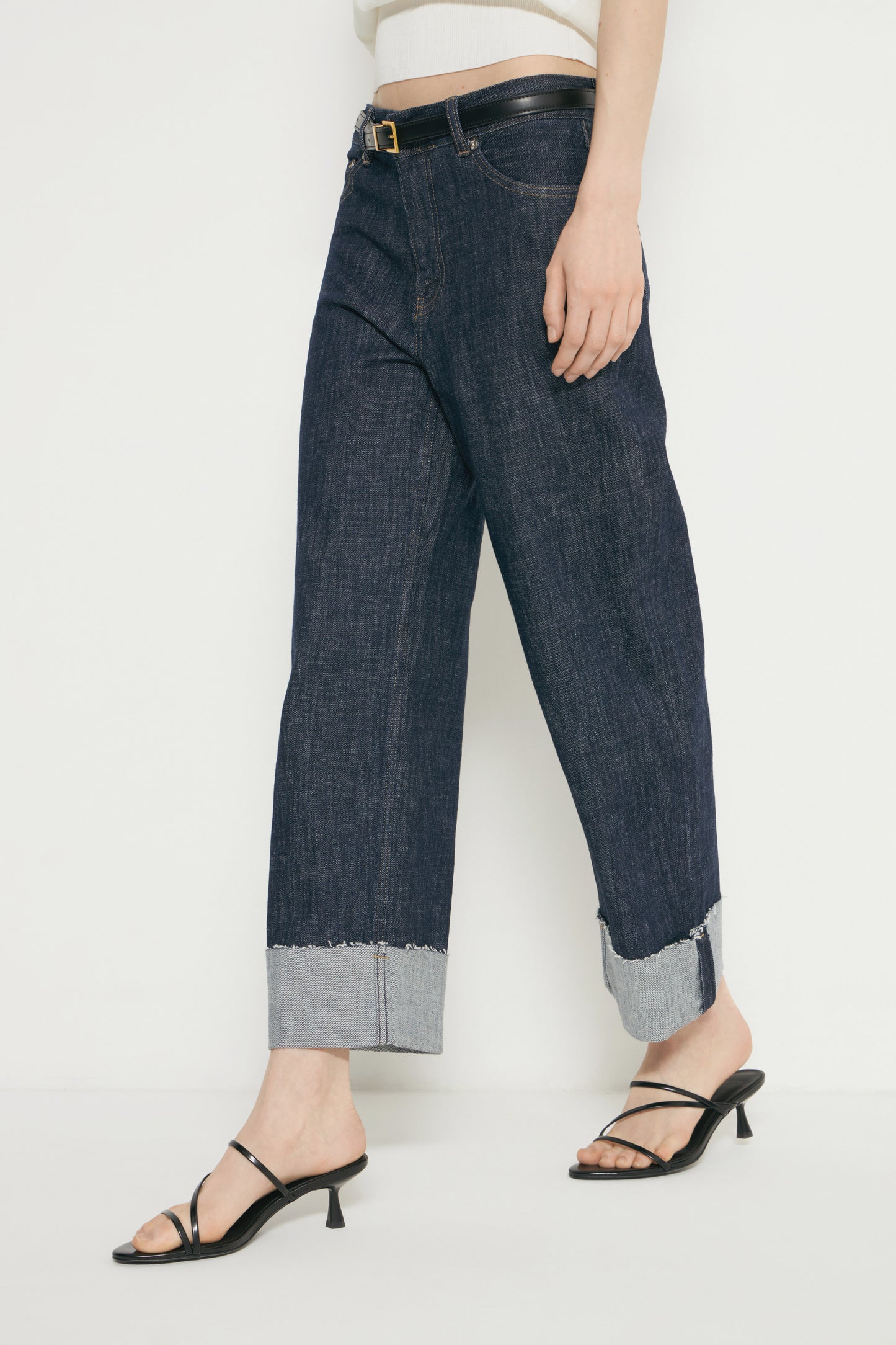 Mid-waist jeans with a five-pocket design made from stretchy denim. The straight legs have wide turn-up cuffs with raw edges that crop at the ankle. Front zip fly and metal button fastening.