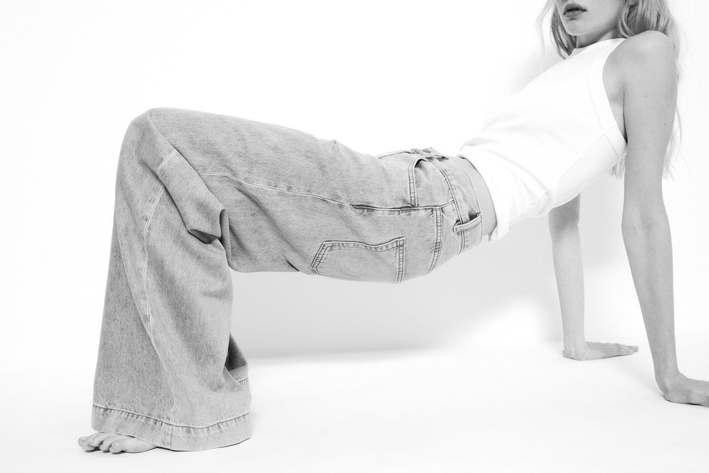 Mid-waist jeans with wide legs. Faded effect. Five pockets. Front zip fly and top button fastening.