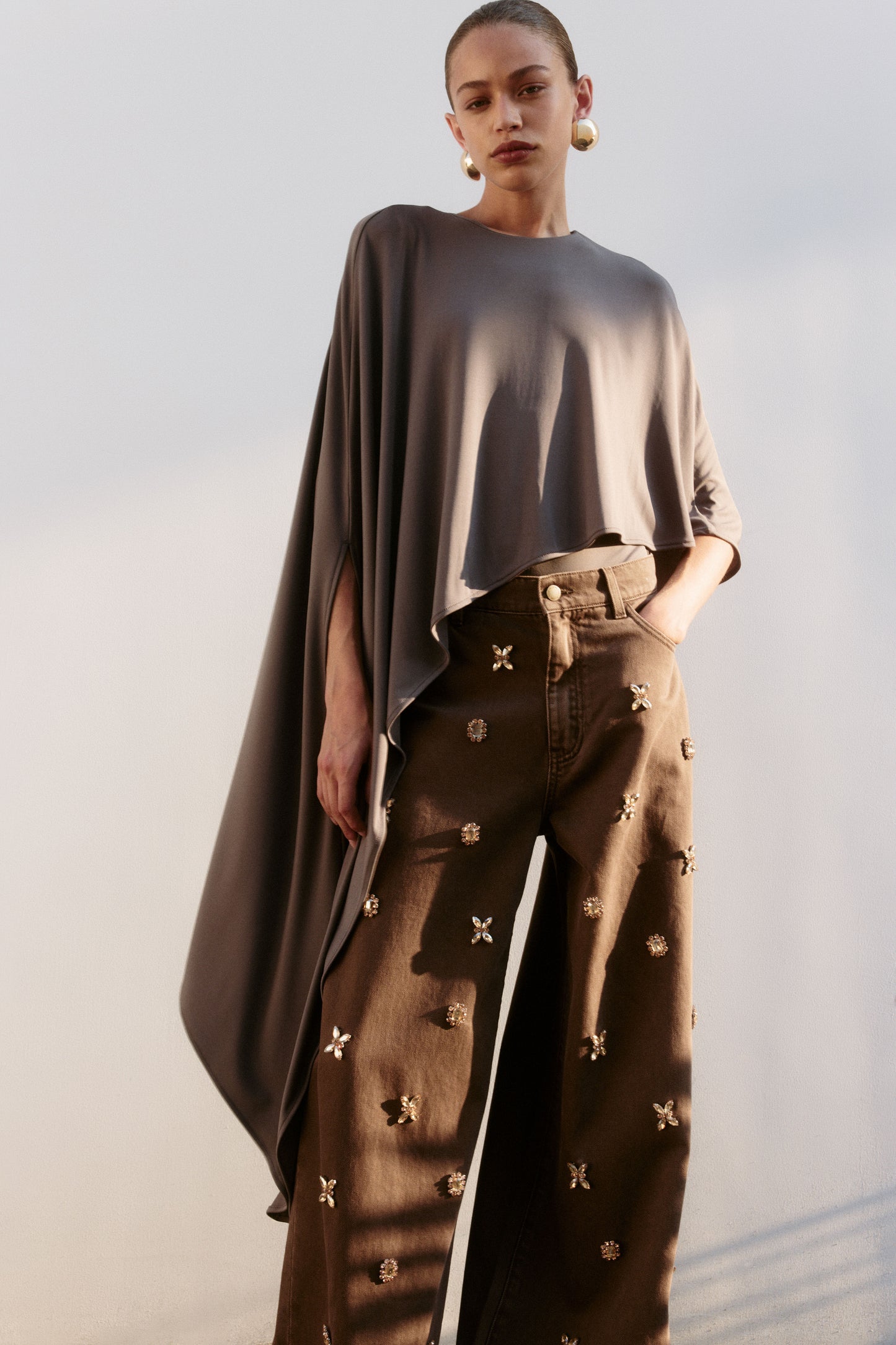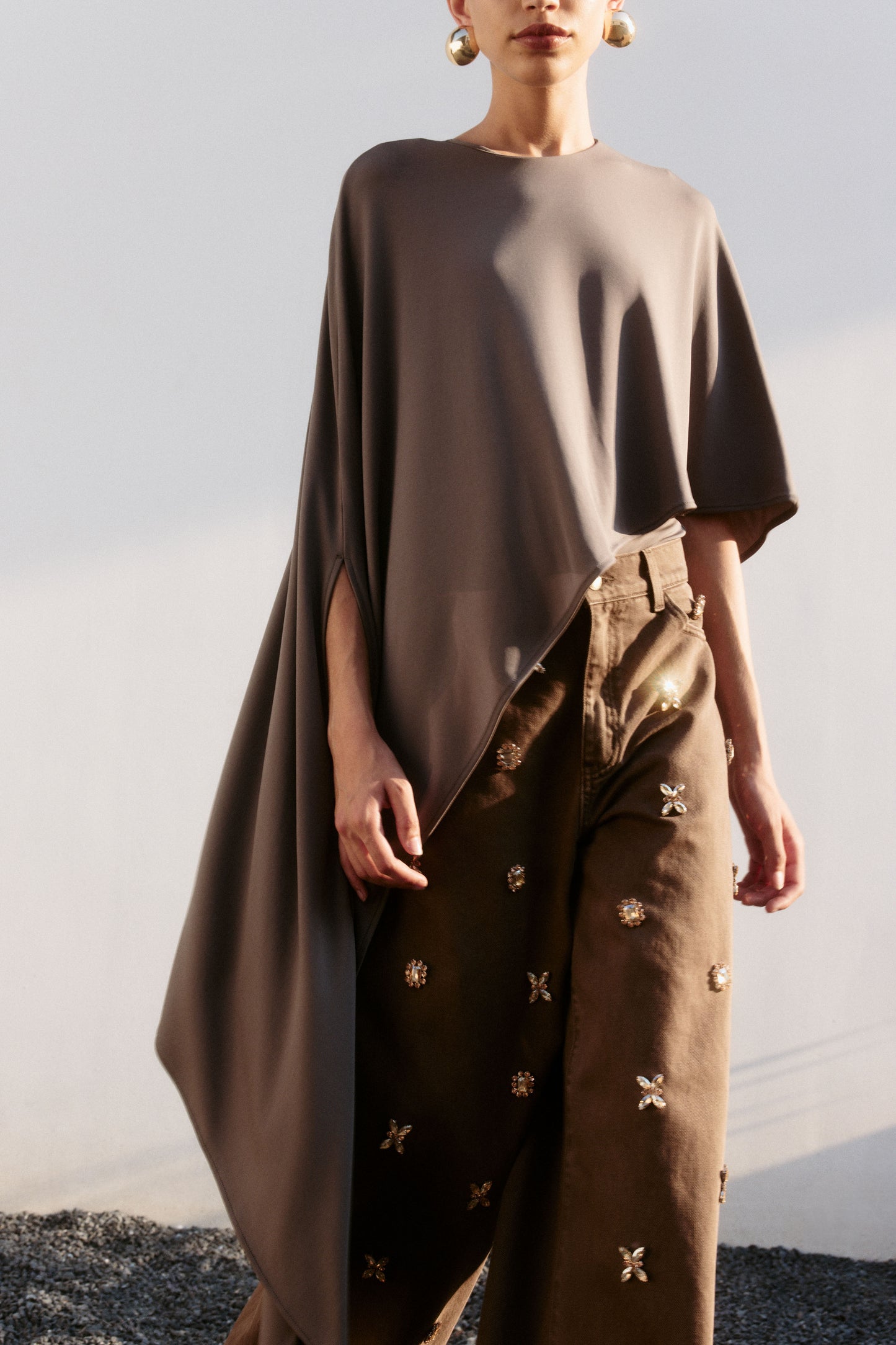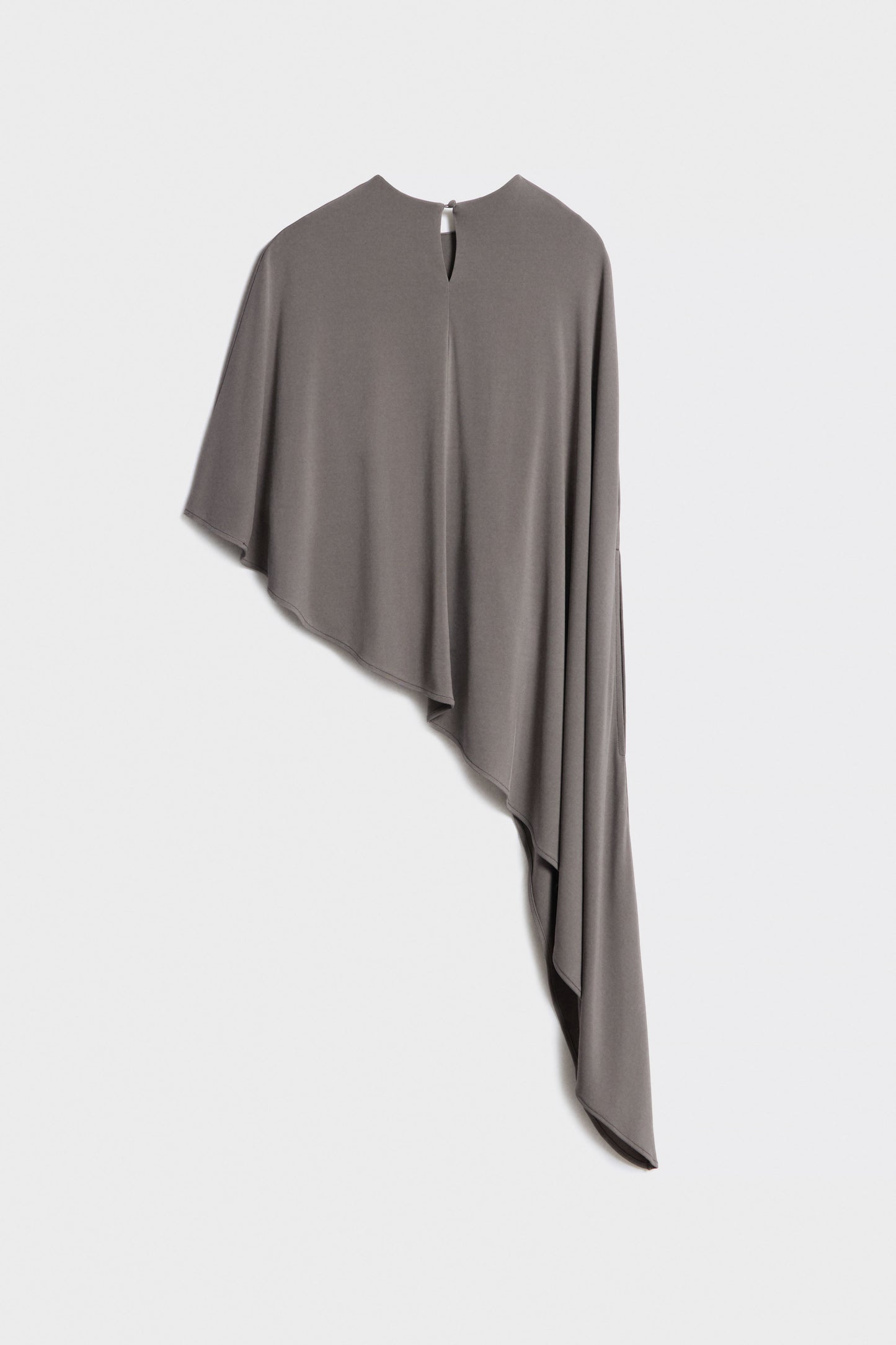 Asymmetric set in a viscose blend. Fitted inner top. Layered fabric in a multi-position cape style. Button closure at back.
