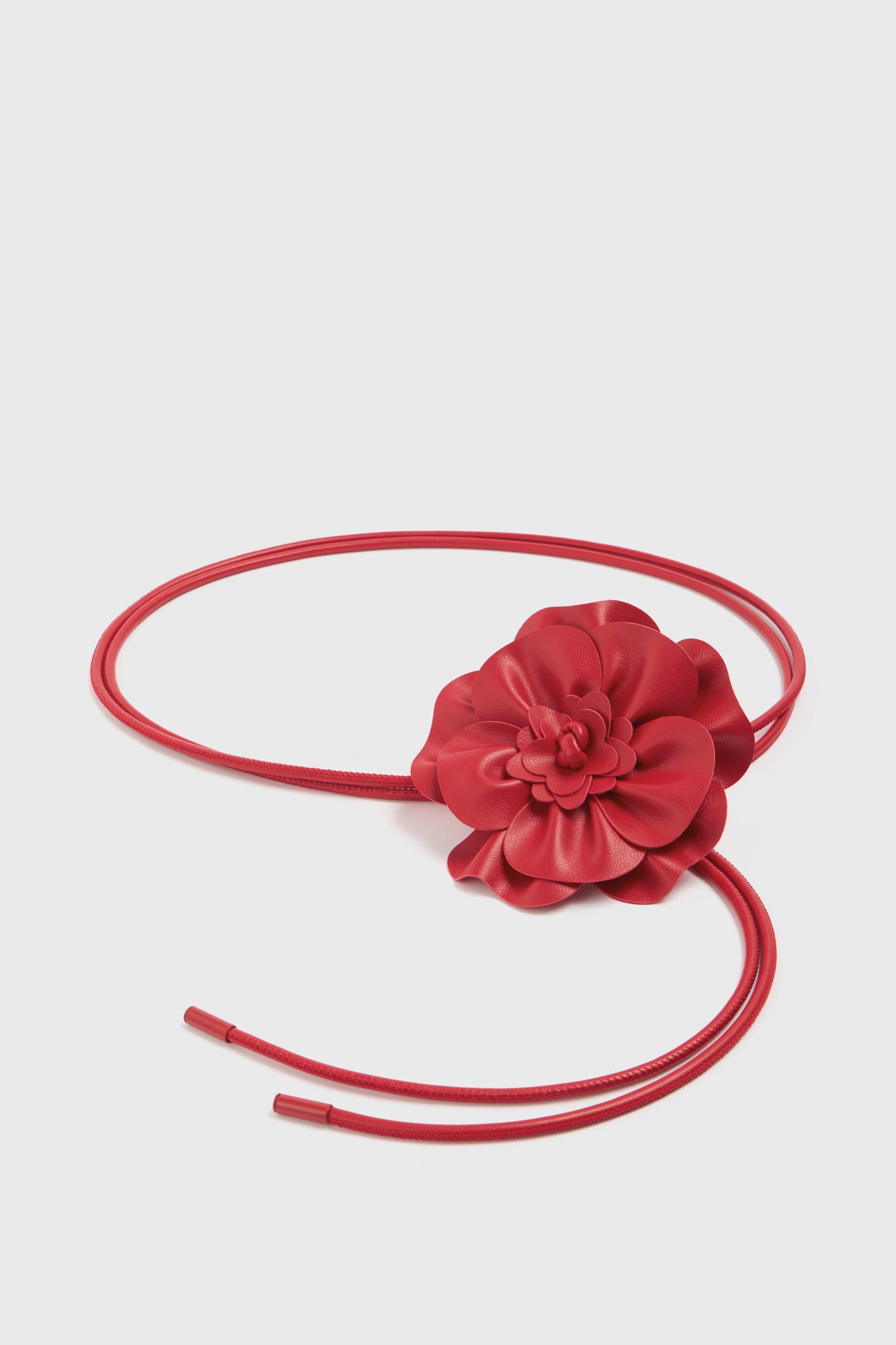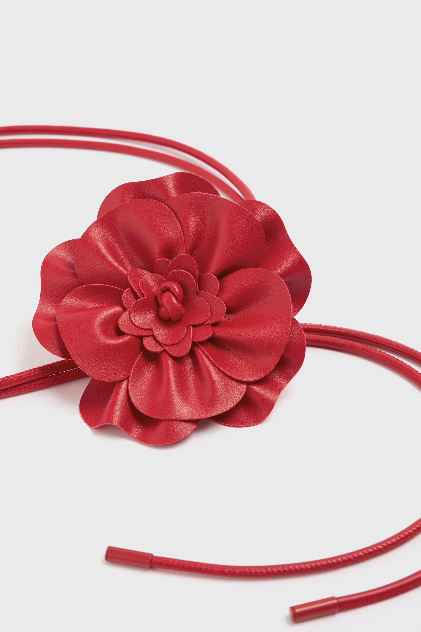 Narrow tie belt in coated fabric with large flower-shaped appliqué. ONE SIZE: 255 x 0,6 cm