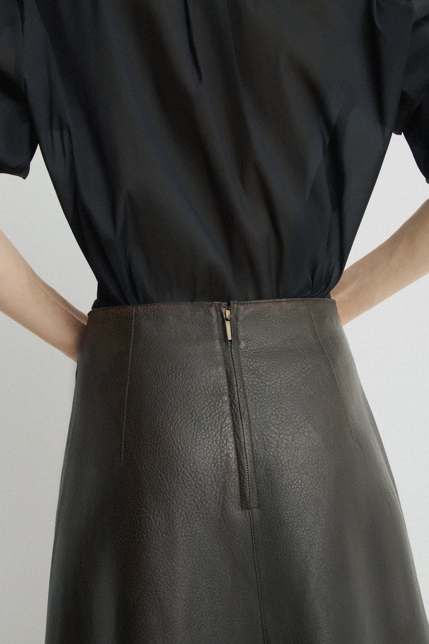 Contemporary look on safari style defines the essence of the calf-length skirt crafted from grained buffalo leather. Lined. Metal zip at the back.
