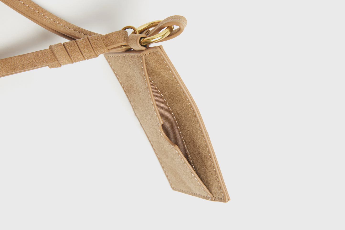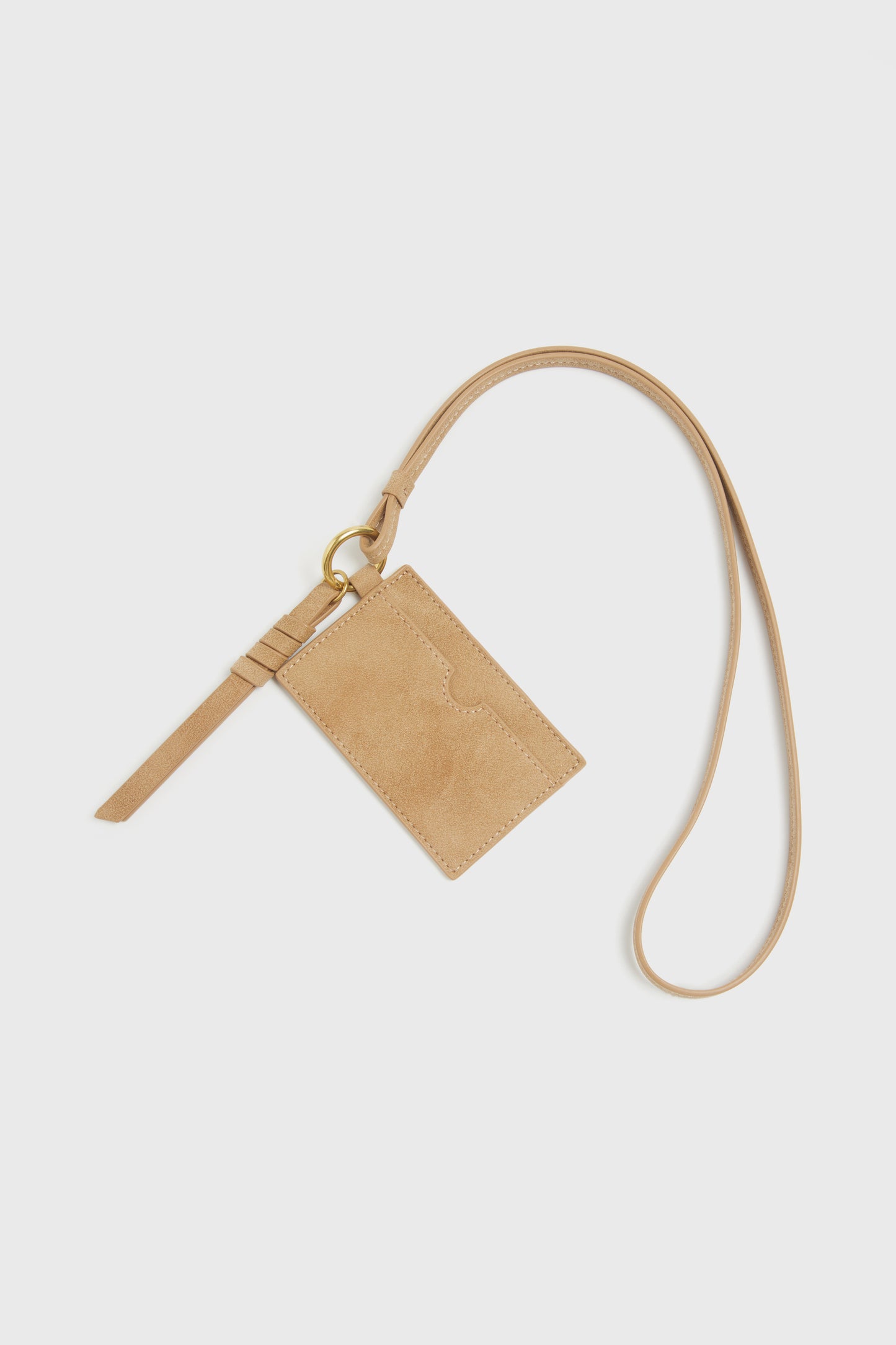 Cardholder in faux suede has one compartment at the top and a neck strap. Card compartment on the outside. ONE SIZE: 10 x 0,5 x 6,5 cm