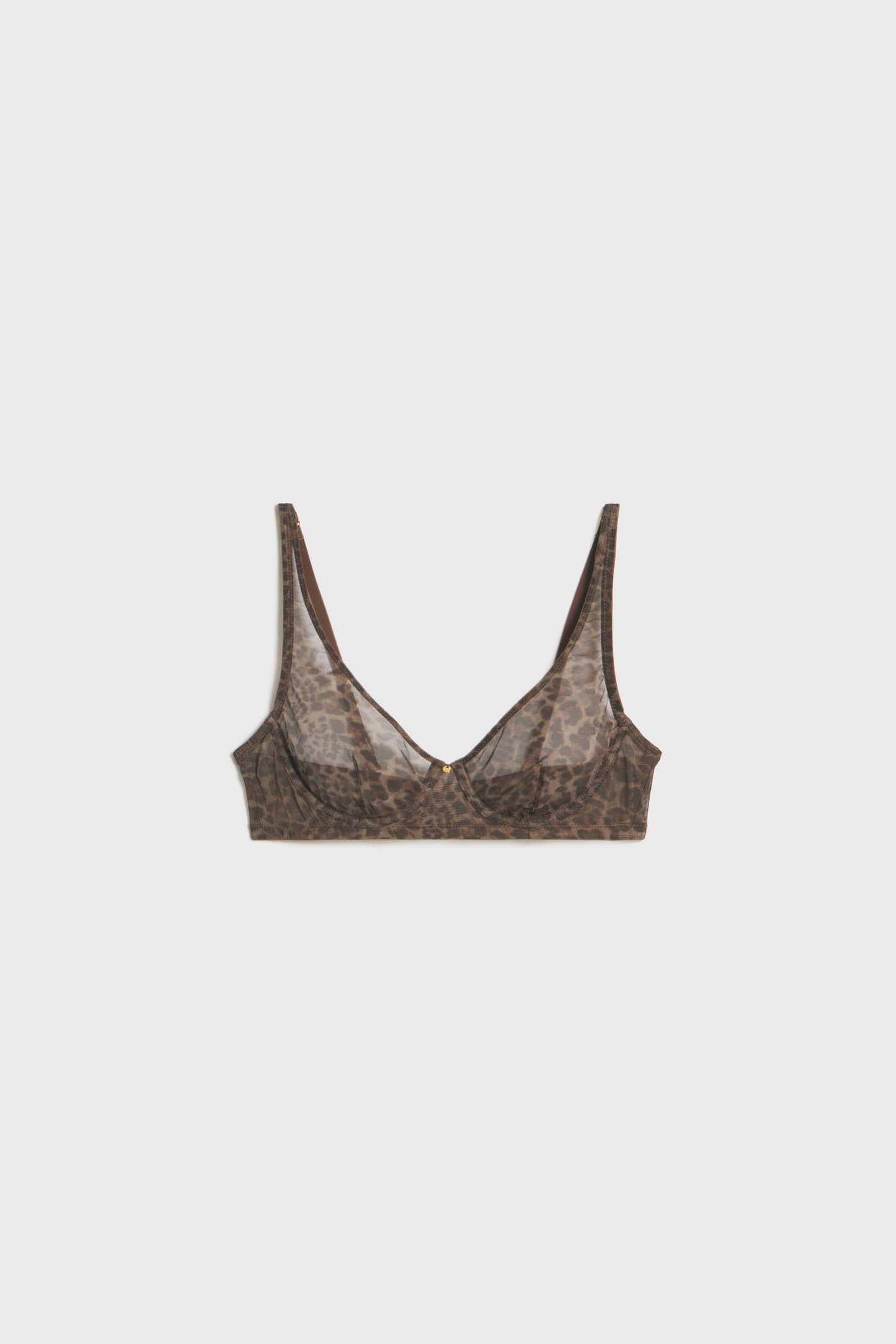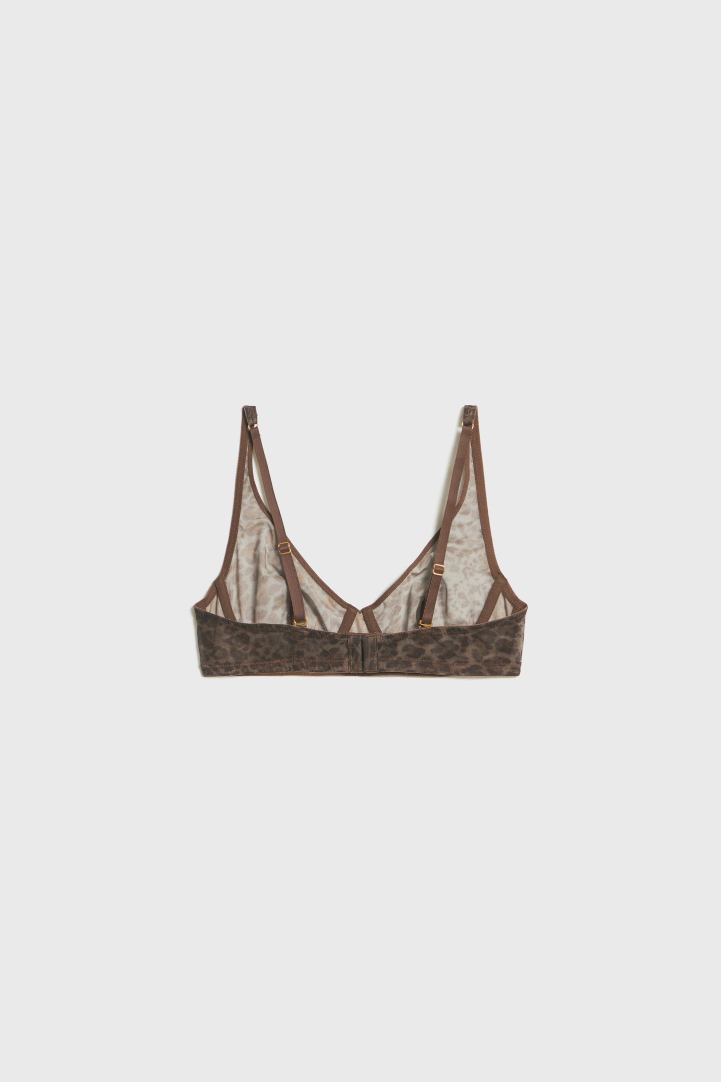 Non-padded bra in mesh fabric with triangle cups that give the bust a natural shape and light support. Adjustable shoulder straps and a hook-and-eye fastening at the back.