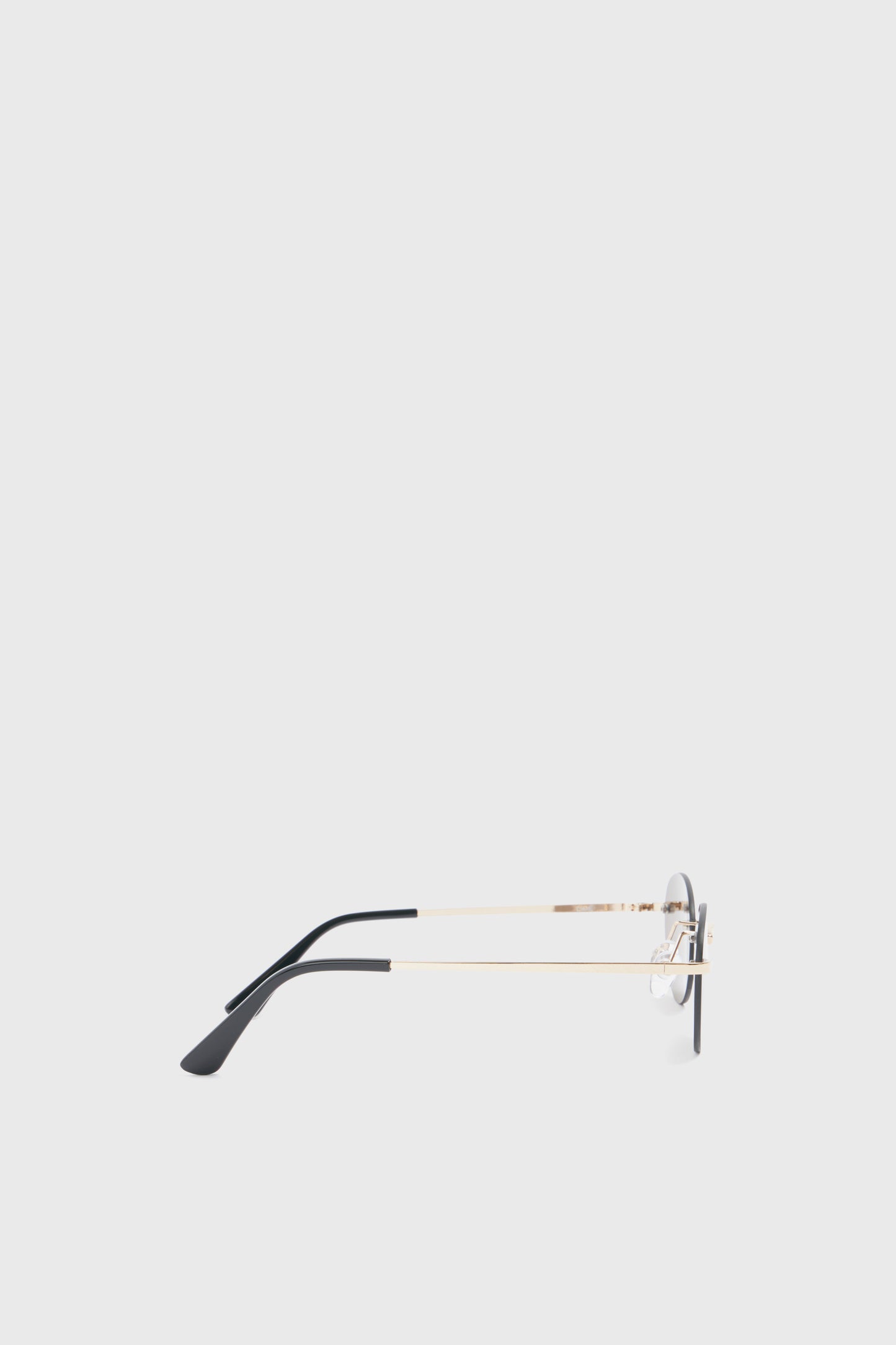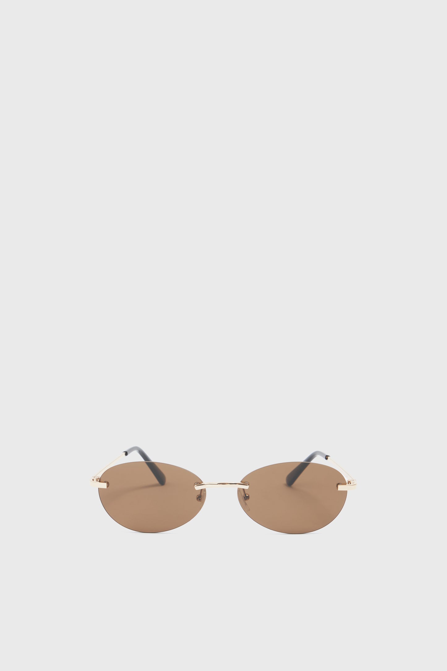 Oval sunglasses with metal sidepieces. Frameless design. UV-protective lenses connected by metal bridge. Case included.