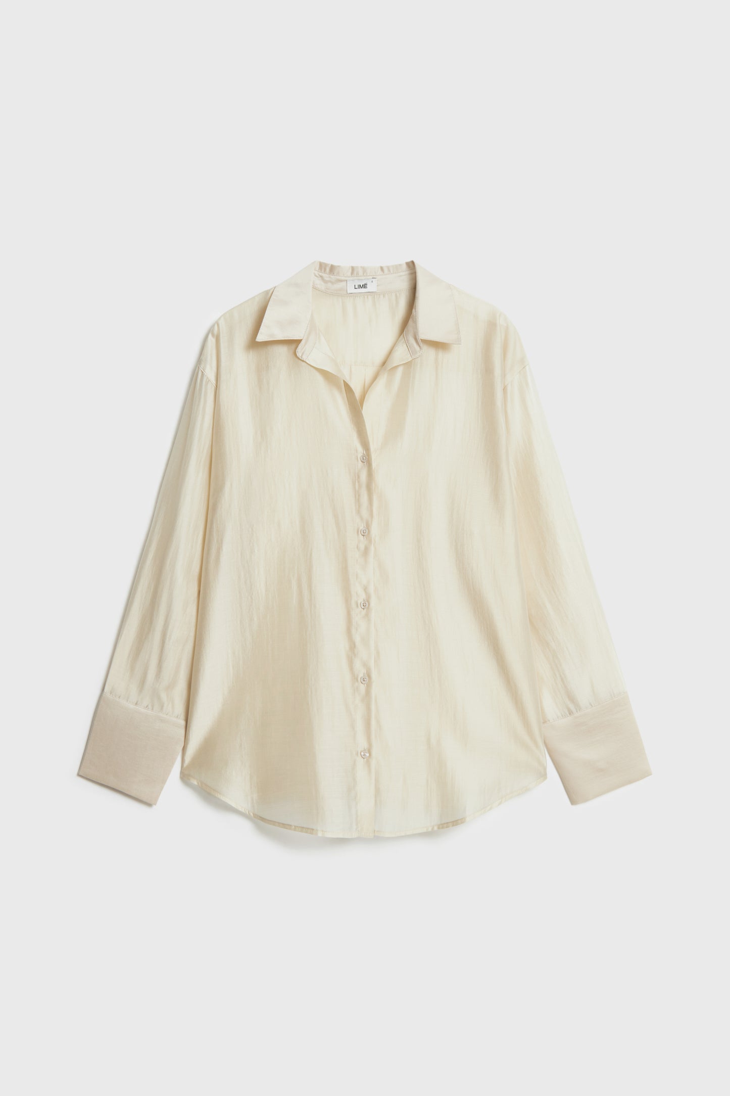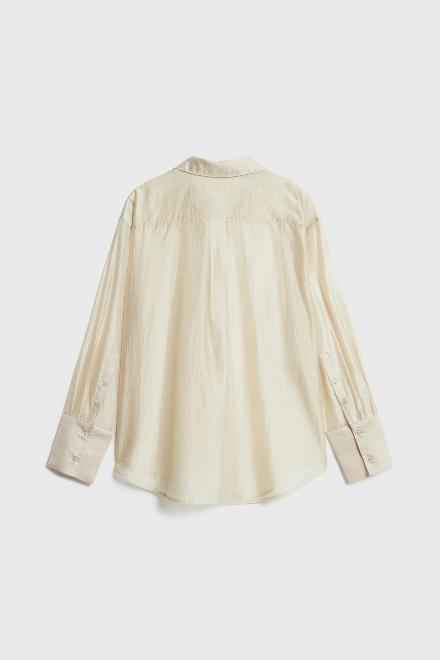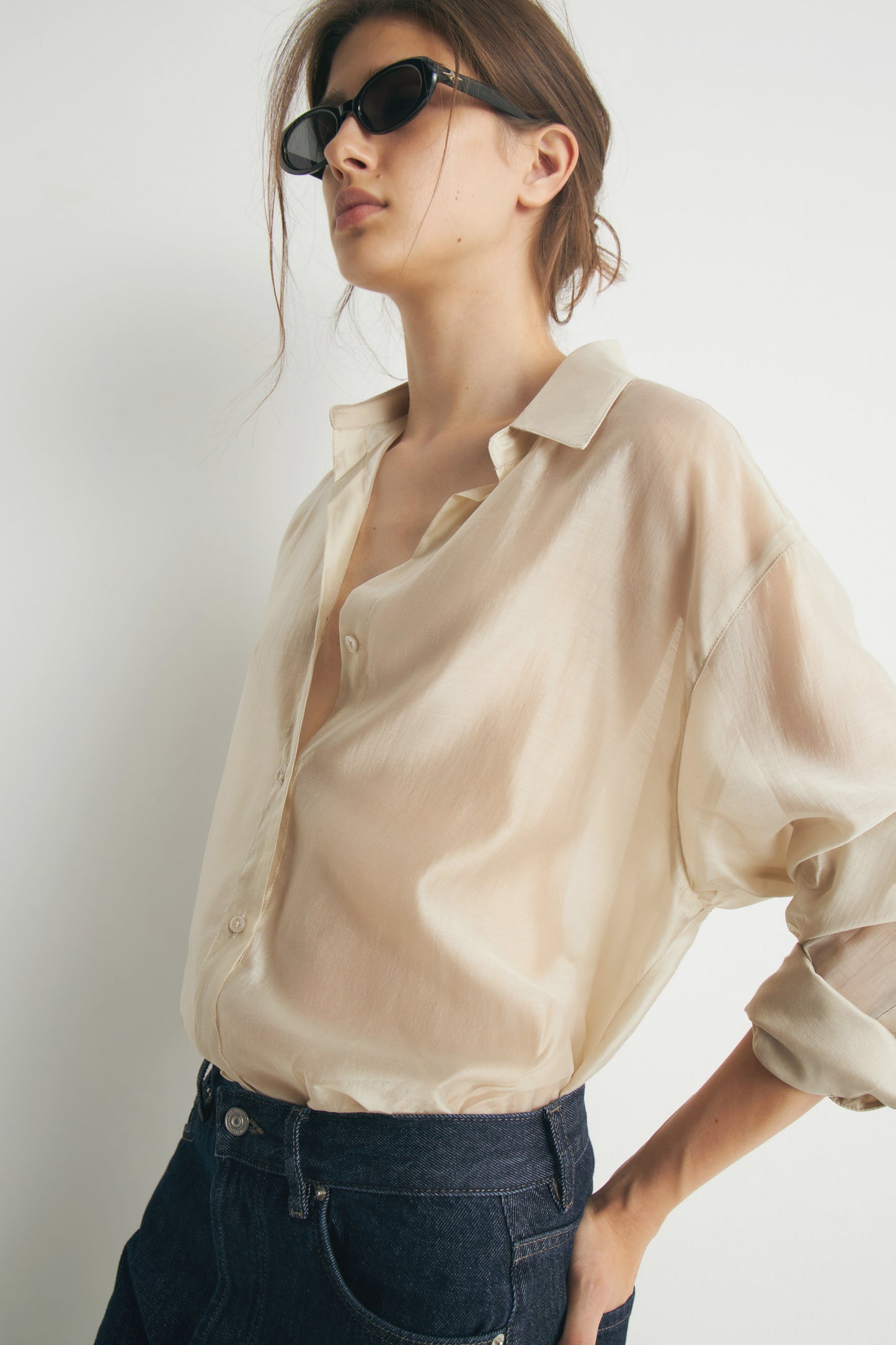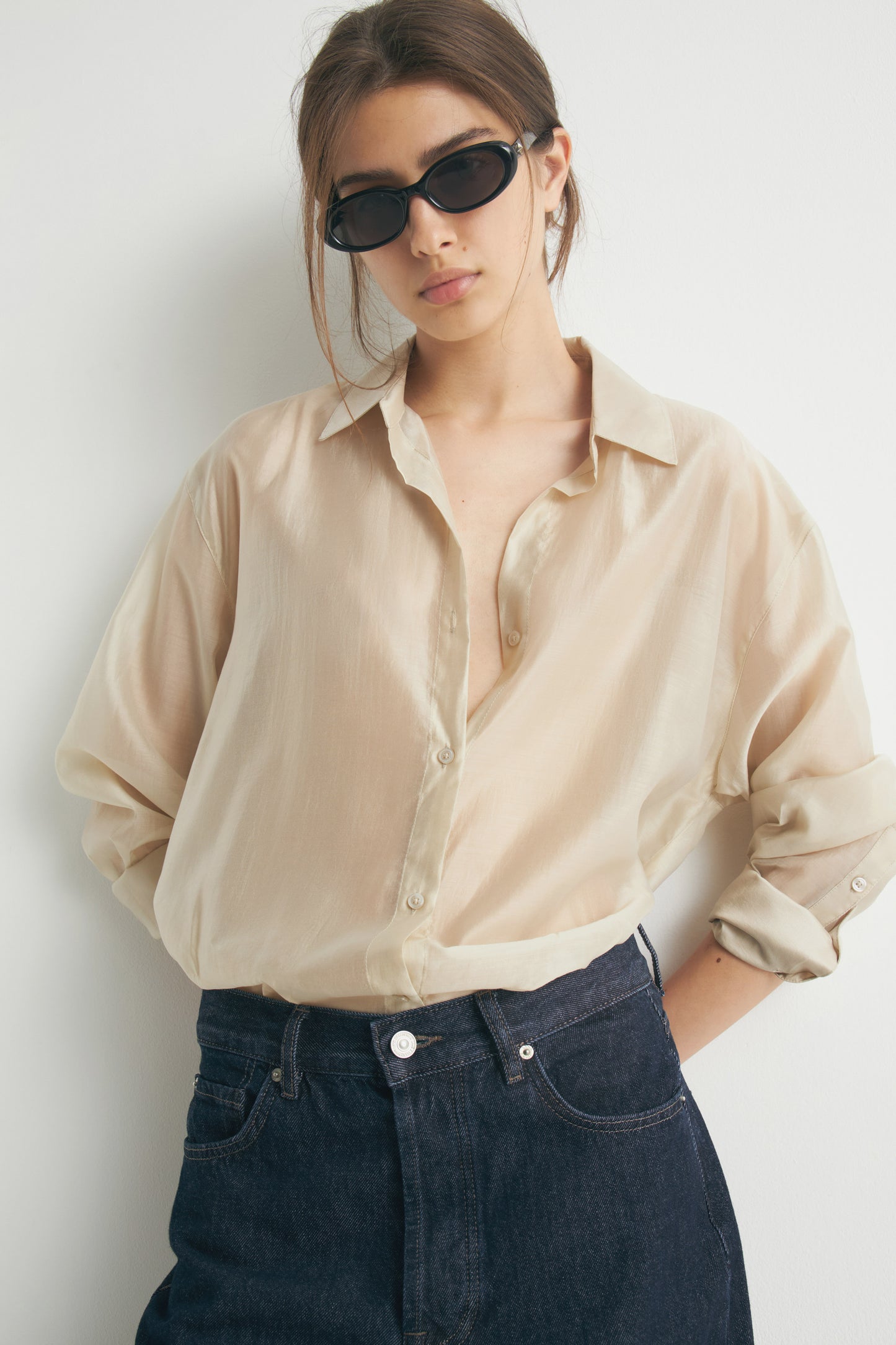 Collared oversize shirt in sheer lyocell blend. Cuffed long sleeves. Rounded hem. Button-up front.
