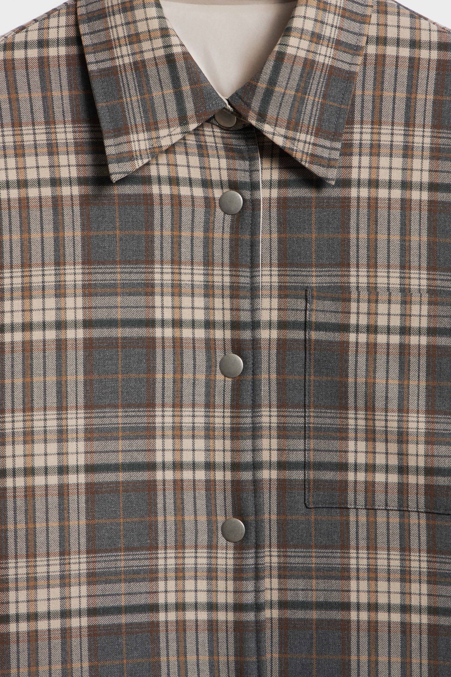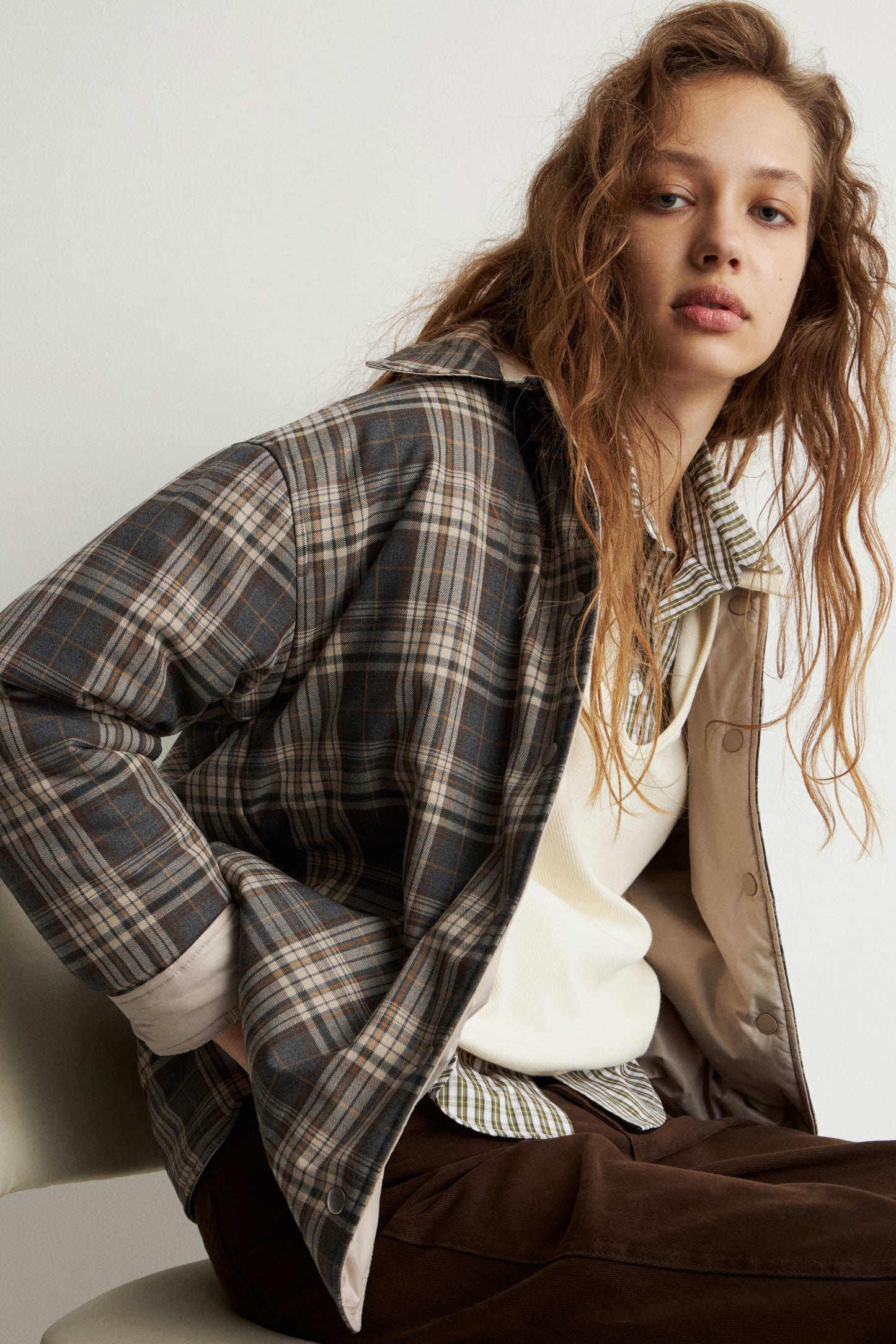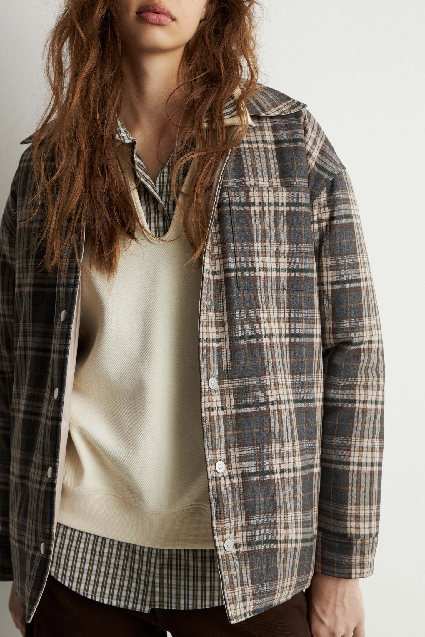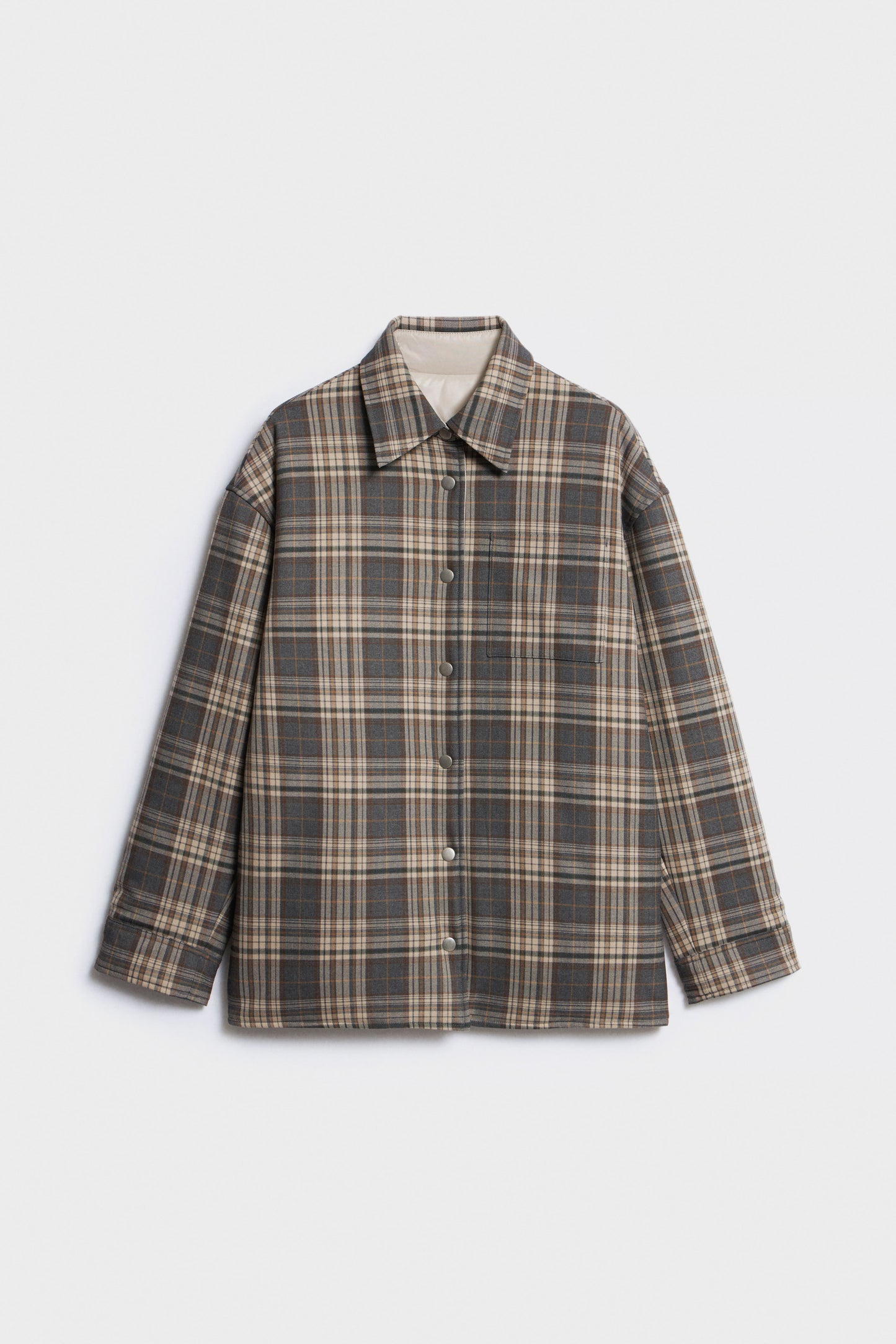 Lightly padded jacket in checked weave with a shirt collar. Patch chest pocket, long sleeves and welt front pockets. Made with padded fabric interior and lining. Press-studs down the front.