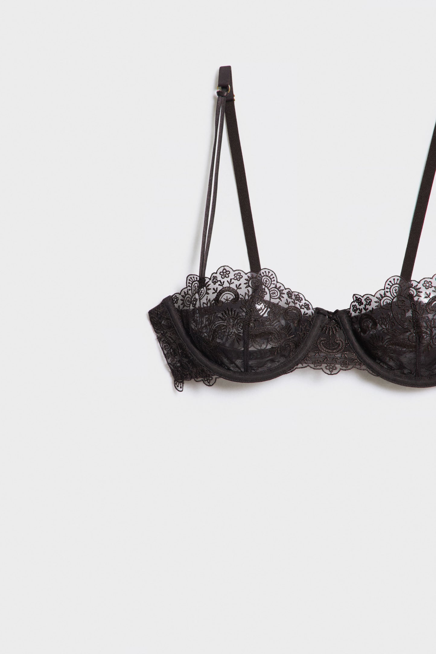 Bustier in mesh. Adjustable shoulder straps, padded, underwire cups for shaping and good support, and boning at front and sides for shaping and support. Small bow and a hook-and-eye fastening at the back.