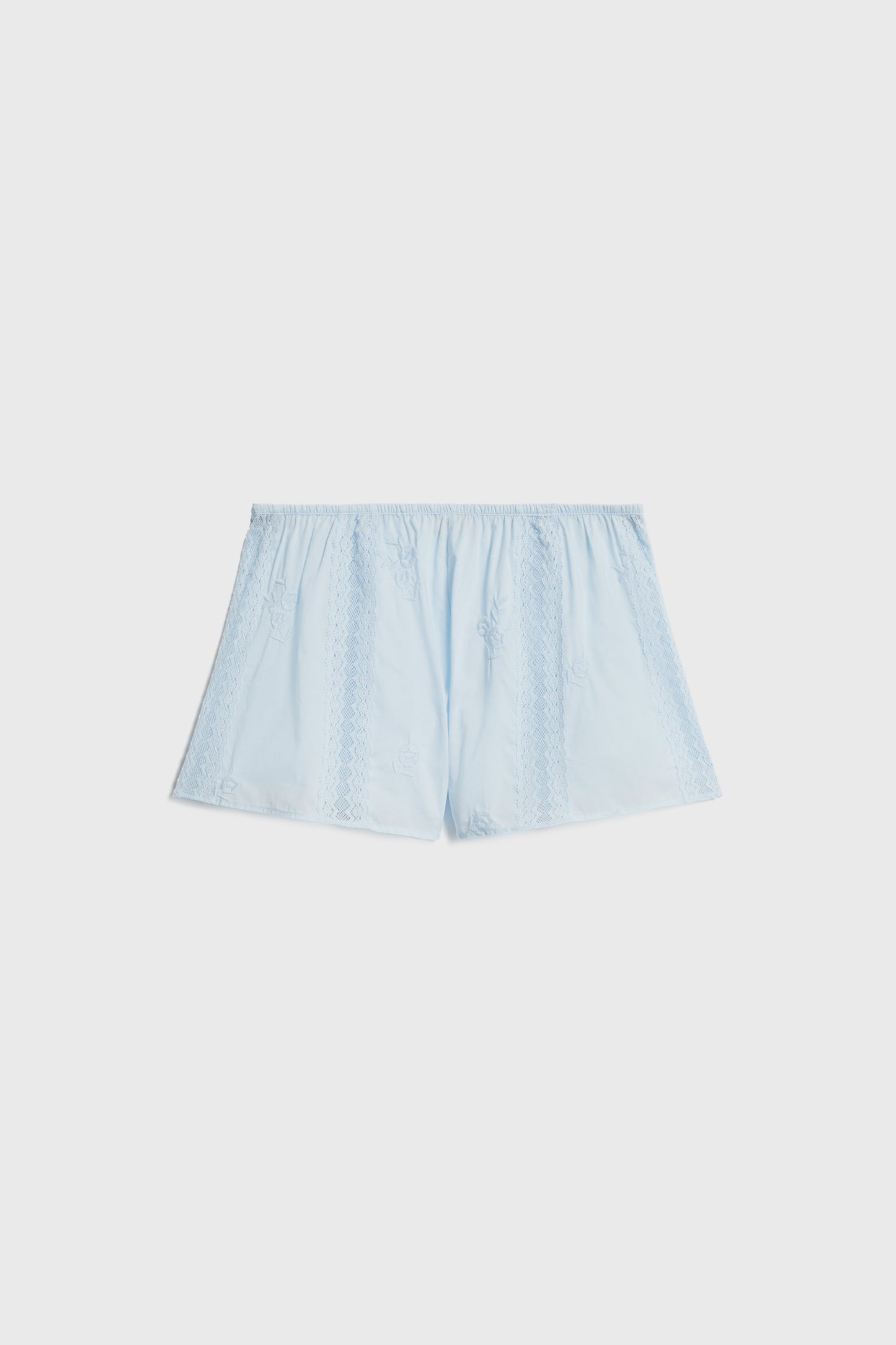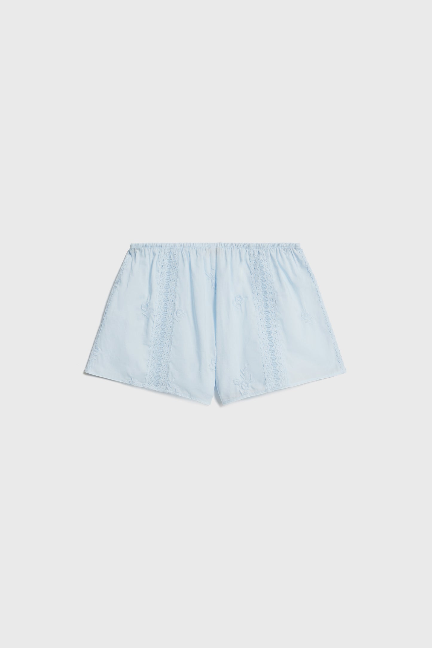 Pajama shorts in soft cotton weave with a delicate lace trim and covered elastic at waistband.