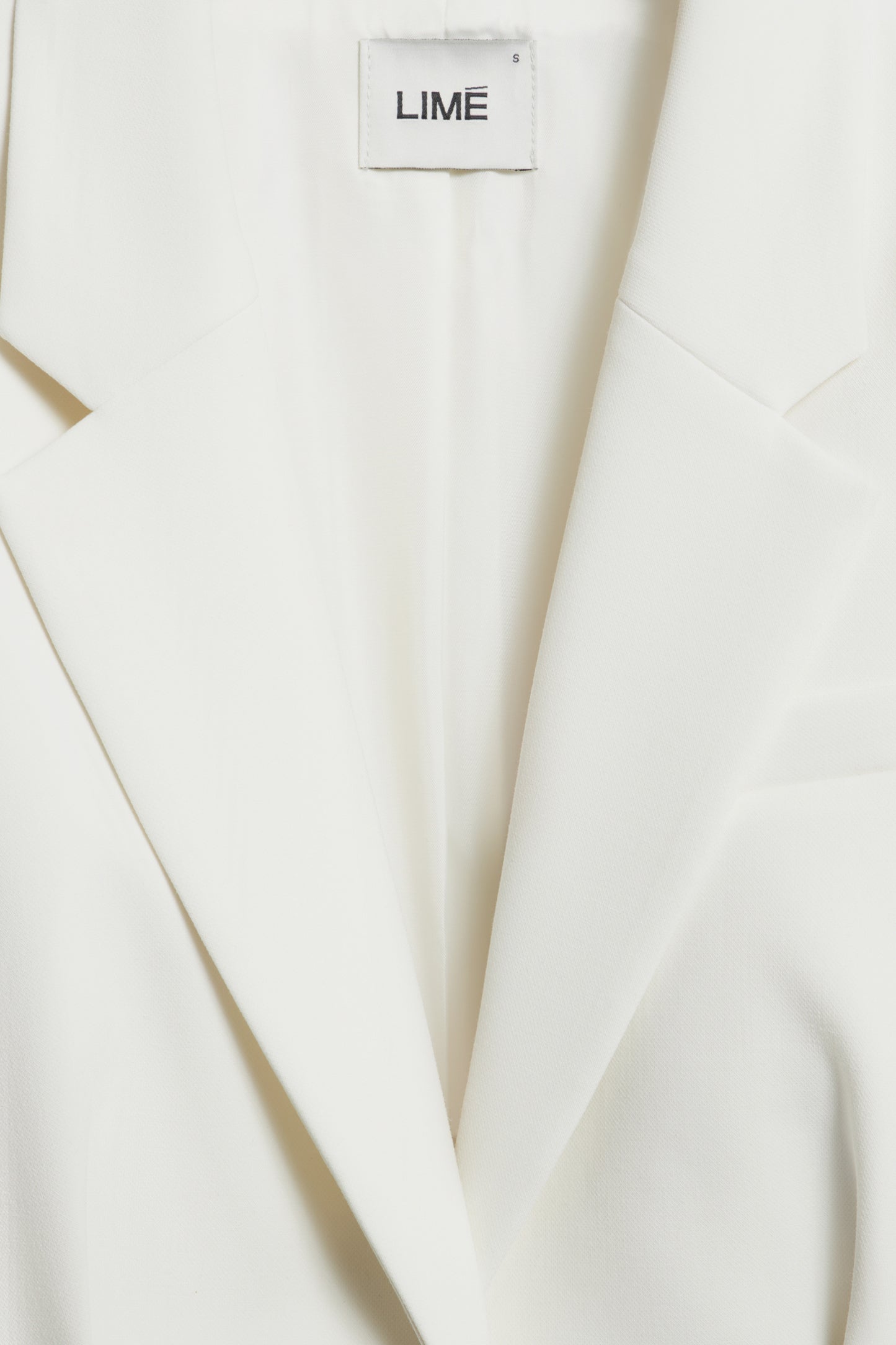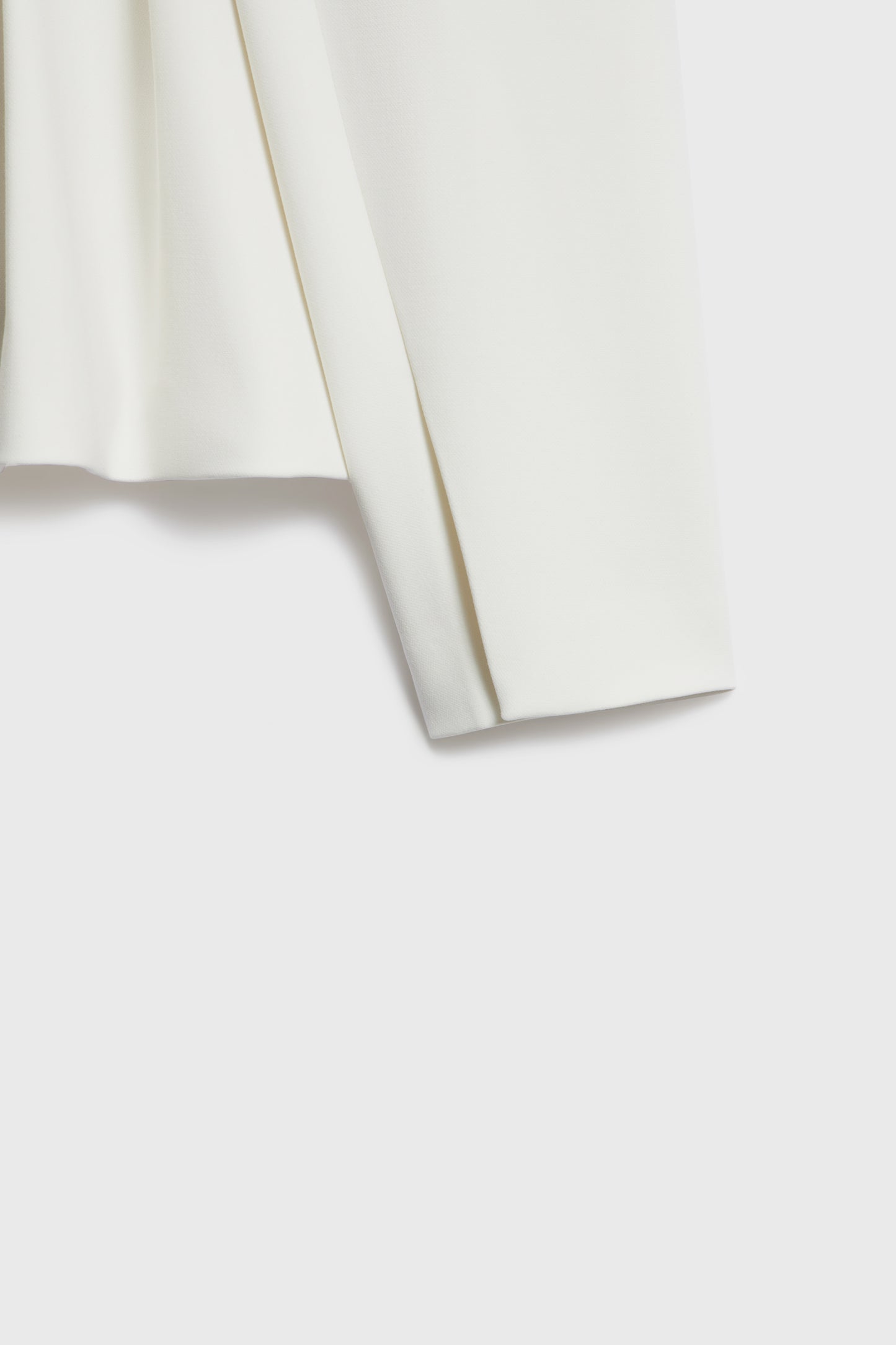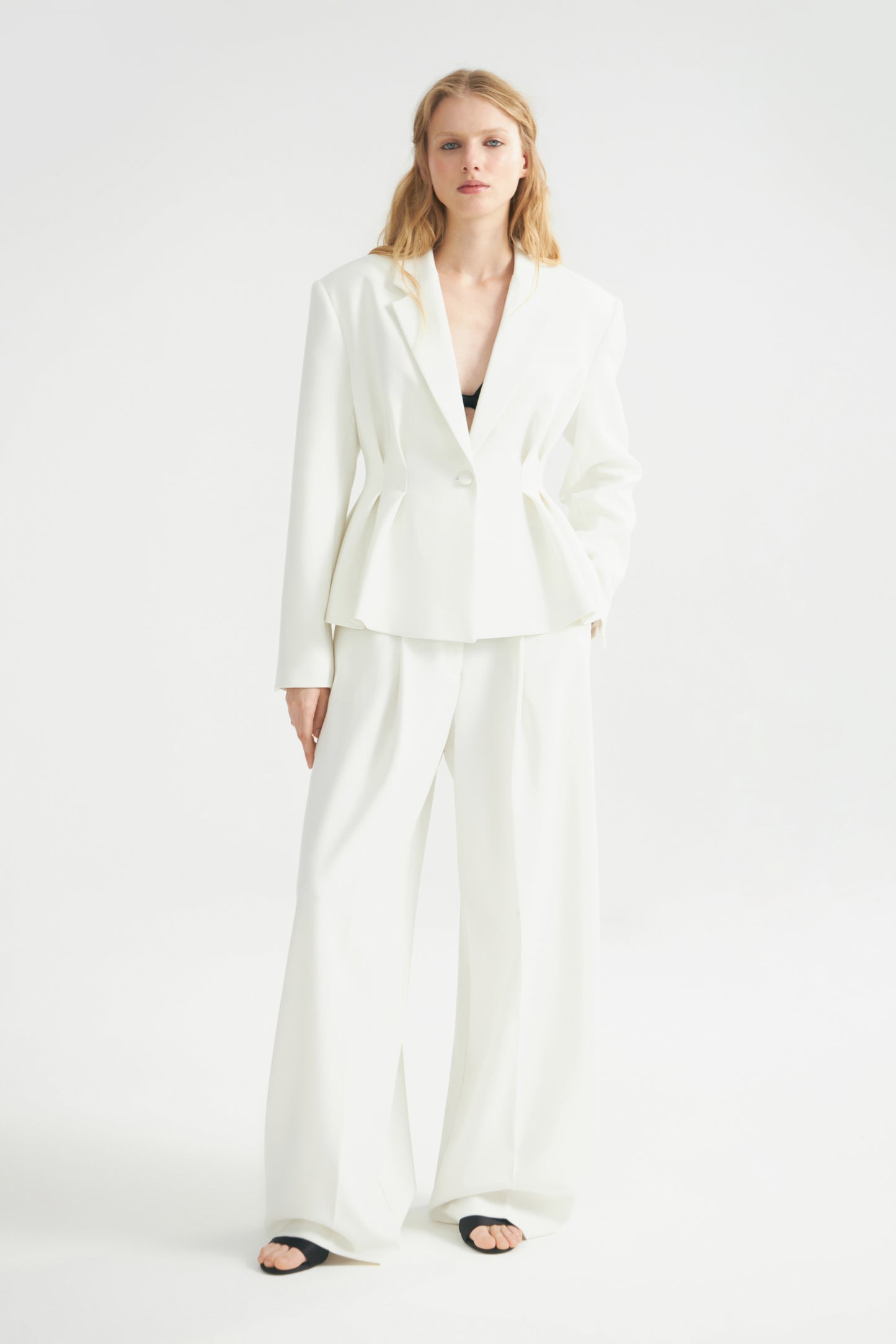 Single-breasted blazer in a soft weave with notch lapels, button at the front, welt fake pocket and box pleats around the waist creating a flared peplum. Lined.