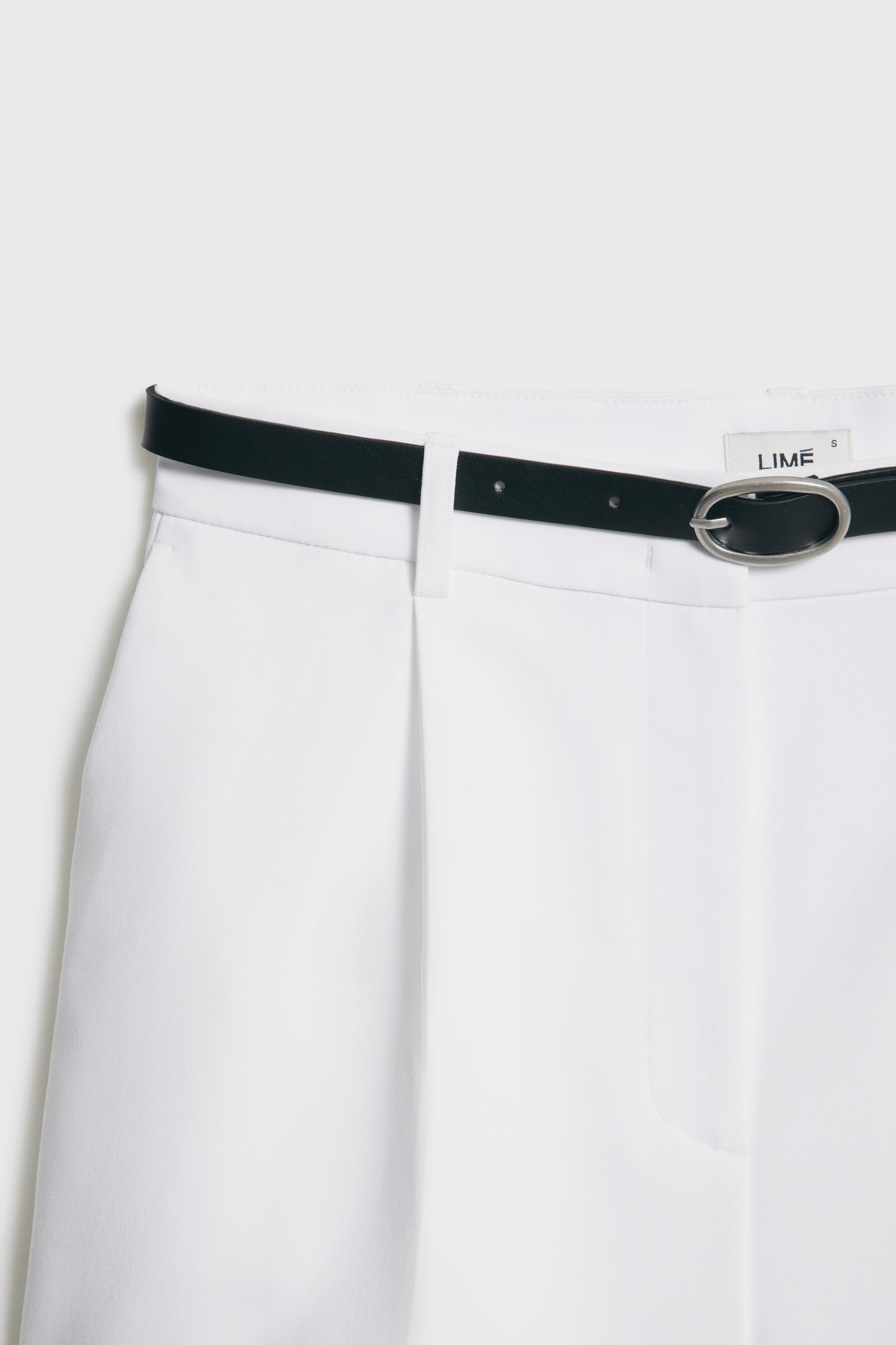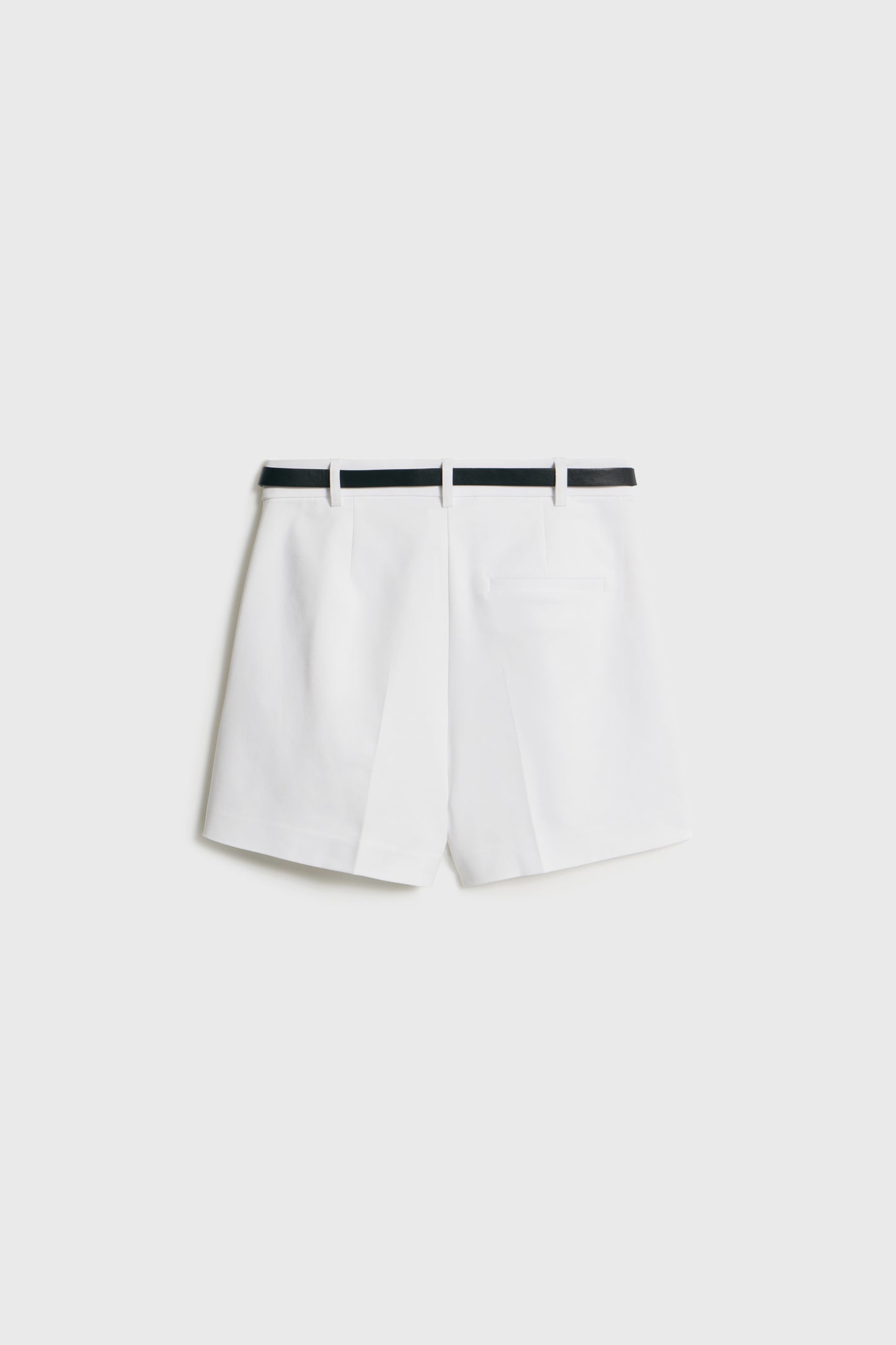 Pleated shorts with darts made of viscose blend. Straight-leg design with detachable belt. Featuring front pockets and rear welt pocket. Front zip fly, button and metal hook fastening.