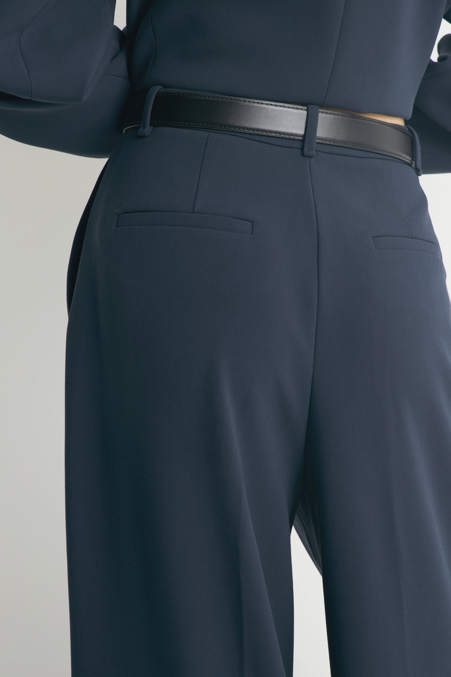 Trousers in suit fabric with darts. Wide-leg design. Featuring front pockets and rear welt pockets. Front zip fly, button and metal hook fastening.