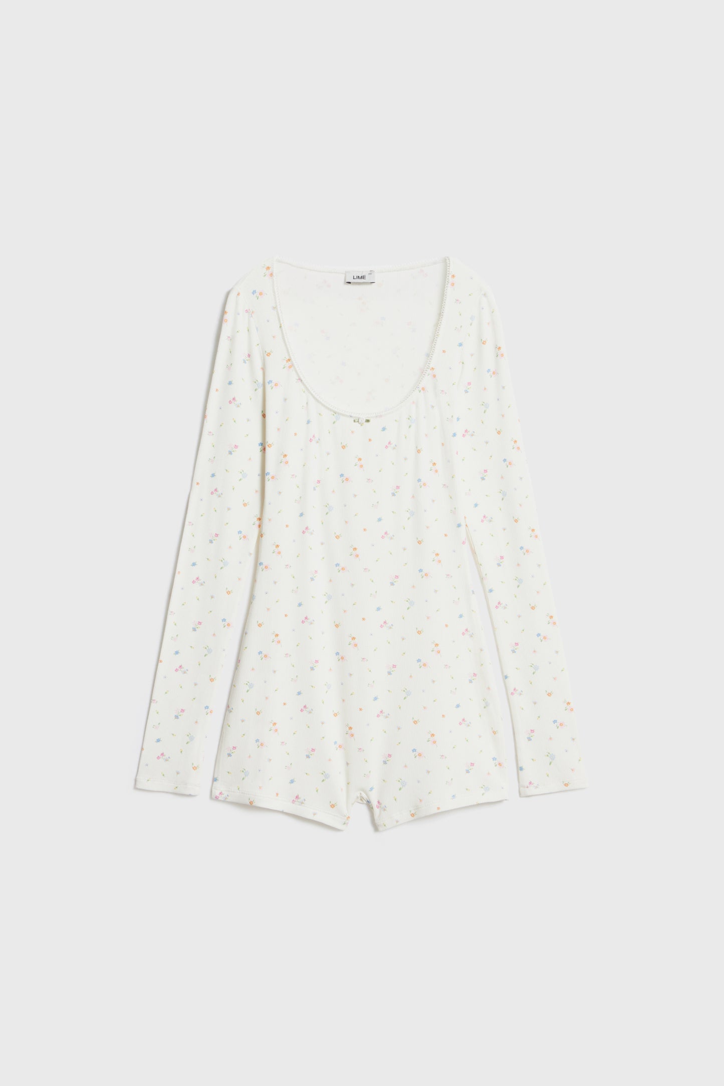 Fitted jumpsuit in soft modal jersey with a round neckline, long sleeves, short legs and a small, decorative satin rose at the front. Picot-trimmed edges.
