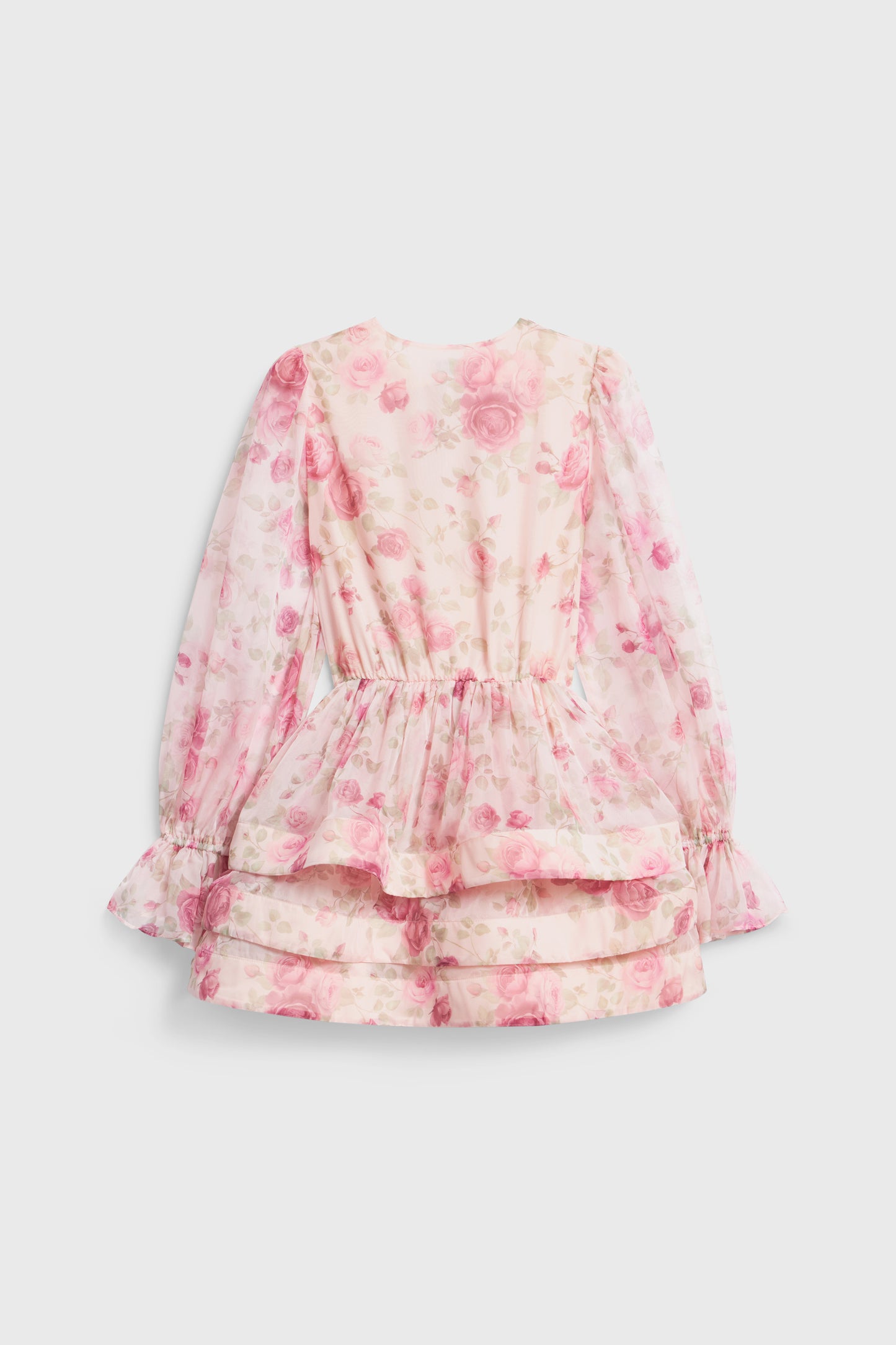 Short dress with an all-over pattern. Slim fit with a round neck, cut-out section at the front and long balloon sleeves with frilled cuffs. Decorative velvet bow on the front and wide tiered skirt for a flared hem. Lined.