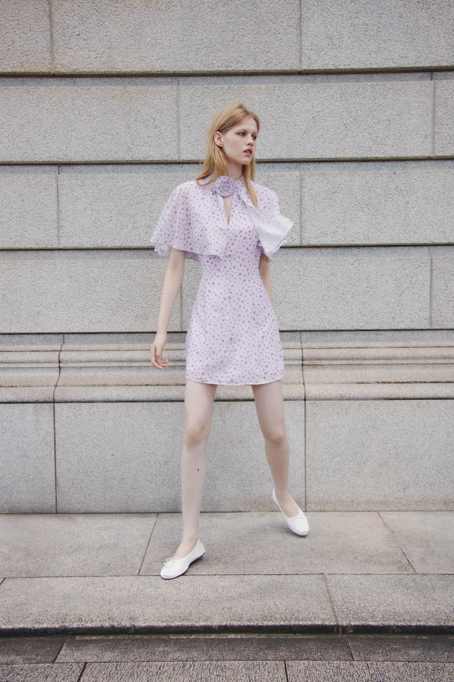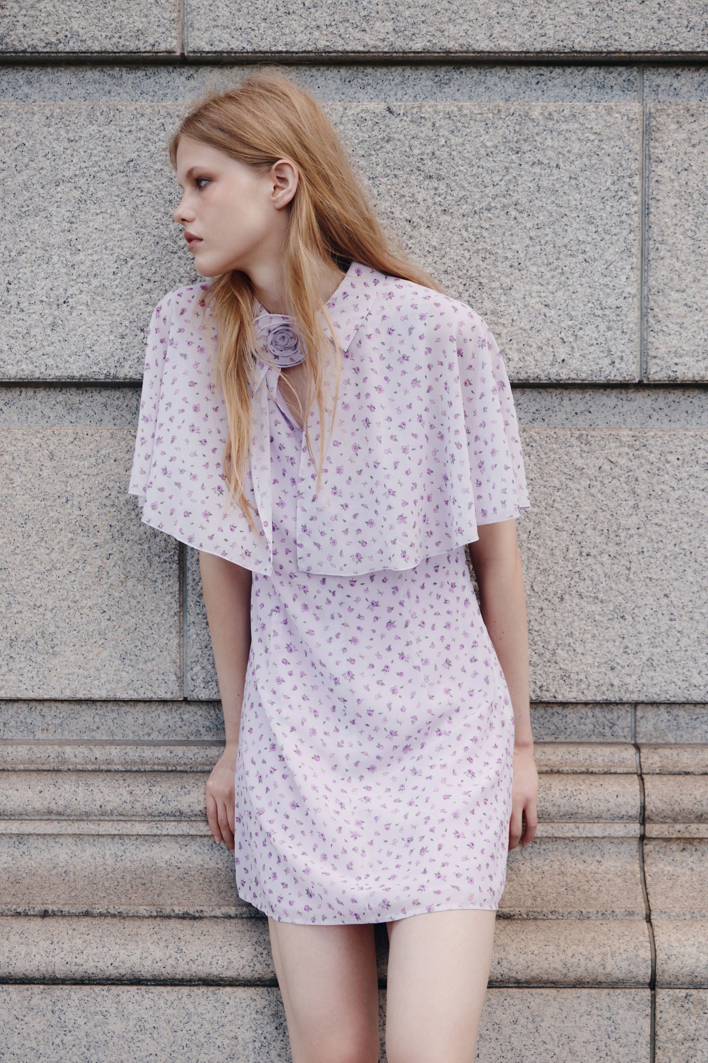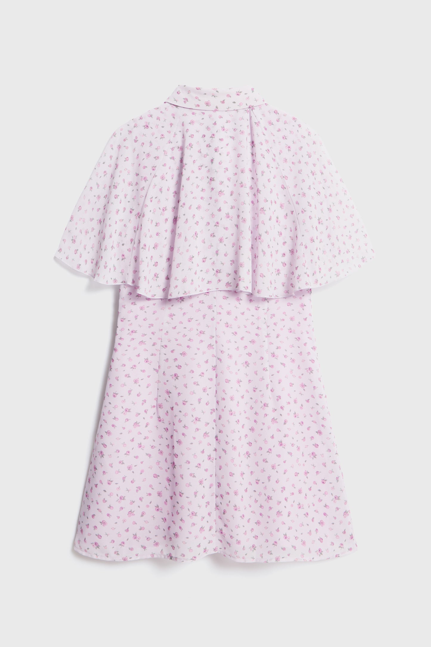 Mini dress in printed chiffon with cape and flower appliqué on the collar. Lined. Hidden zip closure at side.