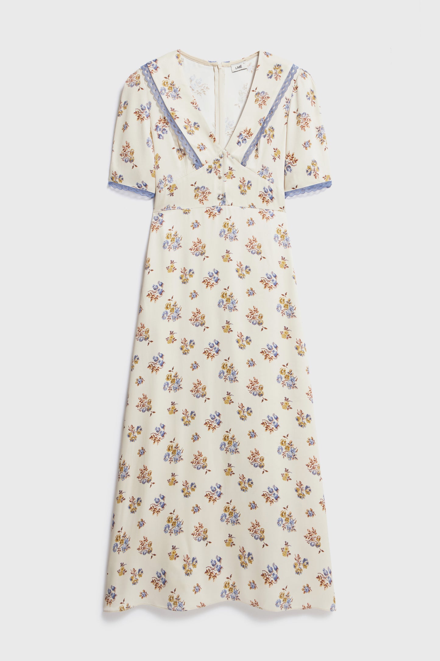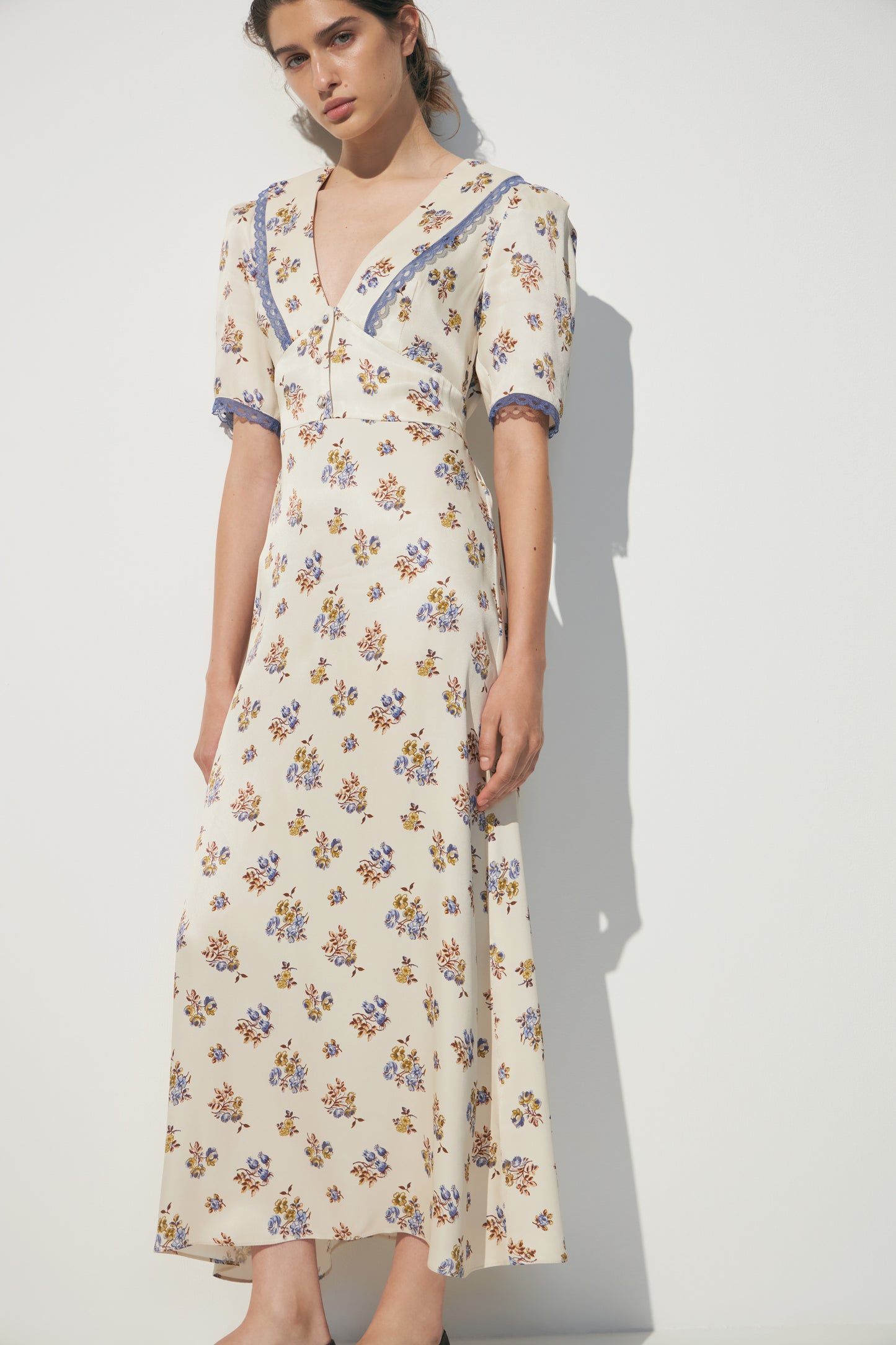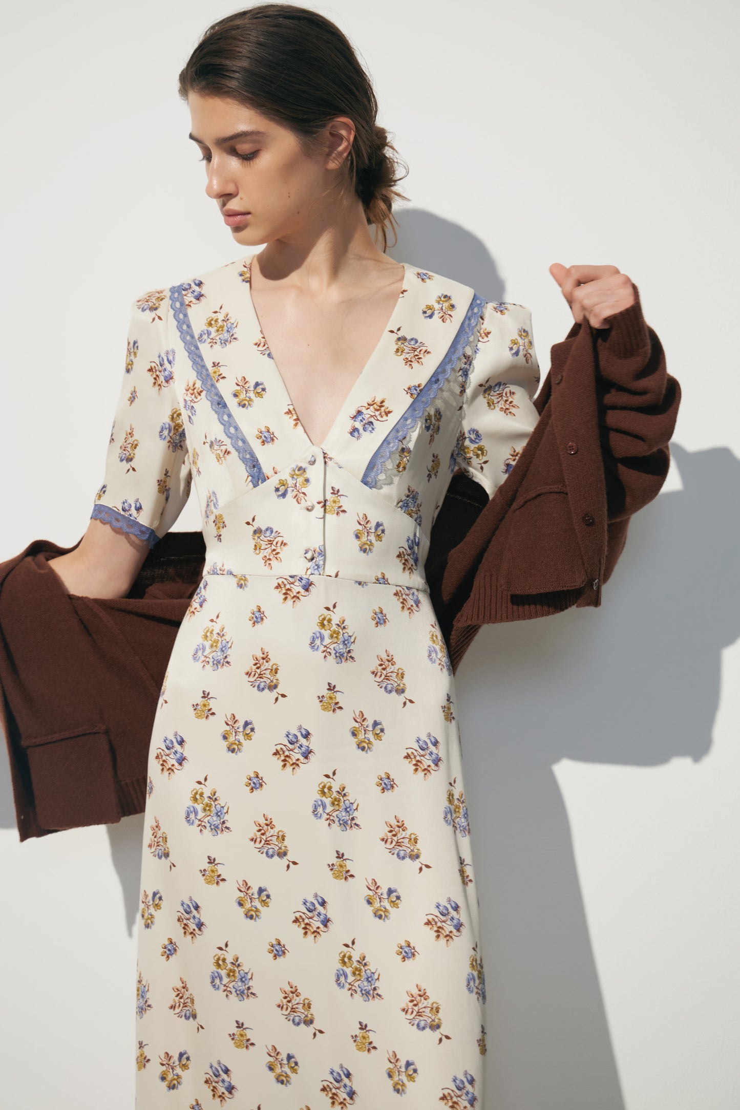 Calf-length dress in an airy, woven viscose with a printed design and braided trim. Deep V-neckline with covered buttons and back tie belt at waist. Short sleeves. A concealed zip at the back.