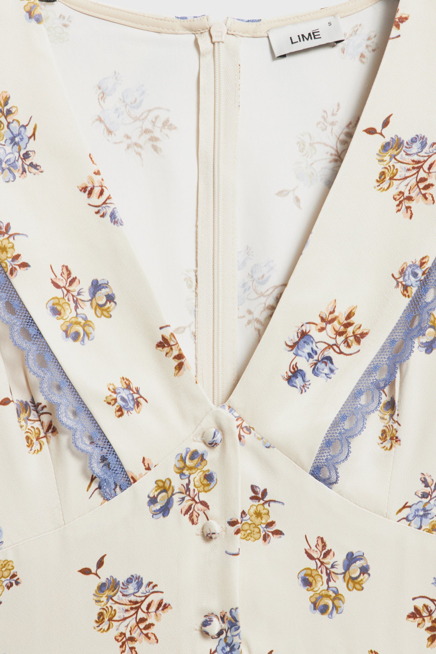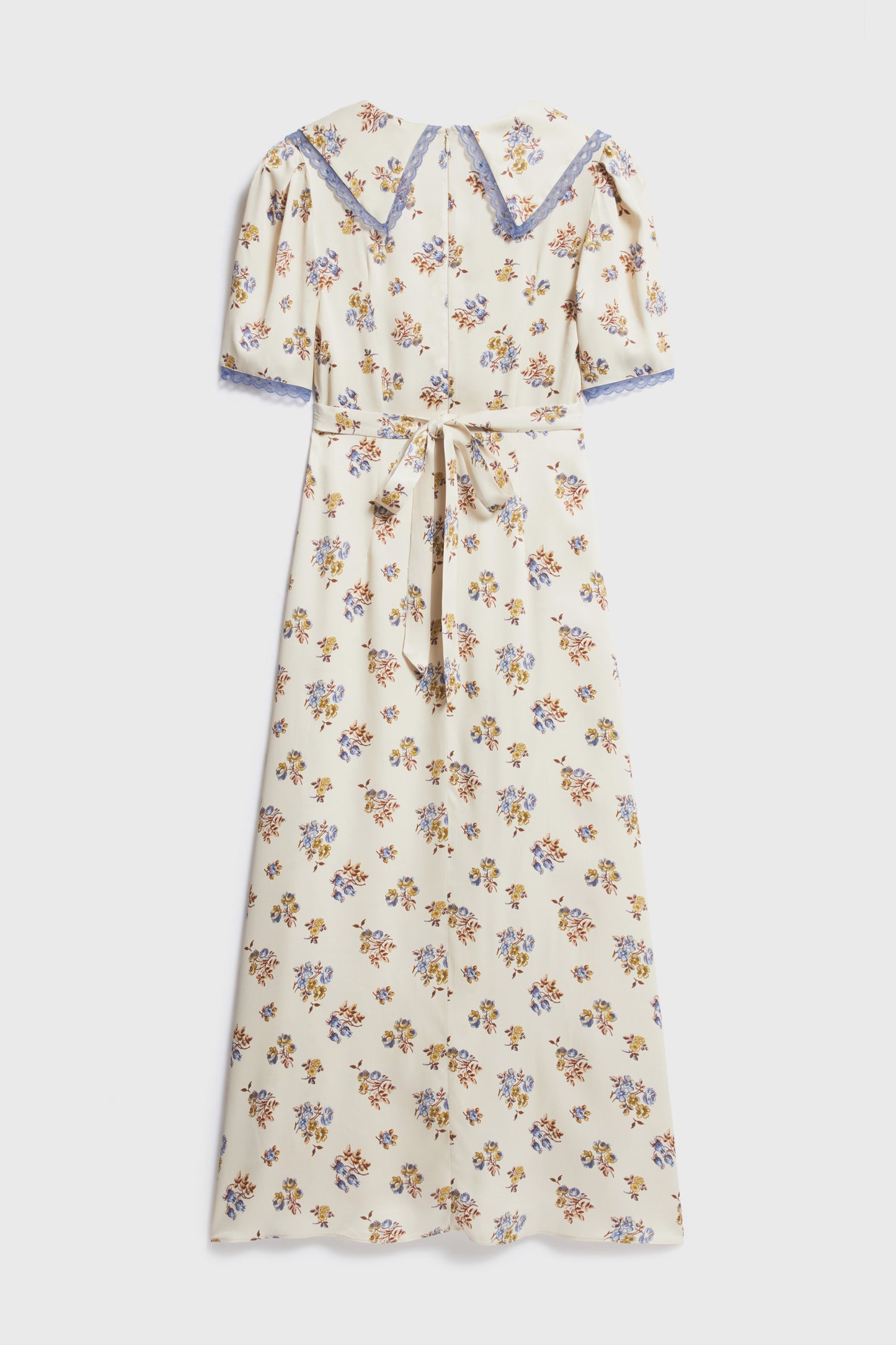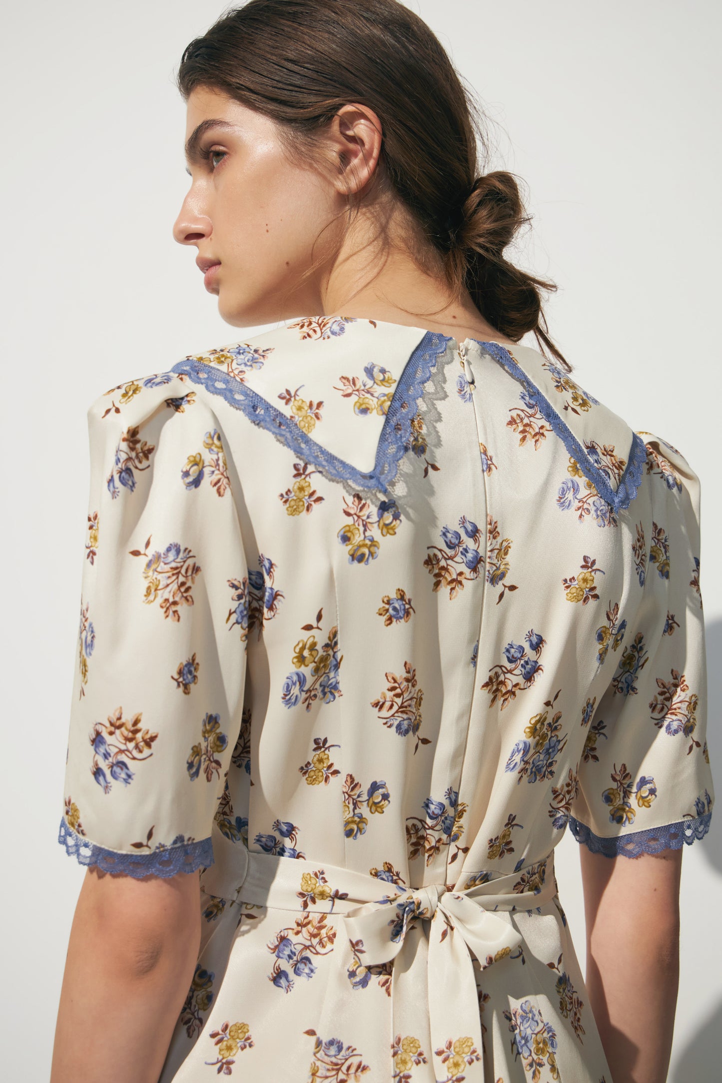 Calf-length dress in an airy, woven viscose with a printed design and braided trim. Deep V-neckline with covered buttons and back tie belt at waist. Short sleeves. A concealed zip at the back.