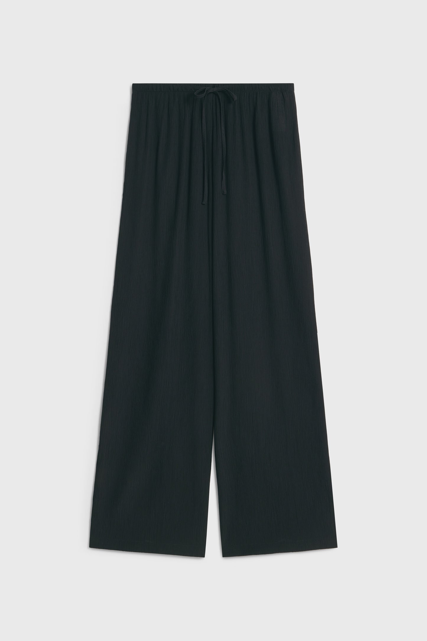 Relaxed fit trousers in a viscose weave with adjustable elastic drawstring waistband. Wrinkled effect.