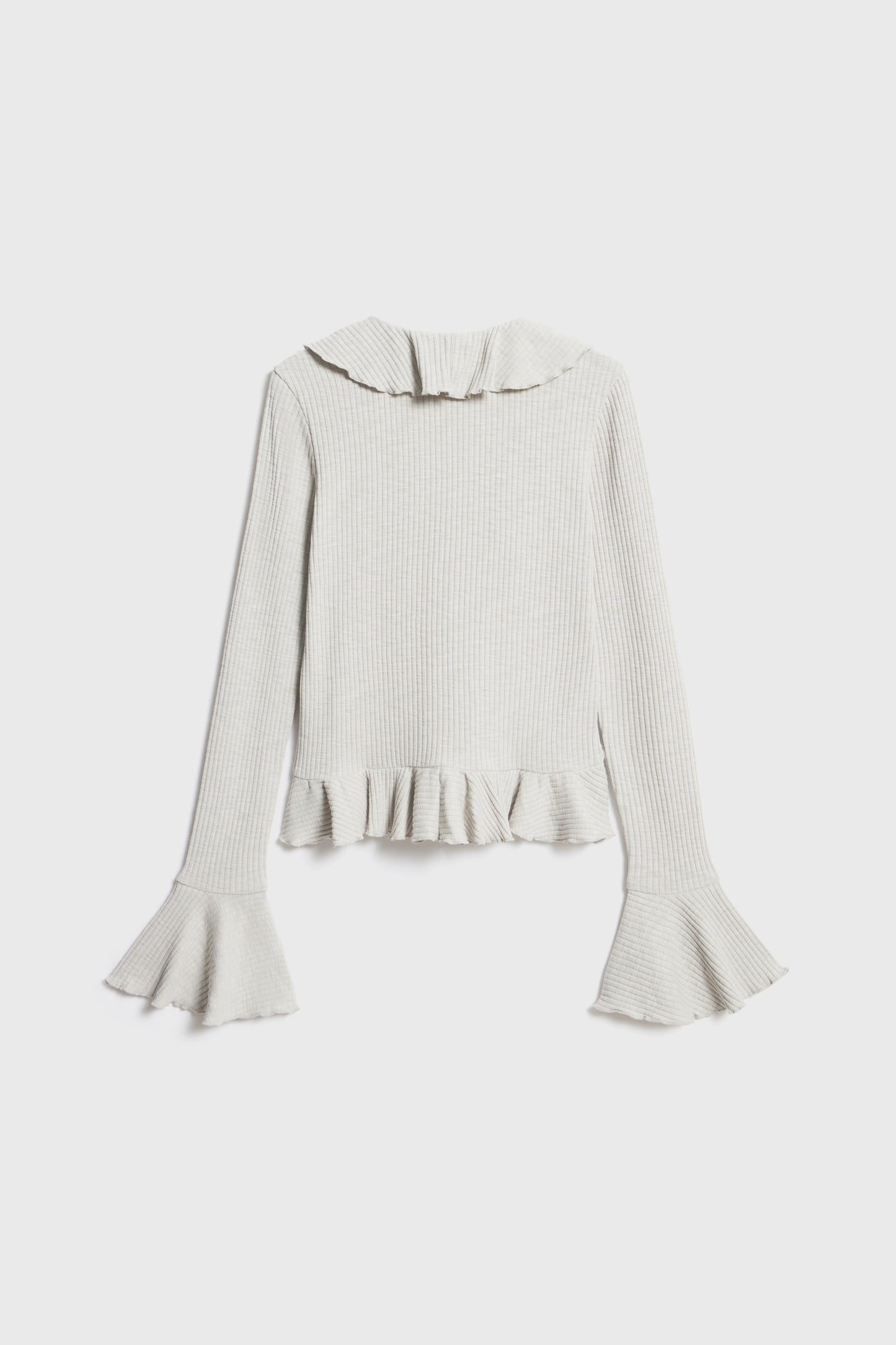 Fitted T-shirt in cotton blend with long sleeves and deep neckline. Ruffle-trimmed edges.